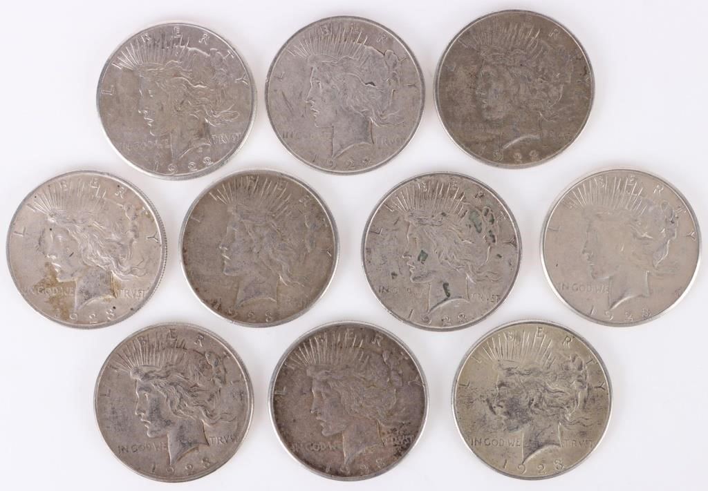 90% silver Liberty Peace Dollars to include: four 1922 P, S, and D Liberty Peace dollars, and six 1923 P, D, and S Peace Dollars.