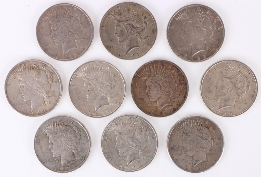 90% silver Liberty Peace Dollars to include: ten 1922 P, S, and D Liberty Peace dollars.