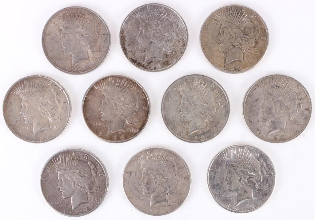 90% silver Liberty Peace Dollars to include five 1922 P, S, and D Liberty Peace dollars, one 1923 D Peace Dollars , and four 1925 S Peace Dollars.