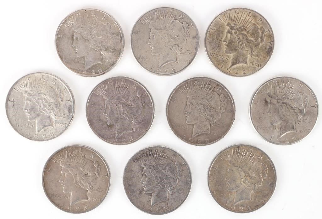 90% silver Liberty Peace Dollars to include: three 1922 P and S Liberty Peace dollars, and seven 1923 P, D, and S Peace dollars.