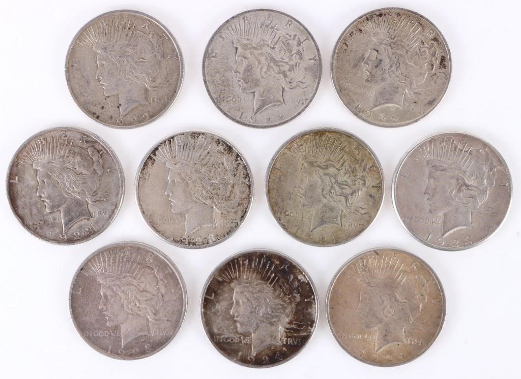 90% silver Liberty Peace Dollars to include: three 1922 Liberty Peace dollars, five 1923 S, and two 1926 peace dollars.