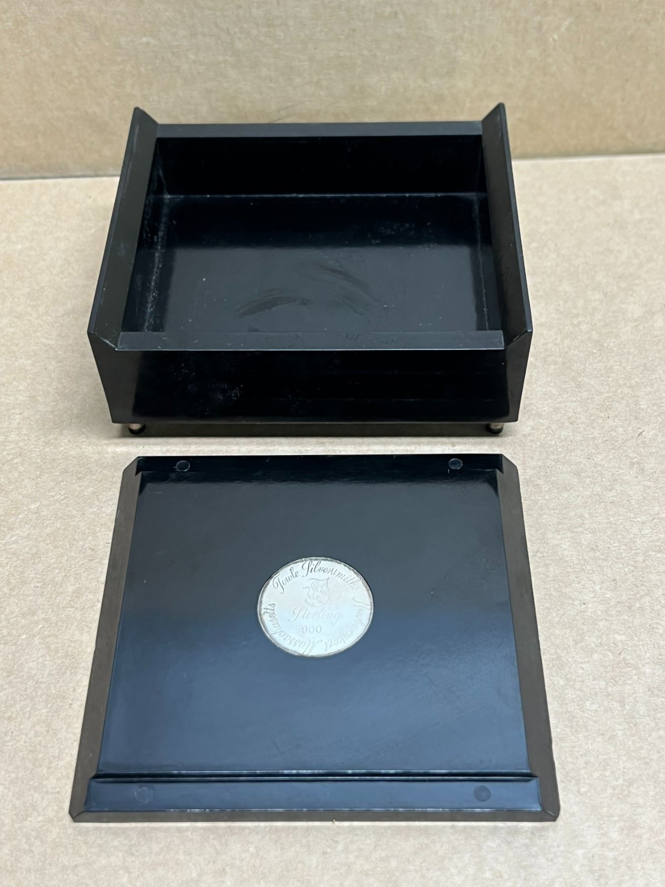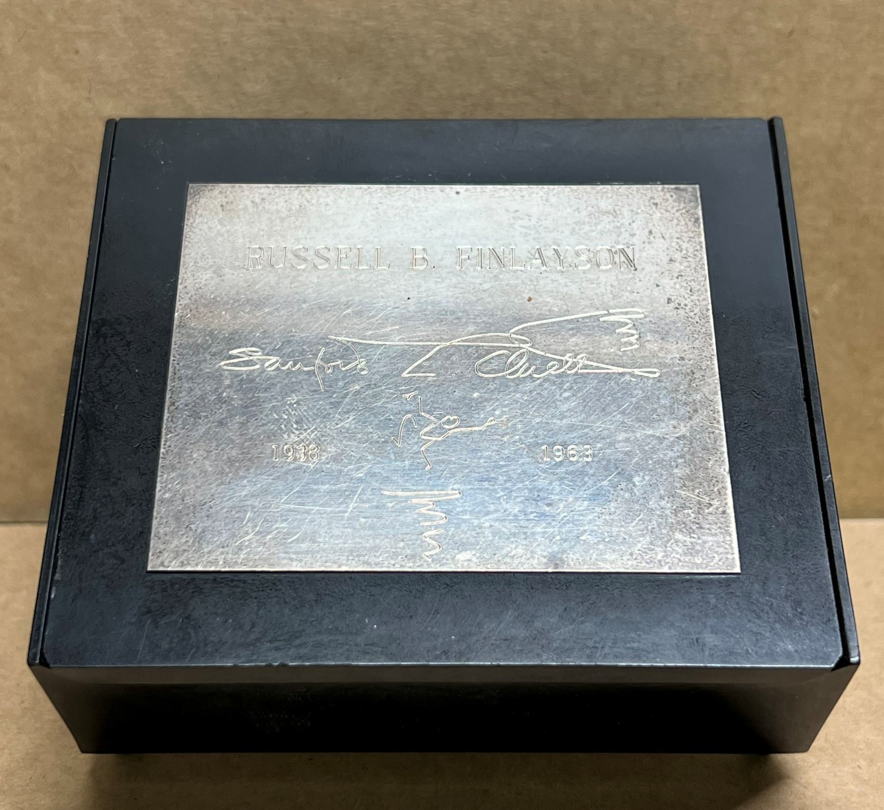 Engraved "Russell B. Finlayson" on the lid. Possible presentation gift. Please see photos. 900 Sterling Silver Towle Silversmiths Trinket Storange Box Approx: 4 x 3.5" & 1.5" tall
