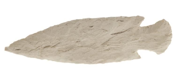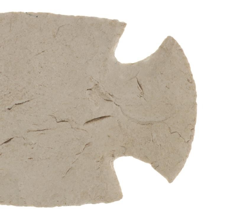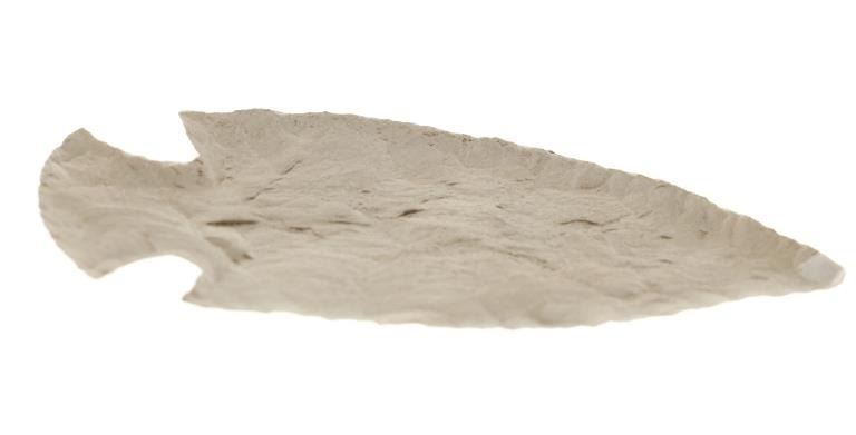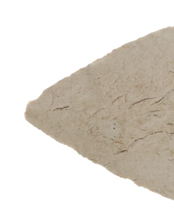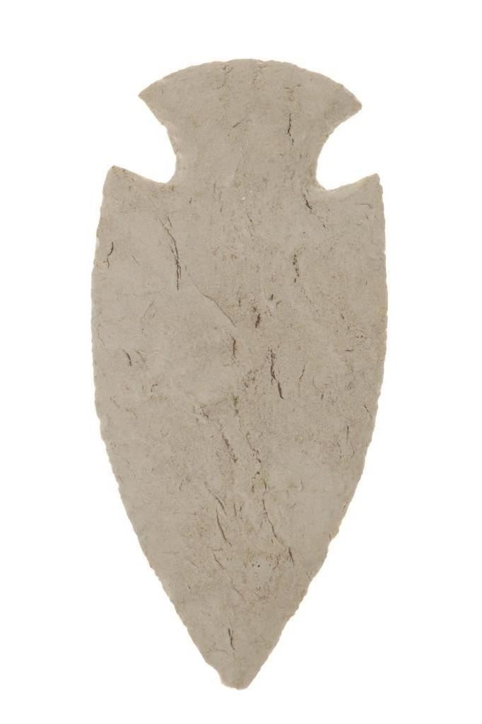 Featured in this lot is a large 6 3/4" St. Charles Dovetail spear point 9000 - 5000 B.P. The St. Charles (also known as the Dovetail or Plevna) is a medium to large point and has narrow corner or side notches which define the base or stem. The base is fan shaped and resembles the spread out tail of a dove, hence they have been known as Dovetails. The blade is triangular and has a broad wide face with excurvate edges and a lenticular cross-section when new. The spear point features a wonderfully and professionally crafted off white chert material that shows very wide serrated points with sharp shoulders, a flared stem and is professionally knapped. The overall condition of this projectile point is well preserved with no obvious signs of damage. The measurements of this point are 6 5/8"L x 3 1/8"W. The collective weight of this point is 4oz.*