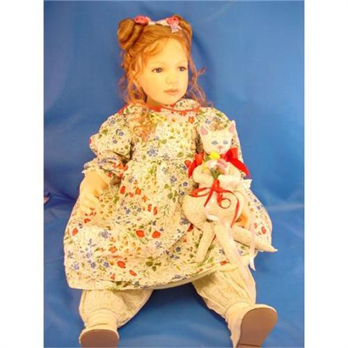 27in Shannon by Elisa Glassgold, Resin, MIB. Beautiful large 27in tall doll done in resin in a small limited edition of 200 worldwide. She has incredible detail in her face features and delicately posed hands and wears a sweet floral printed dress. She carries her 9in cloth cat.She is in mint condition and comes with certificate, original box and shipper.