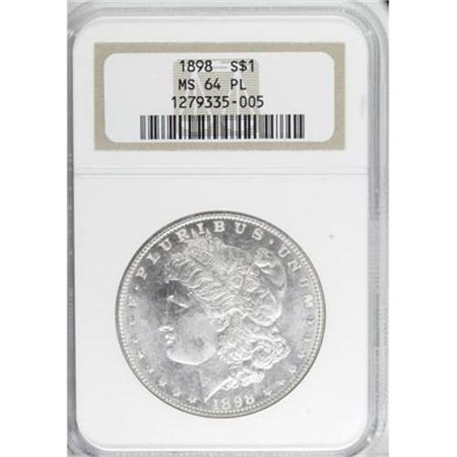 <!-- BEGIN: ICOLLECTOR - EBAY LOT HTML CODE --><style type='text/css'> #icoll_images_thumbnails, #icoll_images_mainimage, #icoll_otherlots { display: none; } div { font-family: arial, verdana, helvetica; } img { border: none; } .icoll_heading_title { background-color: #EFEFFF; color: #000; font-family: arial, verdana, helvetica; font-size: 12pt; font-style: normal; font-weight: bold; } </style><style type='text/css'>@import url(http://www.icollector.com/css/ebay/ebaylot_20070703.css);</style><script language='javascript' type='text/javascript'>function icollfunc_getelement(element_id) { var tmpelement = null; if(document.getElementById) tmpelement = document.getElementById(element_id); if(tmpelement == null) tmpelement = document[element_id]; return tmpelement; }var icollvar_mainpic = null; function icollfunc_initimages() { icollfunc_getelement('mainPicture').style.display = 'none'; icollvar_mainpic = icollfunc_getelement('icoll_images_mainimage'); var body_onload = document.body.attributes['onload']; document.body.setAttribute('onload', (body_onload ? body_onload.nodeValue : '') + 'icollfunc_fixoperaimgbug();'); }function icollfunc_changeimage(imgurl) { if(icollvar_mainpic != null) icollvar_mainpic.src = imgurl; }function icollfunc_fixoperaimgbug() { if(window.opera) { var imgobjs = icollfunc_getelement('icoll_images_thumbnails').getElementsByTagName('img'); for(var i=0; i<imgobjs.length; i++) { var w = imgobjs[i].clientWidth; if(w > 0) imgobjs[i].style.width = w + 'px'; } } }</script><script language='javascript' type='text/javascript'> var useragent = escape(navigator.userAgent); var appname = escape(navigator.appName); var dateobj = new Date(); var datetime = escape(dateobj.getFullYear()+'-'+(dateobj.getMonth()+1)+'-'+dateobj.getDate()+' '+dateobj.getHours()+':'+dateobj.getMinutes()); var referrer = ''; if(document.referrer && document.referrer != null) referrer = escape(document.referrer); new Image().src = 'http://www.icollector.com/stats/ebaylot.ashx?id=7140329&ua='+useragent+'&an='+appname+'&dt='+datetime+'&tz='+dateobj.getTimezoneOffset()+'&re='+referrer;</script><div id='icoll_images'><div id='icoll_images_prev'><a href='http://cgi.liveauctions.ebay.com/ws/eBayISAPI.dll?ViewItem&item=170135781385'><img src='http://www.ha.com/common/proxyImage.php?ebay=445-39066-1-75' alt='' /><img src='http://icollector.com/graphics/ebay_leftarrow.gif' alt='' class='arrow' /></a><div id='icoll_images_prev_info'>Prev Lot</div></div><div id='icoll_images_next'><a href='http://cgi.liveauctions.ebay.com/ws/eBayISAPI.dll?ViewItem&item=170135781397'><img src='http://www.ha.com/common/proxyImage.php?ebay=445-39043-1-75' alt='' /><img src='http://icollector.com/graphics/ebay_rightarrow.gif' alt='' class='arrow' /></a><div id='icoll_images_next_info'>Next Lot</div></div><div id='icoll_images_thumbnails'><a href='http://www.ha.com/common/proxyImage.php?ebay=445-39082-1-75' target='_blank' onmouseover="icollfunc_changeimage('http://www.ha.com/common/proxyImage.php?ebay=445-39082-1-75');"><img src='http://www.ha.com/common/proxyImage.php?ebay=445-39082-1-75' alt='' /></a><a href='http://www.ha.com/common/proxyImage.php?ebay=445-39082-2-75' target='_blank' onmouseover="icollfunc_changeimage('http://www.ha.com/common/proxyImage.php?ebay=445-39082-2-75');"><img src='http://www.ha.com/common/proxyImage.php?ebay=445-39082-2-75' alt='' /></a><div id='icoll_images_thumbnails_info'>Hover thumbnail to view large image below. Click thumbnail to view full image in new window.</div></div><div id='icoll_images_mainimage_container'><img id='icoll_images_mainimage' alt='' src='http://www.ha.com/common/proxyImage.php?ebay=445-39082-1-75'></div></div><script language='javascript' type='text/javascript'>icollfunc_initimages();</script><div id='icoll_description'><B>1898 $1 MS64 Prooflike NGC.</B></I> NGC Census: (179/76). PCGS Population (230/100). Numismedia Wsl. Price for NGC/PCGS coin in MS64: $140. (#7253)<BR><I>From The Diamond Head Collection.</B></I><BR><BR><B>Coin Engraver:</B> George T. Morgan<BR><BR><b>Shipping:</b> Coins & Currency (<a target="_blank" href="http://www.heritageauctions.com/common/shipping.php">view shipping information</a>\)</div><div id='icoll_notices'><div class='icoll_heading_left'></div><div class='icoll_heading'><div class='icoll_heading_title'>Notices</div></div><div class='icoll_heading_right'></div><div id='icoll_notices_info'><B>Important notice:</B> Heritage usually auctions material at the rate of 200-250 lots per hour. On some occasions eBay Live bid software or the Internet may not be able to keep up with the pace of the auction. We recommend placing a realistic absentee bid now as insurance to avoid disappointment. Occasionally the auctioneer may eliminate or reject an eBay Live bid, and the auctioneer may also reopen a lot after the close of the eBay live bidding (usually because we missed an audience bid), and may reject your bid even if it shows you as the winning bidder. By bidding via eBay Live, you agree that Heritage may award the lot to another bidder at its sole discretion under the circumstances described above or any other reasonable circumstances. Since eBay bids are not shown to us until we open the lot on the floor, we treat those bids just like floor bids. In most cases the floor responds before the eBay bid is presented to us, due to Internet lag time, so for consistency we have made it a policy that floor bids are always considered first over tie eBay live bids. Also please note that all Heritage lots purchased through eBay Live carry a 20% Buyer's Premium with a $9 minimum Buyer's Premium. Please make sure you read the Terms and Conditions before you bid. This lot is being auctioned in conjunction with a live floor auction by Heritage Auctions. All final auction and invoice information will be supplied by Heritage Auctions, and all other information should be considered preliminary. <BR><BR><B>Winning Notification and Billing:</B> After the FINAL session in this auc