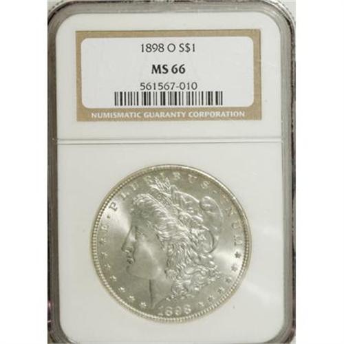 <!-- BEGIN: ICOLLECTOR - EBAY LOT HTML CODE --><style type='text/css'> #icoll_images_thumbnails, #icoll_images_mainimage, #icoll_otherlots { display: none; } div { font-family: arial, verdana, helvetica; } img { border: none; } .icoll_heading_title { background-color: #EFEFFF; color: #000; font-family: arial, verdana, helvetica; font-size: 12pt; font-style: normal; font-weight: bold; } </style><style type='text/css'>@import url(http://www.icollector.com/css/ebay/ebaylot_20070703.css);</style><script language='javascript' type='text/javascript'>function icollfunc_getelement(element_id) { var tmpelement = null; if(document.getElementById) tmpelement = document.getElementById(element_id); if(tmpelement == null) tmpelement = document[element_id]; return tmpelement; }var icollvar_mainpic = null; function icollfunc_initimages() { icollfunc_getelement('mainPicture').style.display = 'none'; icollvar_mainpic = icollfunc_getelement('icoll_images_mainimage'); var body_onload = document.body.attributes['onload']; document.body.setAttribute('onload', (body_onload ? body_onload.nodeValue : '') + 'icollfunc_fixoperaimgbug();'); }function icollfunc_changeimage(imgurl) { if(icollvar_mainpic != null) icollvar_mainpic.src = imgurl; }function icollfunc_fixoperaimgbug() { if(window.opera) { var imgobjs = icollfunc_getelement('icoll_images_thumbnails').getElementsByTagName('img'); for(var i=0; i<imgobjs.length; i++) { var w = imgobjs[i].clientWidth; if(w > 0) imgobjs[i].style.width = w + 'px'; } } }</script><script language='javascript' type='text/javascript'> var useragent = escape(navigator.userAgent); var appname = escape(navigator.appName); var dateobj = new Date(); var datetime = escape(dateobj.getFullYear()+'-'+(dateobj.getMonth()+1)+'-'+dateobj.getDate()+' '+dateobj.getHours()+':'+dateobj.getMinutes()); var referrer = ''; if(document.referrer && document.referrer != null) referrer = escape(document.referrer); new Image().src = 'http://www.icollector.com/stats/ebaylot.ashx?id=7140339&ua='+useragent+'&an='+appname+'&dt='+datetime+'&tz='+dateobj.getTimezoneOffset()+'&re='+referrer;</script><div id='icoll_images'><div id='icoll_images_prev'><a href='http://cgi.liveauctions.ebay.com/ws/eBayISAPI.dll?ViewItem&item=170135781458'><img src='http://www.ha.com/common/proxyImage.php?ebay=445-3045-1-75' alt='' /><img src='http://icollector.com/graphics/ebay_leftarrow.gif' alt='' class='arrow' /></a><div id='icoll_images_prev_info'>Prev Lot</div></div><div id='icoll_images_next'><a href='http://cgi.liveauctions.ebay.com/ws/eBayISAPI.dll?ViewItem&item=170135781482'><img src='http://www.ha.com/common/proxyImage.php?ebay=445-1671-1-75' alt='' /><img src='http://icollector.com/graphics/ebay_rightarrow.gif' alt='' class='arrow' /></a><div id='icoll_images_next_info'>Next Lot</div></div><div id='icoll_images_thumbnails'><a href='http://www.ha.com/common/proxyImage.php?ebay=445-116020-1-75' target='_blank' onmouseover="icollfunc_changeimage('http://www.ha.com/common/proxyImage.php?ebay=445-116020-1-75');"><img src='http://www.ha.com/common/proxyImage.php?ebay=445-116020-1-75' alt='' /></a><a href='http://www.ha.com/common/proxyImage.php?ebay=445-116020-2-75' target='_blank' onmouseover="icollfunc_changeimage('http://www.ha.com/common/proxyImage.php?ebay=445-116020-2-75');"><img src='http://www.ha.com/common/proxyImage.php?ebay=445-116020-2-75' alt='' /></a><div id='icoll_images_thumbnails_info'>Hover thumbnail to view large image below. Click thumbnail to view full image in new window.</div></div><div id='icoll_images_mainimage_container'><img id='icoll_images_mainimage' alt='' src='http://www.ha.com/common/proxyImage.php?ebay=445-116020-1-75'></div></div><script language='javascript' type='text/javascript'>icollfunc_initimages();</script><div id='icoll_description'><B>1898-O $1 MS66 NGC.</B></I> NGC Census: (1516/123). PCGS Population (1512/129). Mintage: 4,440,000. Numismedia Wsl. Price for NGC/PCGS coin in MS66: $300. (#7254)<BR><BR><B>Coin Engraver:</B> George T. Morgan<BR><BR><b>Shipping:</b> Coins & Currency (<a target="_blank" href="http://www.heritageauctions.com/common/shipping.php">view shipping information</a>\)</div><div id='icoll_notices'><div class='icoll_heading_left'></div><div class='icoll_heading'><div class='icoll_heading_title'>Notices</div></div><div class='icoll_heading_right'></div><div id='icoll_notices_info'><B>Important notice:</B> Heritage usually auctions material at the rate of 200-250 lots per hour. On some occasions eBay Live bid software or the Internet may not be able to keep up with the pace of the auction. We recommend placing a realistic absentee bid now as insurance to avoid disappointment. Occasionally the auctioneer may eliminate or reject an eBay Live bid, and the auctioneer may also reopen a lot after the close of the eBay live bidding (usually because we missed an audience bid), and may reject your bid even if it shows you as the winning bidder. By bidding via eBay Live, you agree that Heritage may award the lot to another bidder at its sole discretion under the circumstances described above or any other reasonable circumstances. Since eBay bids are not shown to us until we open the lot on the floor, we treat those bids just like floor bids. In most cases the floor responds before the eBay bid is presented to us, due to Internet lag time, so for consistency we have made it a policy that floor bids are always considered first over tie eBay live bids. Also please note that all Heritage lots purchased through eBay Live carry a 20% Buyer's Premium with a $9 minimum Buyer's Premium. Please make sure you read the Terms and Conditions before you bid. This lot is being auctioned in conjunction with a live floor auction by Heritage Auctions. All final auction and invoice information will be supplied by Heritage Auctions, and all other information should be considered preliminary. <BR><BR><B>Winning Notification and Billing:</B> After the FINAL session in this auction is complete, Heritage w