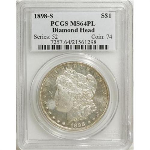 <!-- BEGIN: ICOLLECTOR - EBAY LOT HTML CODE --><style type='text/css'> #icoll_images_thumbnails, #icoll_images_mainimage, #icoll_otherlots { display: none; } div { font-family: arial, verdana, helvetica; } img { border: none; } .icoll_heading_title { background-color: #EFEFFF; color: #000; font-family: arial, verdana, helvetica; font-size: 12pt; font-style: normal; font-weight: bold; } </style><style type='text/css'>@import url(http://www.icollector.com/css/ebay/ebaylot_20070703.css);</style><script language='javascript' type='text/javascript'>function icollfunc_getelement(element_id) { var tmpelement = null; if(document.getElementById) tmpelement = document.getElementById(element_id); if(tmpelement == null) tmpelement = document[element_id]; return tmpelement; }var icollvar_mainpic = null; function icollfunc_initimages() { icollfunc_getelement('mainPicture').style.display = 'none'; icollvar_mainpic = icollfunc_getelement('icoll_images_mainimage'); var body_onload = document.body.attributes['onload']; document.body.setAttribute('onload', (body_onload ? body_onload.nodeValue : '') + 'icollfunc_fixoperaimgbug();'); }function icollfunc_changeimage(imgurl) { if(icollvar_mainpic != null) icollvar_mainpic.src = imgurl; }function icollfunc_fixoperaimgbug() { if(window.opera) { var imgobjs = icollfunc_getelement('icoll_images_thumbnails').getElementsByTagName('img'); for(var i=0; i<imgobjs.length; i++) { var w = imgobjs[i].clientWidth; if(w > 0) imgobjs[i].style.width = w + 'px'; } } }</script><script language='javascript' type='text/javascript'> var useragent = escape(navigator.userAgent); var appname = escape(navigator.appName); var dateobj = new Date(); var datetime = escape(dateobj.getFullYear()+'-'+(dateobj.getMonth()+1)+'-'+dateobj.getDate()+' '+dateobj.getHours()+':'+dateobj.getMinutes()); var referrer = ''; if(document.referrer && document.referrer != null) referrer = escape(document.referrer); new Image().src = 'http://www.icollector.com/stats/ebaylot.ashx?id=7140346&ua='+useragent+'&an='+appname+'&dt='+datetime+'&tz='+dateobj.getTimezoneOffset()+'&re='+referrer;</script><div id='icoll_images'><div id='icoll_images_prev'><a href='http://cgi.liveauctions.ebay.com/ws/eBayISAPI.dll?ViewItem&item=170135781517'><img src='http://www.ha.com/common/proxyImage.php?ebay=445-149020-1-75' alt='' /><img src='http://icollector.com/graphics/ebay_leftarrow.gif' alt='' class='arrow' /></a><div id='icoll_images_prev_info'>Prev Lot</div></div><div id='icoll_images_next'><a href='http://cgi.liveauctions.ebay.com/ws/eBayISAPI.dll?ViewItem&item=170135058374'><img src='http://www.ha.com/common/proxyImage.php?ebay=445-3029-1-75' alt='' /><img src='http://icollector.com/graphics/ebay_rightarrow.gif' alt='' class='arrow' /></a><div id='icoll_images_next_info'>Next Lot</div></div><div id='icoll_images_thumbnails'><a href='http://www.ha.com/common/proxyImage.php?ebay=445-39076-1-75' target='_blank' onmouseover="icollfunc_changeimage('http://www.ha.com/common/proxyImage.php?ebay=445-39076-1-75');"><img src='http://www.ha.com/common/proxyImage.php?ebay=445-39076-1-75' alt='' /></a><a href='http://www.ha.com/common/proxyImage.php?ebay=445-39076-2-75' target='_blank' onmouseover="icollfunc_changeimage('http://www.ha.com/common/proxyImage.php?ebay=445-39076-2-75');"><img src='http://www.ha.com/common/proxyImage.php?ebay=445-39076-2-75' alt='' /></a><div id='icoll_images_thumbnails_info'>Hover thumbnail to view large image below. Click thumbnail to view full image in new window.</div></div><div id='icoll_images_mainimage_container'><img id='icoll_images_mainimage' alt='' src='http://www.ha.com/common/proxyImage.php?ebay=445-39076-1-75'></div></div><script language='javascript' type='text/javascript'>icollfunc_initimages();</script><div id='icoll_description'><B>1898-S $1 MS64 Prooflike PCGS.</B></I> Ex: Diamond Head. PCGS Population (35/5). NGC Census: (21/7). Numismedia Wsl. Price for NGC/PCGS coin in MS64: $595. (#7257)<BR><I>From The Diamond Head Registry Set of Prooflike Dollars.</B></I><BR><BR><B>Coin Engraver:</B> George T. Morgan<BR><BR><b>Shipping:</b> Coins & Currency (<a target="_blank" href="http://www.heritageauctions.com/common/shipping.php">view shipping information</a>\)</div><div id='icoll_notices'><div class='icoll_heading_left'></div><div class='icoll_heading'><div class='icoll_heading_title'>Notices</div></div><div class='icoll_heading_right'></div><div id='icoll_notices_info'><B>Important notice:</B> Heritage usually auctions material at the rate of 200-250 lots per hour. On some occasions eBay Live bid software or the Internet may not be able to keep up with the pace of the auction. We recommend placing a realistic absentee bid now as insurance to avoid disappointment. Occasionally the auctioneer may eliminate or reject an eBay Live bid, and the auctioneer may also reopen a lot after the close of the eBay live bidding (usually because we missed an audience bid), and may reject your bid even if it shows you as the winning bidder. By bidding via eBay Live, you agree that Heritage may award the lot to another bidder at its sole discretion under the circumstances described above or any other reasonable circumstances. Since eBay bids are not shown to us until we open the lot on the floor, we treat those bids just like floor bids. In most cases the floor responds before the eBay bid is presented to us, due to Internet lag time, so for consistency we have made it a policy that floor bids are always considered first over tie eBay live bids. Also please note that all Heritage lots purchased through eBay Live carry a 20% Buyer's Premium with a $9 minimum Buyer's Premium. Please make sure you read the Terms and Conditions before you bid. This lot is being auctioned in conjunction with a live floor auction by Heritage Auctions. All final auction and invoice information will be supplied by Heritage Auctions, and all other information should be considered preliminary. <BR><BR><B>Winning Notification and Billing:<