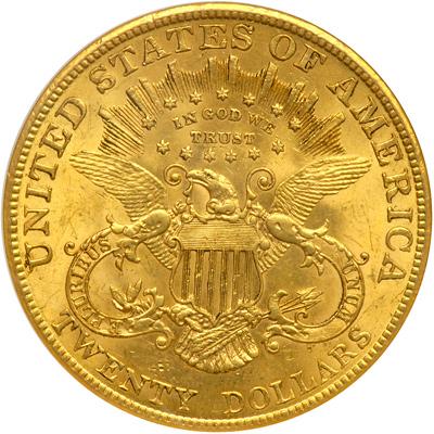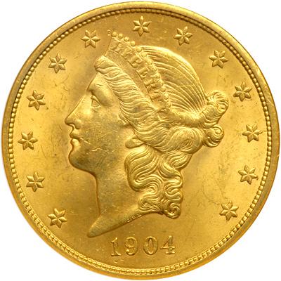 1904 $20. NGC graded MS-63. Lightly toned over lovely frosty surfaces.