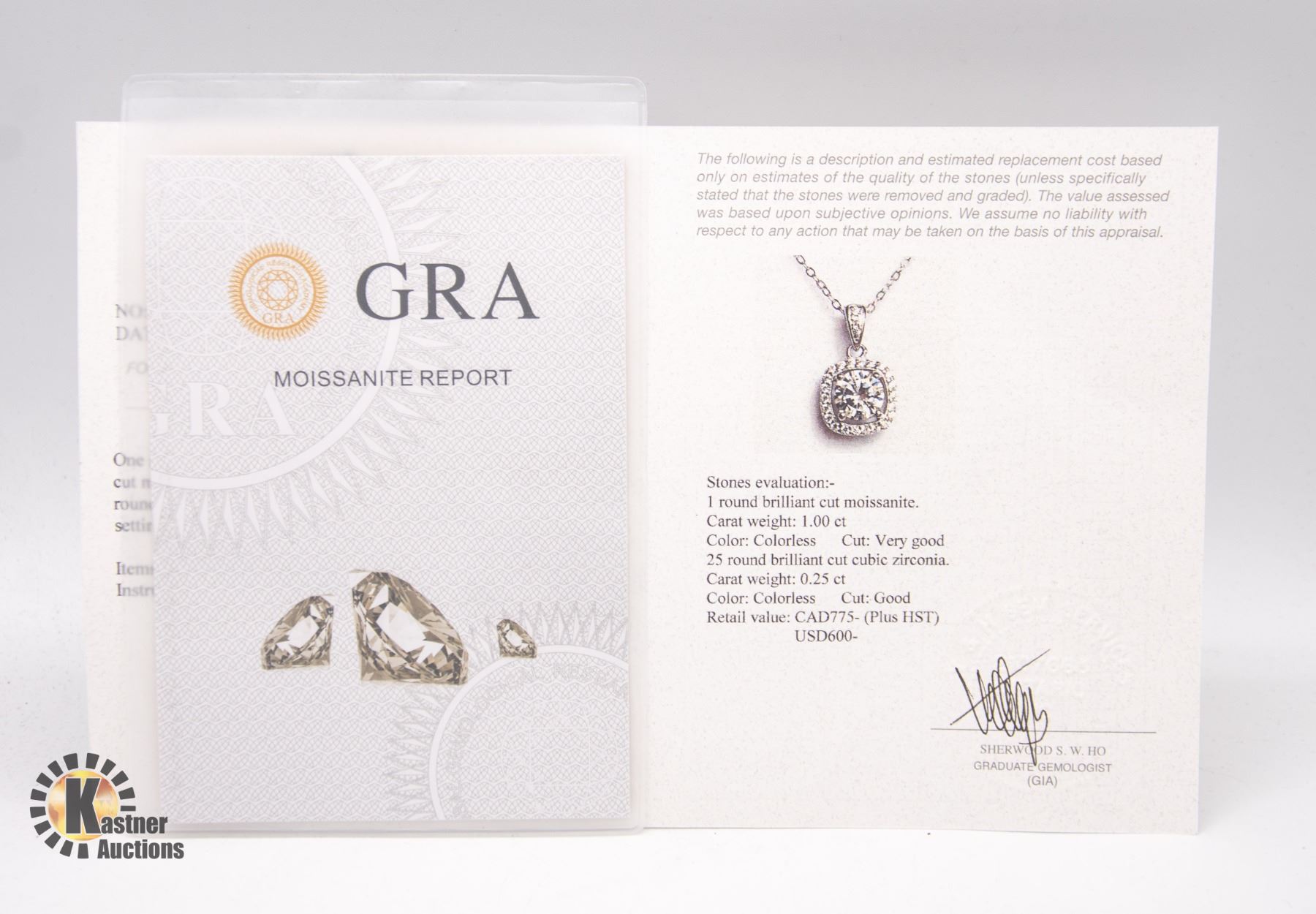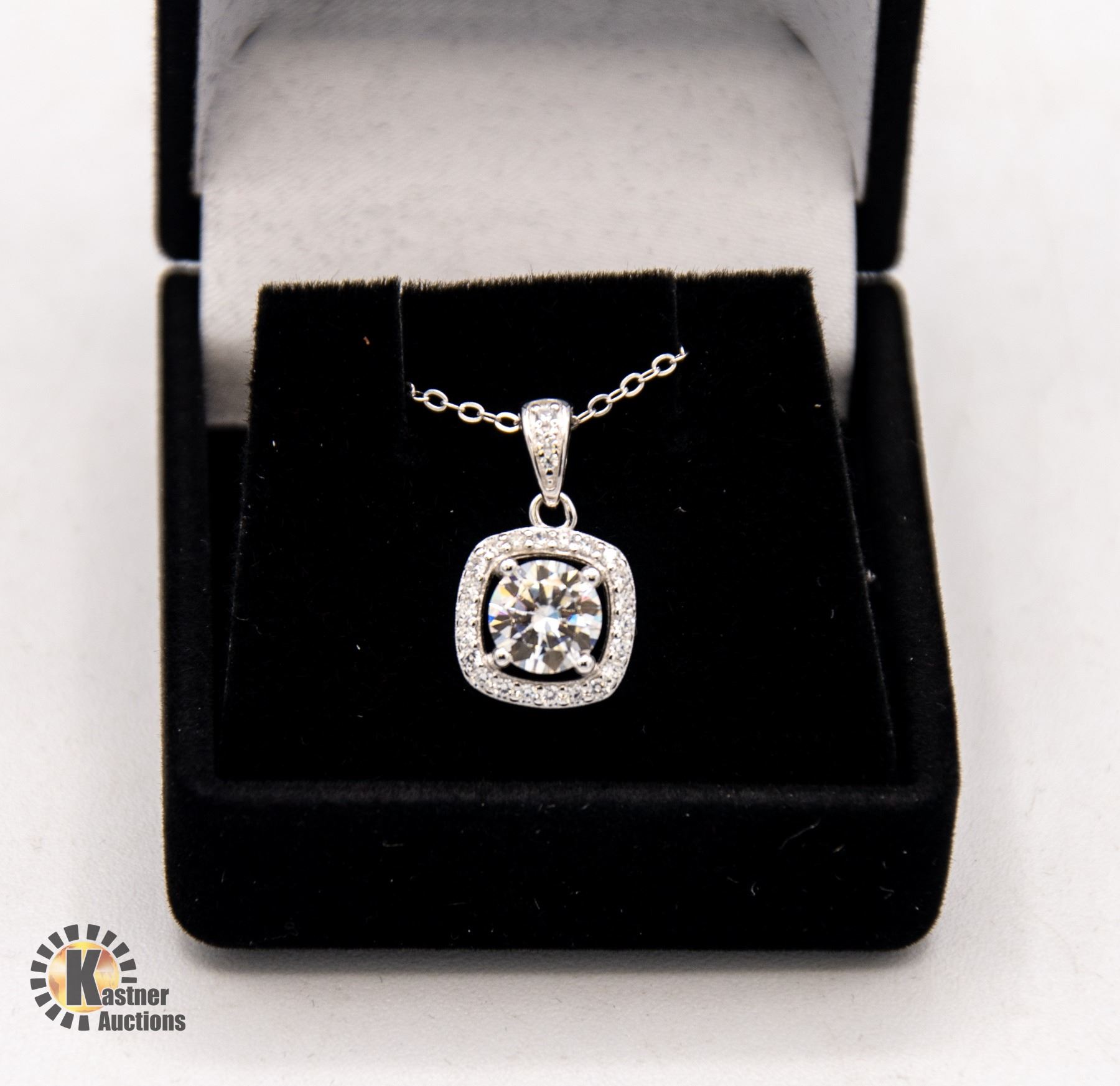 MOISSANITE VVS D COLOR SURROUNDED BY 25 ROUND BRILLIANT CUT CUBIC ZIRCONIA ALSO SOME SET IN BAIL WEIGHING A TOTAL 0.25 CT SET IN STERLING SILVER RETAIL VALUE $775.00