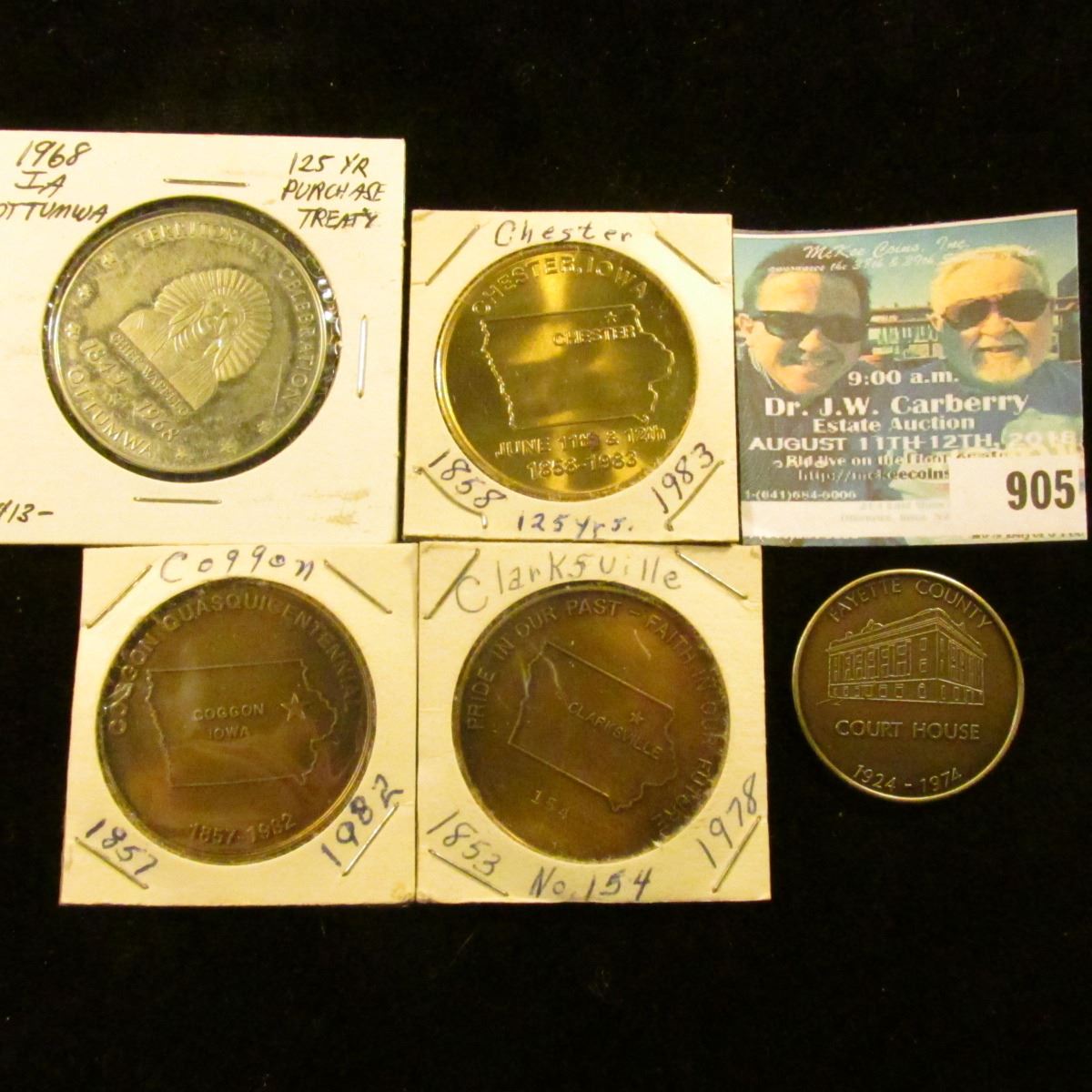 905 _ (5) different Iowa Quasquicentennial Medals, includes: West Union, Clarksville #154, Coggon, C