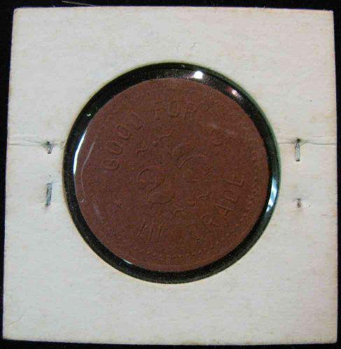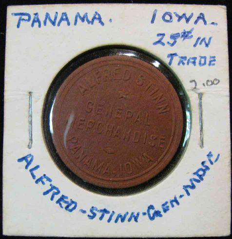 906. Alfred Stinn, General Mdse., Panama, Iowa, Good for 25c in Trade. Red Fiber.