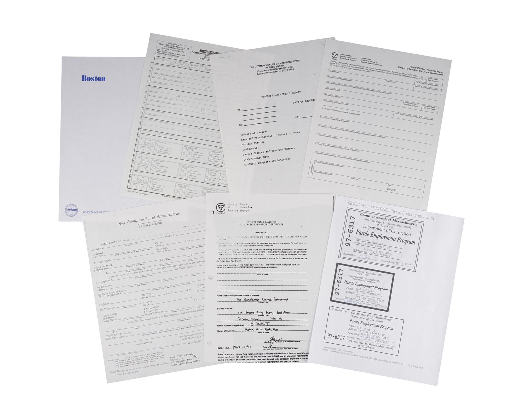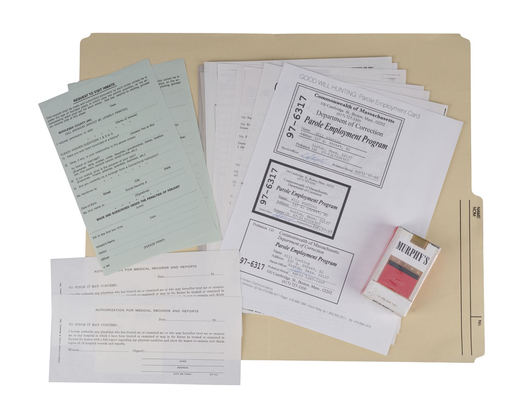 This lot consists of one manila folder with two green printed "Request To Visit Inmate" forms, two white printed "Authorization For Medical Records and Reports" slips, four blank forms and one form with printed handwritten annotations, one Boston Police Department letterhead, and 17 gray sheets of paper; one printed page of three parole card designs; and one red and white cardboard Murphy's cigarette pack with a cellophane sleeve. This lot exhibits minor discoloration and faded ink. Dimensions: (largest) 9.5" x 14.75" x 0.25" (24.25 cm x 37.5 cm x 0.75 cm)