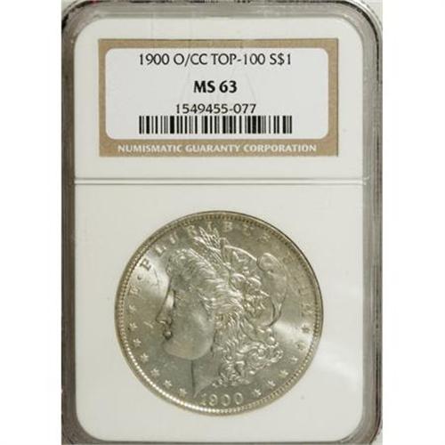 <!-- BEGIN: ICOLLECTOR - EBAY LOT HTML CODE --><style type='text/css'> #icoll_images_thumbnails, #icoll_images_mainimage, #icoll_otherlots { display: none; } div { font-family: arial, verdana, helvetica; } img { border: none; } .icoll_heading_title { background-color: #EFEFFF; color: #000; font-family: arial, verdana, helvetica; font-size: 12pt; font-style: normal; font-weight: bold; } </style><style type='text/css'>@import url(http://www.icollector.com/css/ebay/ebaylot_20070703.css);</style><script language='javascript' type='text/javascript'>function icollfunc_getelement(element_id) { var tmpelement = null; if(document.getElementById) tmpelement = document.getElementById(element_id); if(tmpelement == null) tmpelement = document[element_id]; return tmpelement; }var icollvar_mainpic = null; function icollfunc_initimages() { icollfunc_getelement('mainPicture').style.display = 'none'; icollvar_mainpic = icollfunc_getelement('icoll_images_mainimage'); var body_onload = document.body.attributes['onload']; document.body.setAttribute('onload', (body_onload ? body_onload.nodeValue : '') + 'icollfunc_fixoperaimgbug();'); }function icollfunc_changeimage(imgurl) { if(icollvar_mainpic != null) icollvar_mainpic.src = imgurl; }function icollfunc_fixoperaimgbug() { if(window.opera) { var imgobjs = icollfunc_getelement('icoll_images_thumbnails').getElementsByTagName('img'); for(var i=0; i<imgobjs.length; i++) { var w = imgobjs[i].clientWidth; if(w > 0) imgobjs[i].style.width = w + 'px'; } } }</script><script language='javascript' type='text/javascript'> var useragent = escape(navigator.userAgent); var appname = escape(navigator.appName); var dateobj = new Date(); var datetime = escape(dateobj.getFullYear()+'-'+(dateobj.getMonth()+1)+'-'+dateobj.getDate()+' '+dateobj.getHours()+':'+dateobj.getMinutes()); var referrer = ''; if(document.referrer && document.referrer != null) referrer = escape(document.referrer); new Image().src = 'http://www.icollector.com/stats/ebaylot.ashx?id=7140370&ua='+useragent+'&an='+appname+'&dt='+datetime+'&tz='+dateobj.getTimezoneOffset()+'&re='+referrer;</script><div id='icoll_images'><div id='icoll_images_prev'><a href='http://cgi.liveauctions.ebay.com/ws/eBayISAPI.dll?ViewItem&item=170135058521'><img src='http://www.ha.com/common/proxyImage.php?ebay=445-183017-1-75' alt='' /><img src='http://icollector.com/graphics/ebay_leftarrow.gif' alt='' class='arrow' /></a><div id='icoll_images_prev_info'>Prev Lot</div></div><div id='icoll_images_next'><a href='http://cgi.liveauctions.ebay.com/ws/eBayISAPI.dll?ViewItem&item=170135058534'><img src='http://www.ha.com/common/proxyImage.php?ebay=445-115003-1-75' alt='' /><img src='http://icollector.com/graphics/ebay_rightarrow.gif' alt='' class='arrow' /></a><div id='icoll_images_next_info'>Next Lot</div></div><div id='icoll_images_thumbnails'><a href='http://www.ha.com/common/proxyImage.php?ebay=445-116039-1-75' target='_blank' onmouseover="icollfunc_changeimage('http://www.ha.com/common/proxyImage.php?ebay=445-116039-1-75');"><img src='http://www.ha.com/common/proxyImage.php?ebay=445-116039-1-75' alt='' /></a><a href='http://www.ha.com/common/proxyImage.php?ebay=445-116039-2-75' target='_blank' onmouseover="icollfunc_changeimage('http://www.ha.com/common/proxyImage.php?ebay=445-116039-2-75');"><img src='http://www.ha.com/common/proxyImage.php?ebay=445-116039-2-75' alt='' /></a><div id='icoll_images_thumbnails_info'>Hover thumbnail to view large image below. Click thumbnail to view full image in new window.</div></div><div id='icoll_images_mainimage_container'><img id='icoll_images_mainimage' alt='' src='http://www.ha.com/common/proxyImage.php?ebay=445-116039-1-75'></div></div><script language='javascript' type='text/javascript'>icollfunc_initimages();</script><div id='icoll_description'><B>1900-O/CC $1 MS63 NGC.</B></I> Top-100. NGC Census: (535/839). PCGS Population (1322/2335). Numismedia Wsl. Price for NGC/PCGS coin in MS63: $675. (#7268)<BR><BR><B>Coin Engraver:</B> George T. Morgan<BR><BR><b>Shipping:</b> Coins & Currency (<a target="_blank" href="http://www.heritageauctions.com/common/shipping.php">view shipping information</a>\)</div><div id='icoll_notices'><div class='icoll_heading_left'></div><div class='icoll_heading'><div class='icoll_heading_title'>Notices</div></div><div class='icoll_heading_right'></div><div id='icoll_notices_info'><B>Important notice:</B> Heritage usually auctions material at the rate of 200-250 lots per hour. On some occasions eBay Live bid software or the Internet may not be able to keep up with the pace of the auction. We recommend placing a realistic absentee bid now as insurance to avoid disappointment. Occasionally the auctioneer may eliminate or reject an eBay Live bid, and the auctioneer may also reopen a lot after the close of the eBay live bidding (usually because we missed an audience bid), and may reject your bid even if it shows you as the winning bidder. By bidding via eBay Live, you agree that Heritage may award the lot to another bidder at its sole discretion under the circumstances described above or any other reasonable circumstances. Since eBay bids are not shown to us until we open the lot on the floor, we treat those bids just like floor bids. In most cases the floor responds before the eBay bid is presented to us, due to Internet lag time, so for consistency we have made it a policy that floor bids are always considered first over tie eBay live bids. Also please note that all Heritage lots purchased through eBay Live carry a 20% Buyer's Premium with a $9 minimum Buyer's Premium. Please make sure you read the Terms and Conditions before you bid. This lot is being auctioned in conjunction with a live floor auction by Heritage Auctions. All final auction and invoice information will be supplied by Heritage Auctions, and all other information should be considered preliminary. <BR><BR><B>Winning Notification and Billing:</B> After the FINAL session in this auction is complete, Heritage will 