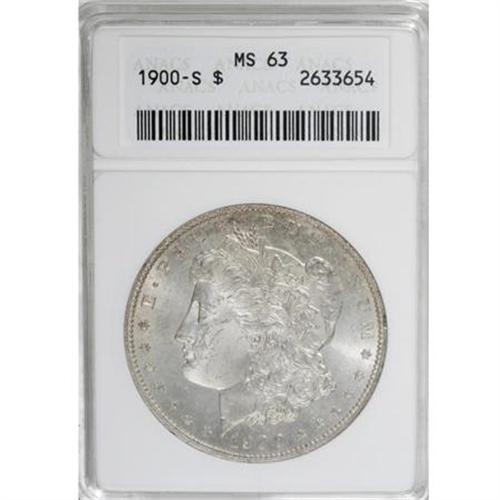 <!-- BEGIN: ICOLLECTOR - EBAY LOT HTML CODE --><style type='text/css'> #icoll_images_thumbnails, #icoll_images_mainimage, #icoll_otherlots { display: none; } div { font-family: arial, verdana, helvetica; } img { border: none; } .icoll_heading_title { background-color: #EFEFFF; color: #000; font-family: arial, verdana, helvetica; font-size: 12pt; font-style: normal; font-weight: bold; } </style><style type='text/css'>@import url(http://www.icollector.com/css/ebay/ebaylot_20070703.css);</style><script language='javascript' type='text/javascript'>function icollfunc_getelement(element_id) { var tmpelement = null; if(document.getElementById) tmpelement = document.getElementById(element_id); if(tmpelement == null) tmpelement = document[element_id]; return tmpelement; }var icollvar_mainpic = null; function icollfunc_initimages() { icollfunc_getelement('mainPicture').style.display = 'none'; icollvar_mainpic = icollfunc_getelement('icoll_images_mainimage'); var body_onload = document.body.attributes['onload']; document.body.setAttribute('onload', (body_onload ? body_onload.nodeValue : '') + 'icollfunc_fixoperaimgbug();'); }function icollfunc_changeimage(imgurl) { if(icollvar_mainpic != null) icollvar_mainpic.src = imgurl; }function icollfunc_fixoperaimgbug() { if(window.opera) { var imgobjs = icollfunc_getelement('icoll_images_thumbnails').getElementsByTagName('img'); for(var i=0; i<imgobjs.length; i++) { var w = imgobjs[i].clientWidth; if(w > 0) imgobjs[i].style.width = w + 'px'; } } }</script><script language='javascript' type='text/javascript'> var useragent = escape(navigator.userAgent); var appname = escape(navigator.appName); var dateobj = new Date(); var datetime = escape(dateobj.getFullYear()+'-'+(dateobj.getMonth()+1)+'-'+dateobj.getDate()+' '+dateobj.getHours()+':'+dateobj.getMinutes()); var referrer = ''; if(document.referrer && document.referrer != null) referrer = escape(document.referrer); new Image().src = 'http://www.icollector.com/stats/ebaylot.ashx?id=7140374&ua='+useragent+'&an='+appname+'&dt='+datetime+'&tz='+dateobj.getTimezoneOffset()+'&re='+referrer;</script><div id='icoll_images'><div id='icoll_images_prev'><a href='http://cgi.liveauctions.ebay.com/ws/eBayISAPI.dll?ViewItem&item=170135058537'><img src='http://www.ha.com/common/proxyImage.php?ebay=445-149015-1-75' alt='' /><img src='http://icollector.com/graphics/ebay_leftarrow.gif' alt='' class='arrow' /></a><div id='icoll_images_prev_info'>Prev Lot</div></div><div id='icoll_images_next'><a href='http://cgi.liveauctions.ebay.com/ws/eBayISAPI.dll?ViewItem&item=170135058545'><img src='http://www.ha.com/common/proxyImage.php?ebay=445-33007-1-75' alt='' /><img src='http://icollector.com/graphics/ebay_rightarrow.gif' alt='' class='arrow' /></a><div id='icoll_images_next_info'>Next Lot</div></div><div id='icoll_images_thumbnails'><a href='http://www.ha.com/common/proxyImage.php?ebay=445-17121-1-75' target='_blank' onmouseover="icollfunc_changeimage('http://www.ha.com/common/proxyImage.php?ebay=445-17121-1-75');"><img src='http://www.ha.com/common/proxyImage.php?ebay=445-17121-1-75' alt='' /></a><a href='http://www.ha.com/common/proxyImage.php?ebay=445-17121-2-75' target='_blank' onmouseover="icollfunc_changeimage('http://www.ha.com/common/proxyImage.php?ebay=445-17121-2-75');"><img src='http://www.ha.com/common/proxyImage.php?ebay=445-17121-2-75' alt='' /></a><div id='icoll_images_thumbnails_info'>Hover thumbnail to view large image below. Click thumbnail to view full image in new window.</div></div><div id='icoll_images_mainimage_container'><img id='icoll_images_mainimage' alt='' src='http://www.ha.com/common/proxyImage.php?ebay=445-17121-1-75'></div></div><script language='javascript' type='text/javascript'>icollfunc_initimages();</script><div id='icoll_description'><B>1900-S $1 MS63 ANACS.</B></I> NGC Census: (610/914). PCGS Population (1175/1752). Mintage: 3,540,000. Numismedia Wsl. Price for NGC/PCGS coin in MS63: $325. (#7270)<BR><BR><B>Coin Engraver:</B> George T. Morgan<BR><BR><b>Shipping:</b> Coins & Currency (<a target="_blank" href="http://www.heritageauctions.com/common/shipping.php">view shipping information</a>\)</div><div id='icoll_notices'><div class='icoll_heading_left'></div><div class='icoll_heading'><div class='icoll_heading_title'>Notices</div></div><div class='icoll_heading_right'></div><div id='icoll_notices_info'><B>Important notice:</B> Heritage usually auctions material at the rate of 200-250 lots per hour. On some occasions eBay Live bid software or the Internet may not be able to keep up with the pace of the auction. We recommend placing a realistic absentee bid now as insurance to avoid disappointment. Occasionally the auctioneer may eliminate or reject an eBay Live bid, and the auctioneer may also reopen a lot after the close of the eBay live bidding (usually because we missed an audience bid), and may reject your bid even if it shows you as the winning bidder. By bidding via eBay Live, you agree that Heritage may award the lot to another bidder at its sole discretion under the circumstances described above or any other reasonable circumstances. Since eBay bids are not shown to us until we open the lot on the floor, we treat those bids just like floor bids. In most cases the floor responds before the eBay bid is presented to us, due to Internet lag time, so for consistency we have made it a policy that floor bids are always considered first over tie eBay live bids. Also please note that all Heritage lots purchased through eBay Live carry a 20% Buyer's Premium with a $9 minimum Buyer's Premium. Please make sure you read the Terms and Conditions before you bid. This lot is being auctioned in conjunction with a live floor auction by Heritage Auctions. All final auction and invoice information will be supplied by Heritage Auctions, and all other information should be considered preliminary. <BR><BR><B>Winning Notification and Billing:</B> After the FINAL session in this auction is complete, Heritage wil