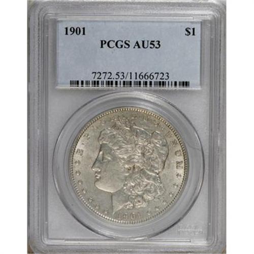 <!-- BEGIN: ICOLLECTOR - EBAY LOT HTML CODE --><style type='text/css'> #icoll_images_thumbnails, #icoll_images_mainimage, #icoll_otherlots { display: none; } div { font-family: arial, verdana, helvetica; } img { border: none; } .icoll_heading_title { background-color: #EFEFFF; color: #000; font-family: arial, verdana, helvetica; font-size: 12pt; font-style: normal; font-weight: bold; } </style><style type='text/css'>@import url(http://www.icollector.com/css/ebay/ebaylot_20070703.css);</style><script language='javascript' type='text/javascript'>function icollfunc_getelement(element_id) { var tmpelement = null; if(document.getElementById) tmpelement = document.getElementById(element_id); if(tmpelement == null) tmpelement = document[element_id]; return tmpelement; }var icollvar_mainpic = null; function icollfunc_initimages() { icollfunc_getelement('mainPicture').style.display = 'none'; icollvar_mainpic = icollfunc_getelement('icoll_images_mainimage'); var body_onload = document.body.attributes['onload']; document.body.setAttribute('onload', (body_onload ? body_onload.nodeValue : '') + 'icollfunc_fixoperaimgbug();'); }function icollfunc_changeimage(imgurl) { if(icollvar_mainpic != null) icollvar_mainpic.src = imgurl; }function icollfunc_fixoperaimgbug() { if(window.opera) { var imgobjs = icollfunc_getelement('icoll_images_thumbnails').getElementsByTagName('img'); for(var i=0; i<imgobjs.length; i++) { var w = imgobjs[i].clientWidth; if(w > 0) imgobjs[i].style.width = w + 'px'; } } }</script><script language='javascript' type='text/javascript'> var useragent = escape(navigator.userAgent); var appname = escape(navigator.appName); var dateobj = new Date(); var datetime = escape(dateobj.getFullYear()+'-'+(dateobj.getMonth()+1)+'-'+dateobj.getDate()+' '+dateobj.getHours()+':'+dateobj.getMinutes()); var referrer = ''; if(document.referrer && document.referrer != null) referrer = escape(document.referrer); new Image().src = 'http://www.icollector.com/stats/ebaylot.ashx?id=7140380&ua='+useragent+'&an='+appname+'&dt='+datetime+'&tz='+dateobj.getTimezoneOffset()+'&re='+referrer;</script><div id='icoll_images'><div id='icoll_images_prev'><a href='http://cgi.liveauctions.ebay.com/ws/eBayISAPI.dll?ViewItem&item=170135058584'><img src='http://www.ha.com/common/proxyImage.php?ebay=445-39040-1-75' alt='' /><img src='http://icollector.com/graphics/ebay_leftarrow.gif' alt='' class='arrow' /></a><div id='icoll_images_prev_info'>Prev Lot</div></div><div id='icoll_images_next'><a href='http://cgi.liveauctions.ebay.com/ws/eBayISAPI.dll?ViewItem&item=170135058594'><img src='http://www.ha.com/common/proxyImage.php?ebay=445-67002-1-75' alt='' /><img src='http://icollector.com/graphics/ebay_rightarrow.gif' alt='' class='arrow' /></a><div id='icoll_images_next_info'>Next Lot</div></div><div id='icoll_images_thumbnails'><a href='http://www.ha.com/common/proxyImage.php?ebay=445-1159-1-75' target='_blank' onmouseover="icollfunc_changeimage('http://www.ha.com/common/proxyImage.php?ebay=445-1159-1-75');"><img src='http://www.ha.com/common/proxyImage.php?ebay=445-1159-1-75' alt='' /></a><a href='http://www.ha.com/common/proxyImage.php?ebay=445-1159-2-75' target='_blank' onmouseover="icollfunc_changeimage('http://www.ha.com/common/proxyImage.php?ebay=445-1159-2-75');"><img src='http://www.ha.com/common/proxyImage.php?ebay=445-1159-2-75' alt='' /></a><div id='icoll_images_thumbnails_info'>Hover thumbnail to view large image below. Click thumbnail to view full image in new window.</div></div><div id='icoll_images_mainimage_container'><img id='icoll_images_mainimage' alt='' src='http://www.ha.com/common/proxyImage.php?ebay=445-1159-1-75'></div></div><script language='javascript' type='text/javascript'>icollfunc_initimages();</script><div id='icoll_description'><B>1901 $1 AU53 PCGS.</B></I> PCGS Population (289/1684). NGC Census: (305/2004). Mintage: 6,962,813. Numismedia Wsl. Price for NGC/PCGS coin in AU53: $300. (#7272)<BR><BR><B>Coin Engraver:</B> George T. Morgan<BR><BR><b>Shipping:</b> Coins & Currency (<a target="_blank" href="http://www.heritageauctions.com/common/shipping.php">view shipping information</a>\)</div><div id='icoll_notices'><div class='icoll_heading_left'></div><div class='icoll_heading'><div class='icoll_heading_title'>Notices</div></div><div class='icoll_heading_right'></div><div id='icoll_notices_info'><B>Important notice:</B> Heritage usually auctions material at the rate of 200-250 lots per hour. On some occasions eBay Live bid software or the Internet may not be able to keep up with the pace of the auction. We recommend placing a realistic absentee bid now as insurance to avoid disappointment. Occasionally the auctioneer may eliminate or reject an eBay Live bid, and the auctioneer may also reopen a lot after the close of the eBay live bidding (usually because we missed an audience bid), and may reject your bid even if it shows you as the winning bidder. By bidding via eBay Live, you agree that Heritage may award the lot to another bidder at its sole discretion under the circumstances described above or any other reasonable circumstances. Since eBay bids are not shown to us until we open the lot on the floor, we treat those bids just like floor bids. In most cases the floor responds before the eBay bid is presented to us, due to Internet lag time, so for consistency we have made it a policy that floor bids are always considered first over tie eBay live bids. Also please note that all Heritage lots purchased through eBay Live carry a 20% Buyer's Premium with a $9 minimum Buyer's Premium. Please make sure you read the Terms and Conditions before you bid. This lot is being auctioned in conjunction with a live floor auction by Heritage Auctions. All final auction and invoice information will be supplied by Heritage Auctions, and all other information should be considered preliminary. <BR><BR><B>Winning Notification and Billing:</B> After the FINAL session in this auction is complete, Heritage will send e-ma