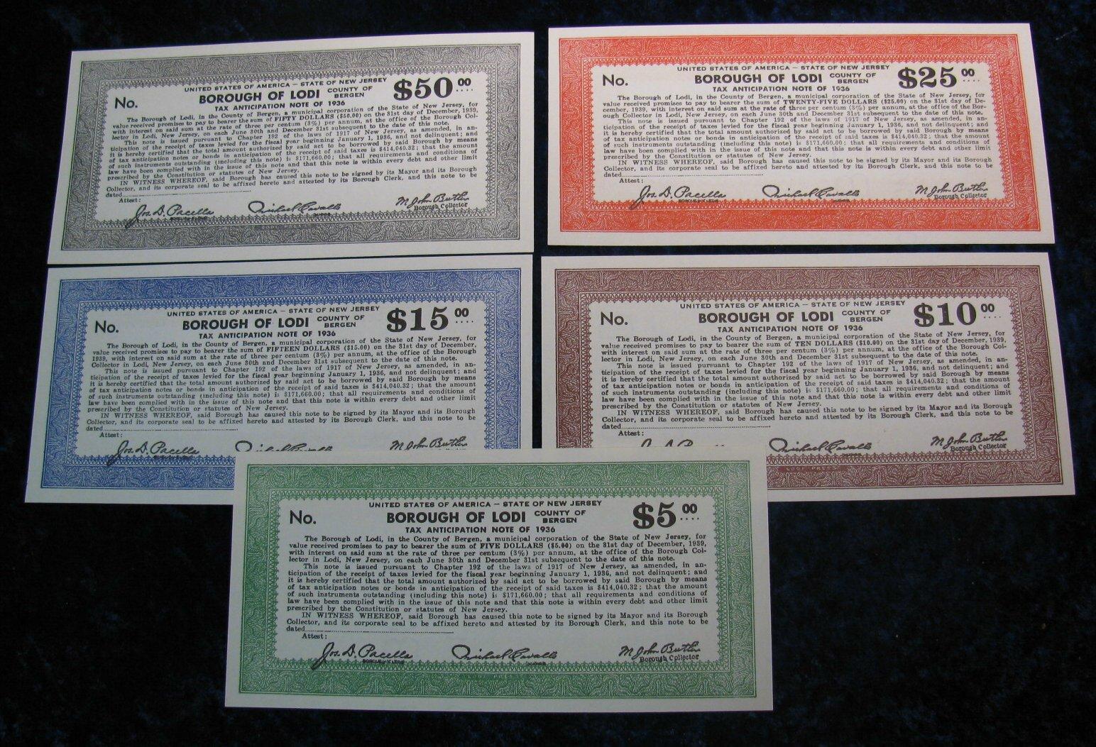 908. (5) Lodi NJ. Depression Scripts. $5, $10, $15, $25 & $50.