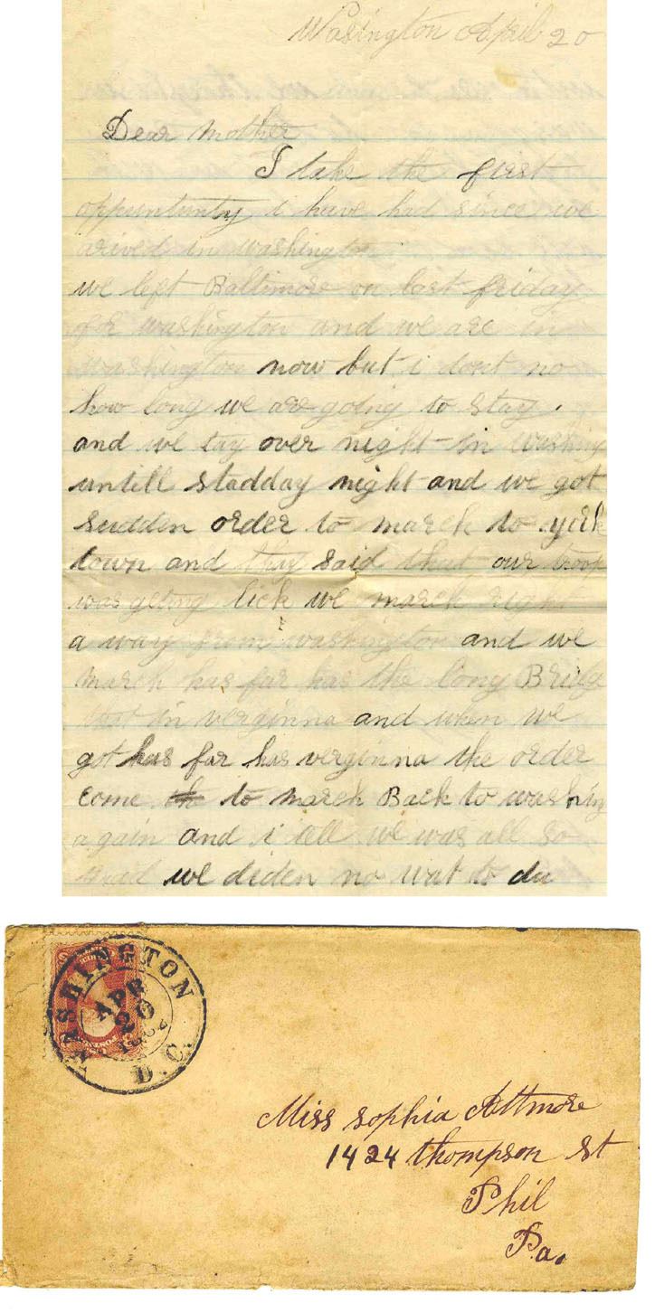 Four page Civil War letter from Samuel W. Attmore of the 90th Pennsylvania Infantry, Company D, to his mother. Accompanied by cover. Written in pencil and datelined ''Washington April 20 [1862],'' letter reads in part: ''...we got sudden order to march to york town and they said that our troop was geting lick we march right a way from washington and we march as far as the long Bridge that in Verginna and when we got as far as verginna the order come to march back to washing again and i tell we was all so mad we diden no wat to du with our selfel we thorght we was going to have a Bully fight but we misted we will get at them for long then we will show the gay Rebble what the nation guard can du...when we march to vergina it was up to our knee in mud and sick a time we had going thugh the mud and when we came Back we was mud from head to foot and it was a raining to and we got wet But that dont hurt no solder...you must excuse us tow for not writing sooner to you for this is first chance we had and now whil i am a writing theay are runing all over and we are all up side down i am a setting in a conner By my selfe a writing...'' Attmore mustered into Company D on 18 September 1861 and survived the war. The 90th Pennsylvania saw action at Cedar Mountain, Bull Run, South Mountain, Antietam, Fredericksburg, Gettysburg, the Wilderness and Petersburg. Letter measures 5'' x 8''. Near fine condition.