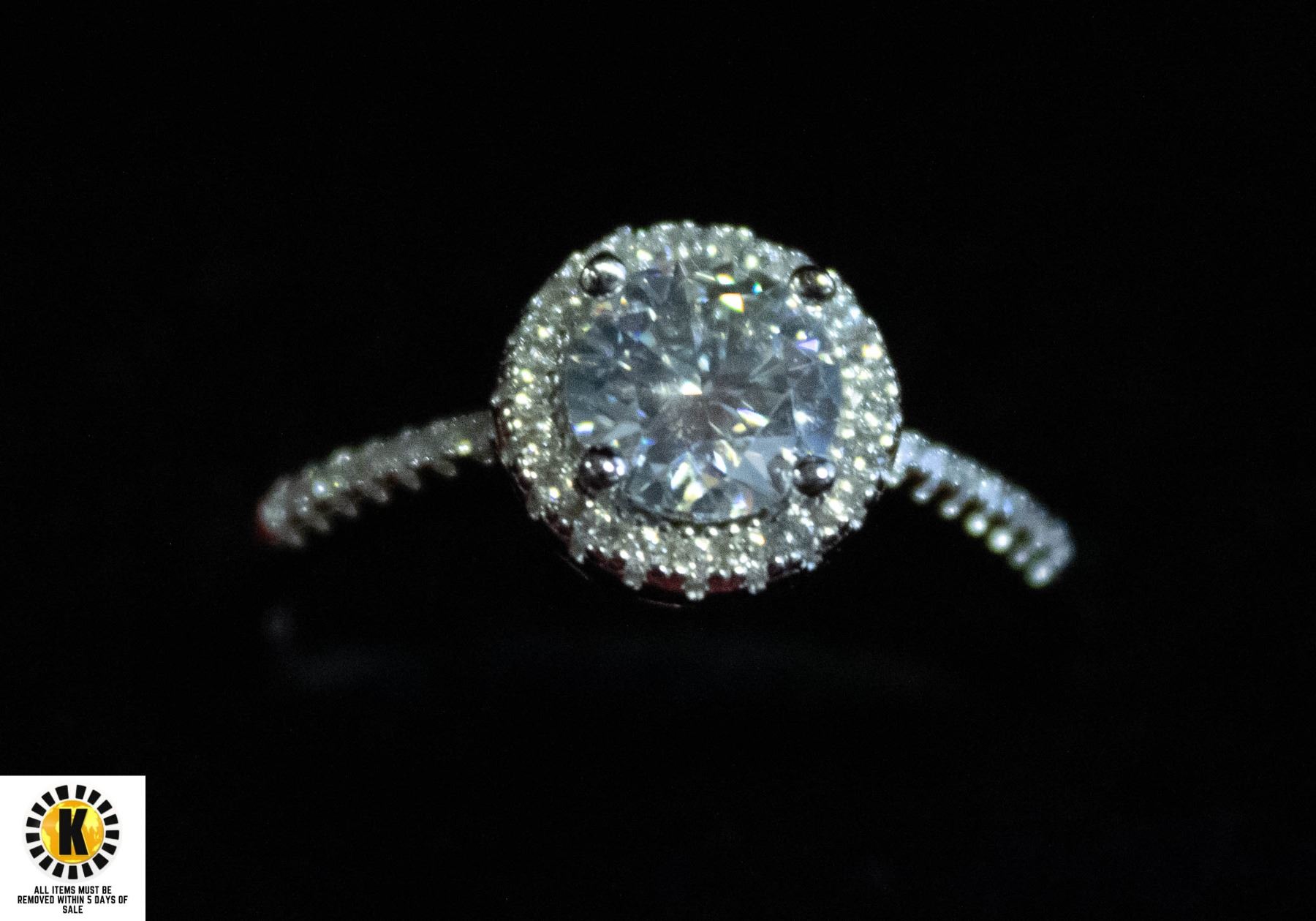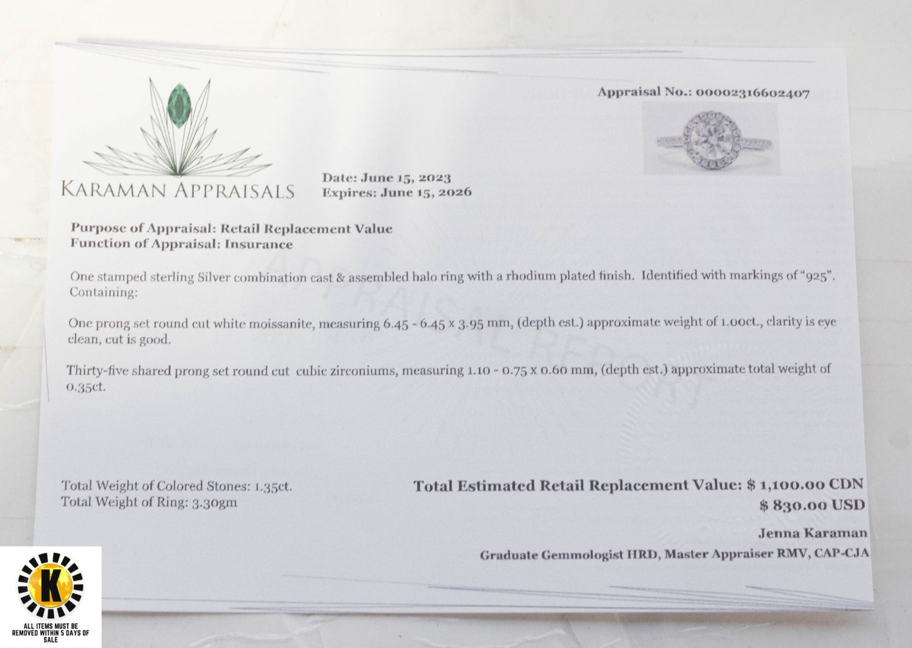 35 CUBIC ZIRCONIA IN HALO AND IN SHANK IN RING WEIGHING 0.35 CT TW GRA CERTIFIED STAMPED 925 SIZE 8.75 APPRAISED VALUE $1,100.00
