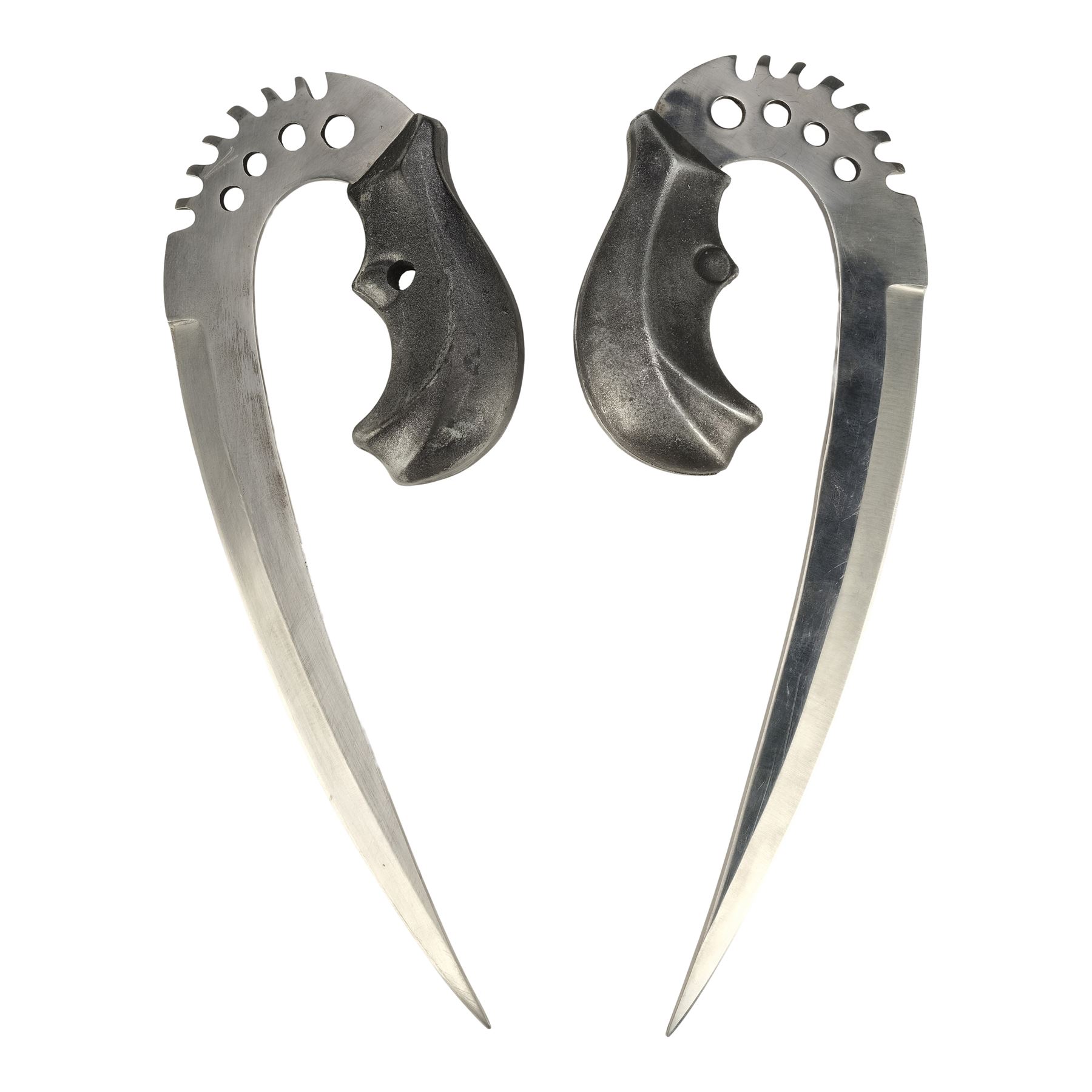 THE CHRONICLES OF RIDDICK (2004) - Riddick's (Vin Diesel) Pair of Metal Ulaks - Riddick's (Vin Diesel) pair of metal ulaks from David Twohy's The Chronicles of Riddick. Riddick wielded dual Furyan saber blades forged by extraterrestrial monks as his signature weapons throughout the film, including when he fought Necromongers across the surface of Crematoria.