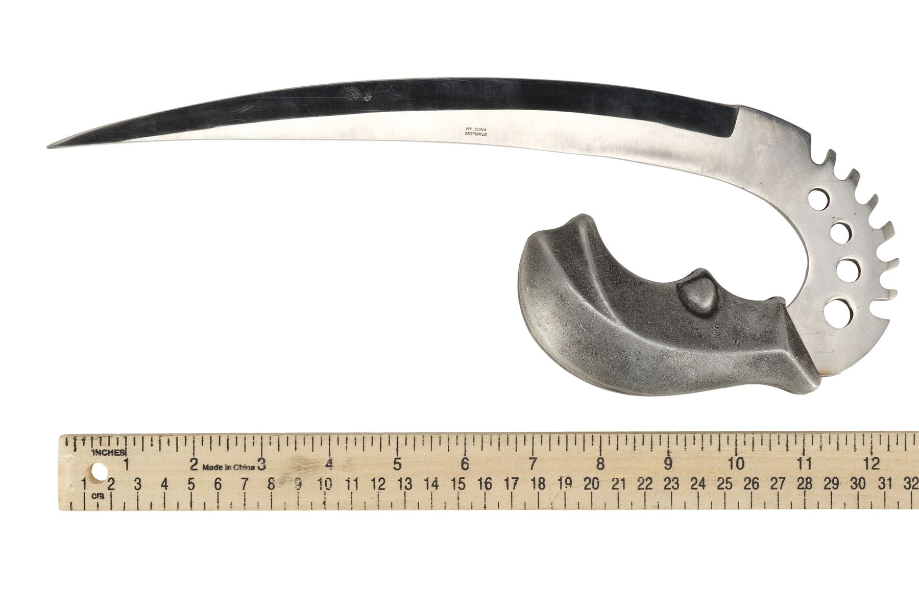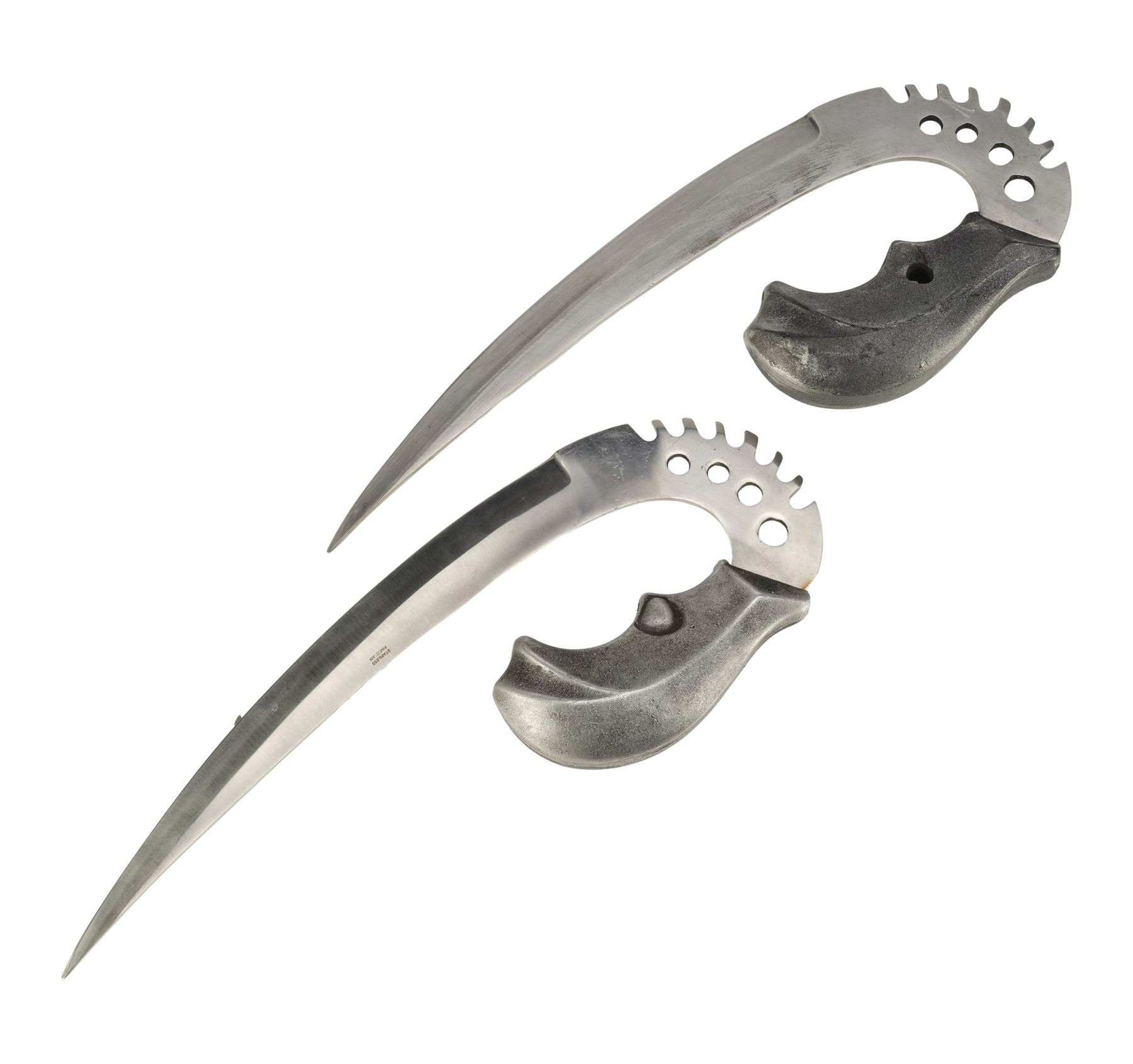 These ulaks originated from a crew member. They feature curved stainless steel blades created by Axtion Bladez Concepts with four holes apiece, then updated with custom handgrips for the production. One features a dense rubber handgrip painted silver-color to appear metallic and punched with an additional hole by production, while the other is entirely metal. Both exhibit minor scratching, scuffing, and grime from production use, most visibly on the blades. Dimensions: (each) 12.5" x 5.5" x 1.5" (31.75 x 14 cm x 4 cm)