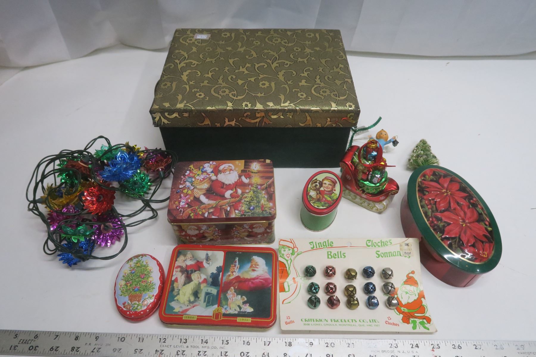 910. Lot of small Christmas tins, string of lights with reflectors, glass ornament