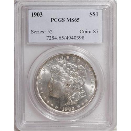 <!-- BEGIN: ICOLLECTOR - EBAY LOT HTML CODE --><style type='text/css'> #icoll_images_thumbnails, #icoll_images_mainimage, #icoll_otherlots { display: none; } div { font-family: arial, verdana, helvetica; } img { border: none; } .icoll_heading_title { background-color: #EFEFFF; color: #000; font-family: arial, verdana, helvetica; font-size: 12pt; font-style: normal; font-weight: bold; } </style><style type='text/css'>@import url(http://www.icollector.com/css/ebay/ebaylot_20070703.css);</style><script language='javascript' type='text/javascript'>function icollfunc_getelement(element_id) { var tmpelement = null; if(document.getElementById) tmpelement = document.getElementById(element_id); if(tmpelement == null) tmpelement = document[element_id]; return tmpelement; }var icollvar_mainpic = null; function icollfunc_initimages() { icollfunc_getelement('mainPicture').style.display = 'none'; icollvar_mainpic = icollfunc_getelement('icoll_images_mainimage'); var body_onload = document.body.attributes['onload']; document.body.setAttribute('onload', (body_onload ? body_onload.nodeValue : '') + 'icollfunc_fixoperaimgbug();'); }function icollfunc_changeimage(imgurl) { if(icollvar_mainpic != null) icollvar_mainpic.src = imgurl; }function icollfunc_fixoperaimgbug() { if(window.opera) { var imgobjs = icollfunc_getelement('icoll_images_thumbnails').getElementsByTagName('img'); for(var i=0; i<imgobjs.length; i++) { var w = imgobjs[i].clientWidth; if(w > 0) imgobjs[i].style.width = w + 'px'; } } }</script><script language='javascript' type='text/javascript'> var useragent = escape(navigator.userAgent); var appname = escape(navigator.appName); var dateobj = new Date(); var datetime = escape(dateobj.getFullYear()+'-'+(dateobj.getMonth()+1)+'-'+dateobj.getDate()+' '+dateobj.getHours()+':'+dateobj.getMinutes()); var referrer = ''; if(document.referrer && document.referrer != null) referrer = escape(document.referrer); new Image().src = 'http://www.icollector.com/stats/ebaylot.ashx?id=7140416&ua='+useragent+'&an='+appname+'&dt='+datetime+'&tz='+dateobj.getTimezoneOffset()+'&re='+referrer;</script><div id='icoll_images'><div id='icoll_images_prev'><a href='http://cgi.liveauctions.ebay.com/ws/eBayISAPI.dll?ViewItem&item=170135058945'><img src='http://www.ha.com/common/proxyImage.php?ebay=445-17034-1-75' alt='' /><img src='http://icollector.com/graphics/ebay_leftarrow.gif' alt='' class='arrow' /></a><div id='icoll_images_prev_info'>Prev Lot</div></div><div id='icoll_images_next'><a href='http://cgi.liveauctions.ebay.com/ws/eBayISAPI.dll?ViewItem&item=170135058990'><img src='http://www.ha.com/common/proxyImage.php?ebay=445-148002-1-75' alt='' /><img src='http://icollector.com/graphics/ebay_rightarrow.gif' alt='' class='arrow' /></a><div id='icoll_images_next_info'>Next Lot</div></div><div id='icoll_images_thumbnails'><a href='http://www.ha.com/common/proxyImage.php?ebay=445-90005-1-75' target='_blank' onmouseover="icollfunc_changeimage('http://www.ha.com/common/proxyImage.php?ebay=445-90005-1-75');"><img src='http://www.ha.com/common/proxyImage.php?ebay=445-90005-1-75' alt='' /></a><a href='http://www.ha.com/common/proxyImage.php?ebay=445-90005-2-75' target='_blank' onmouseover="icollfunc_changeimage('http://www.ha.com/common/proxyImage.php?ebay=445-90005-2-75');"><img src='http://www.ha.com/common/proxyImage.php?ebay=445-90005-2-75' alt='' /></a><div id='icoll_images_thumbnails_info'>Hover thumbnail to view large image below. Click thumbnail to view full image in new window.</div></div><div id='icoll_images_mainimage_container'><img id='icoll_images_mainimage' alt='' src='http://www.ha.com/common/proxyImage.php?ebay=445-90005-1-75'></div></div><script language='javascript' type='text/javascript'>icollfunc_initimages();</script><div id='icoll_description'><B>1903 $1 MS65 PCGS.</B></I> PCGS Population (2337/760). NGC Census: (1888/516). Mintage: 4,652,755. Numismedia Wsl. Price for NGC/PCGS coin in MS65: $228. (#7284)<BR><BR><B>Coin Engraver:</B> George T. Morgan<BR><BR><b>Shipping:</b> Coins & Currency (<a target="_blank" href="http://www.heritageauctions.com/common/shipping.php">view shipping information</a>\)</div><div id='icoll_notices'><div class='icoll_heading_left'></div><div class='icoll_heading'><div class='icoll_heading_title'>Notices</div></div><div class='icoll_heading_right'></div><div id='icoll_notices_info'><B>Important notice:</B> Heritage usually auctions material at the rate of 200-250 lots per hour. On some occasions eBay Live bid software or the Internet may not be able to keep up with the pace of the auction. We recommend placing a realistic absentee bid now as insurance to avoid disappointment. Occasionally the auctioneer may eliminate or reject an eBay Live bid, and the auctioneer may also reopen a lot after the close of the eBay live bidding (usually because we missed an audience bid), and may reject your bid even if it shows you as the winning bidder. By bidding via eBay Live, you agree that Heritage may award the lot to another bidder at its sole discretion under the circumstances described above or any other reasonable circumstances. Since eBay bids are not shown to us until we open the lot on the floor, we treat those bids just like floor bids. In most cases the floor responds before the eBay bid is presented to us, due to Internet lag time, so for consistency we have made it a policy that floor bids are always considered first over tie eBay live bids. Also please note that all Heritage lots purchased through eBay Live carry a 20% Buyer's Premium with a $9 minimum Buyer's Premium. Please make sure you read the Terms and Conditions before you bid. This lot is being auctioned in conjunction with a live floor auction by Heritage Auctions. All final auction and invoice information will be supplied by Heritage Auctions, and all other information should be considered preliminary. <BR><BR><B>Winning Notification and Billing:</B> After the FINAL session in this auction is complete, Heritage will s