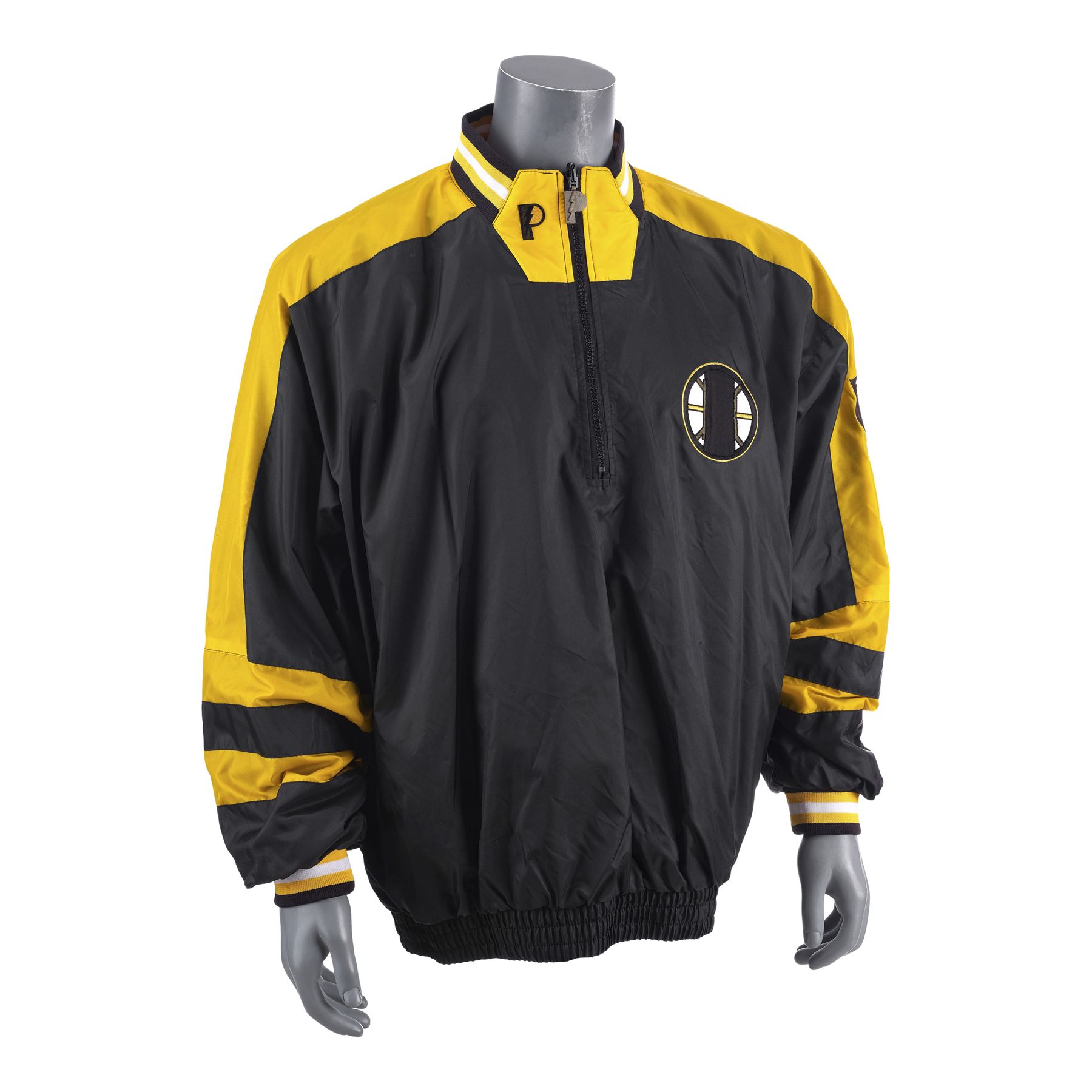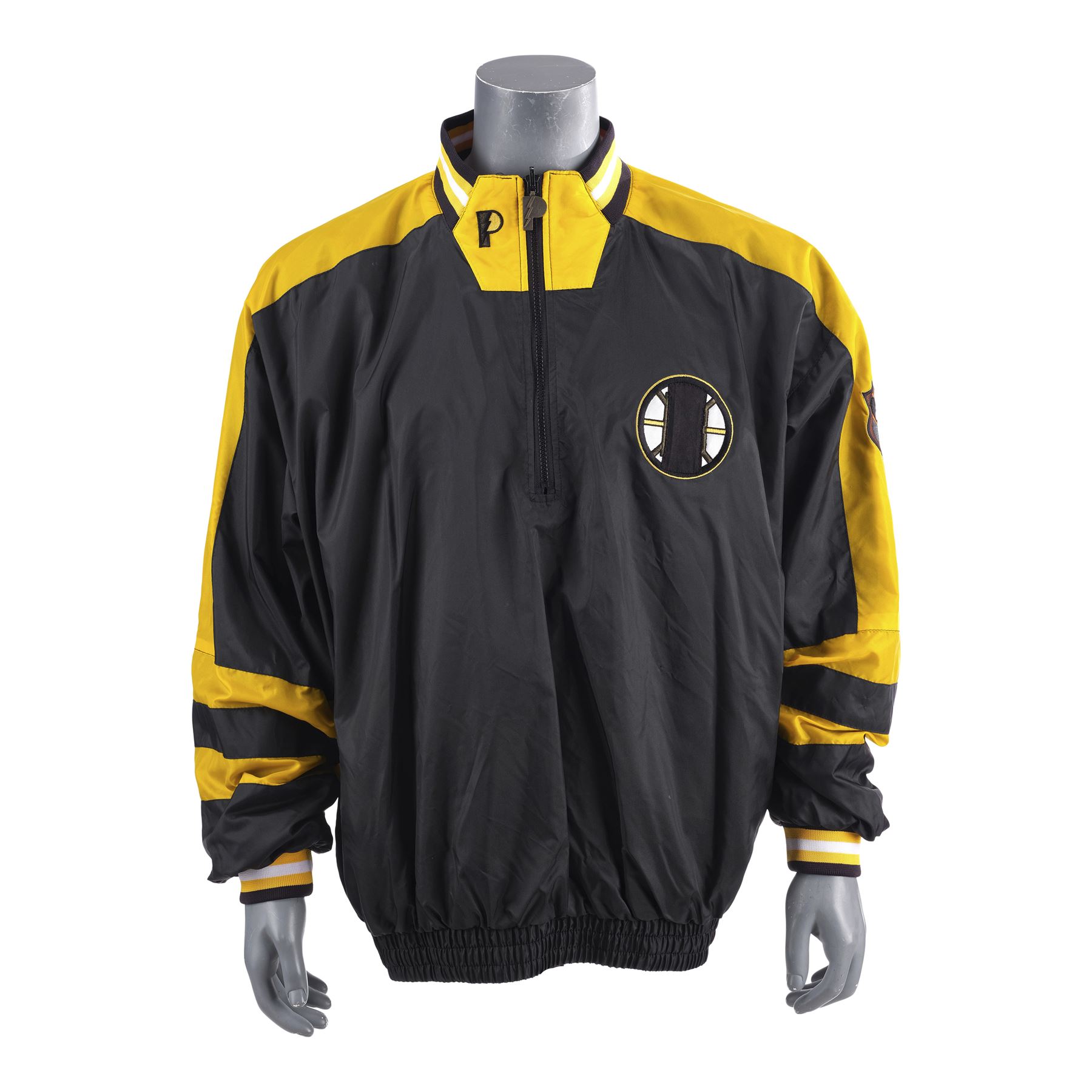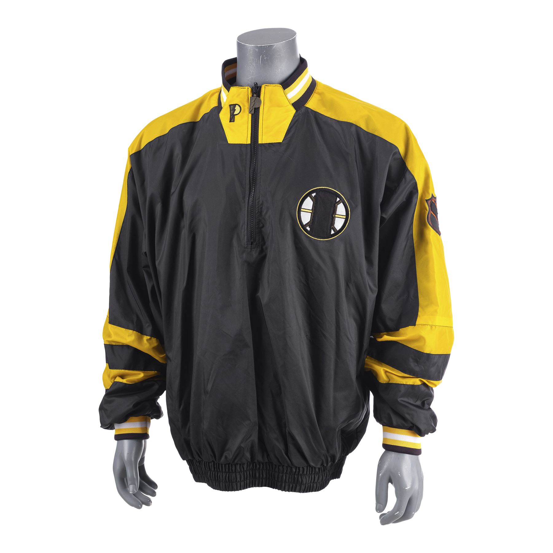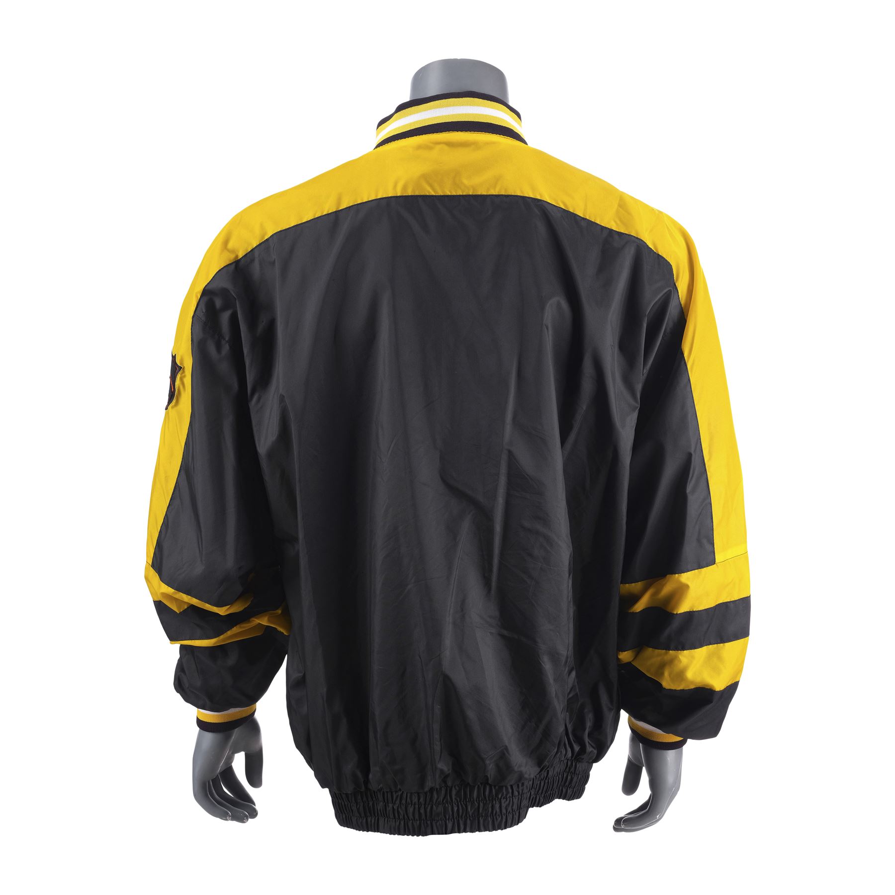 This lot consists of a black and yellow polyester nylon Pro Player jacket (Size L) featuring various brand patches along the front, collar, left sleeve, and the metal zipper pendant. The jacket exhibits minor grime on the sleeves' interior.
