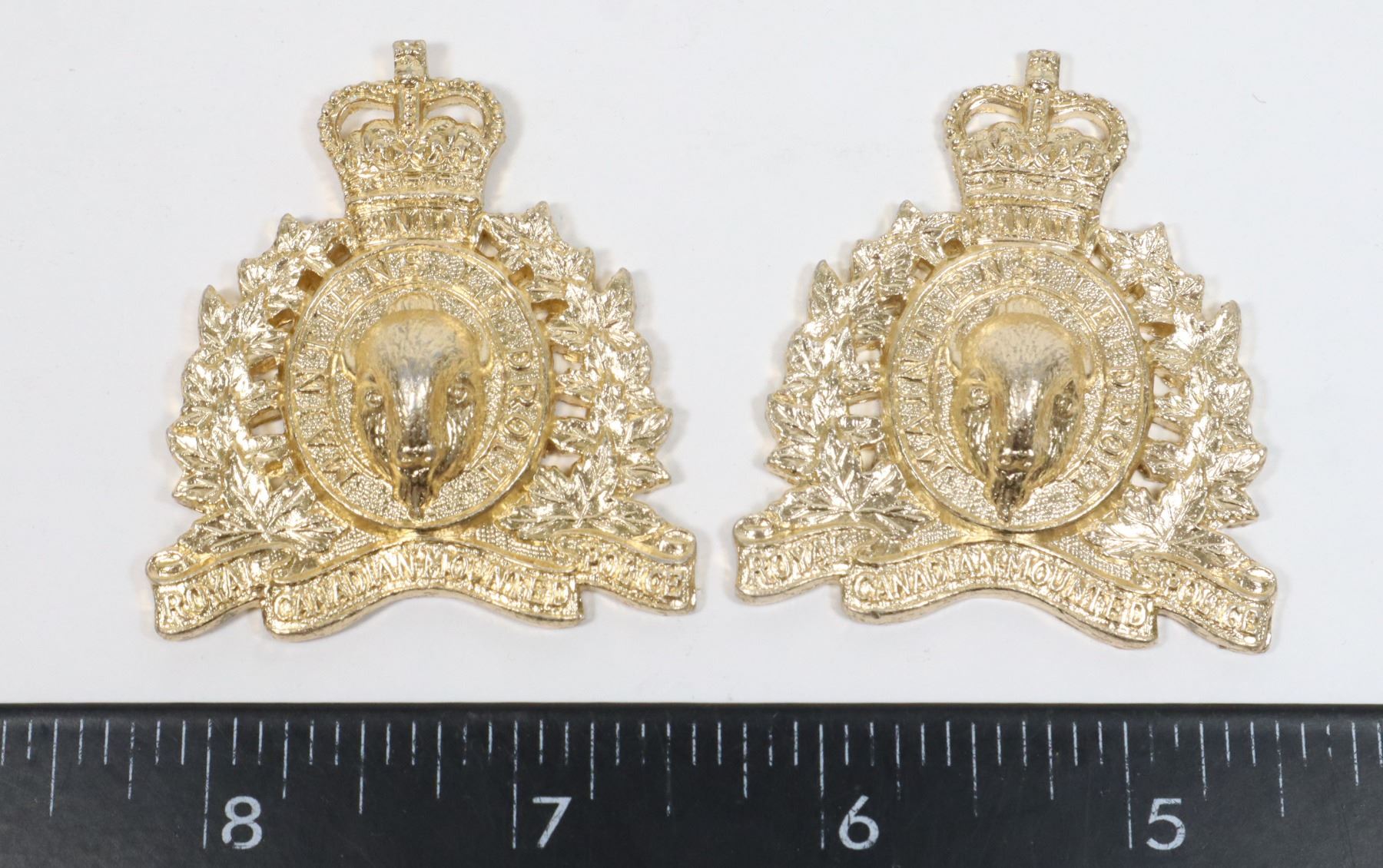 SCULLY MAKER MARKED ON REVERSE BOTH CAP BADGES REQUIRE LUGS FOR RESTORATION ELIZABETH II QEII ROYAL CANADIAN MOUNTED POLICE