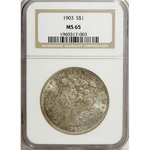 <!-- BEGIN: ICOLLECTOR - EBAY LOT HTML CODE --><style type='text/css'> #icoll_images_thumbnails, #icoll_images_mainimage, #icoll_otherlots { display: none; } div { font-family: arial, verdana, helvetica; } img { border: none; } .icoll_heading_title { background-color: #EFEFFF; color: #000; font-family: arial, verdana, helvetica; font-size: 12pt; font-style: normal; font-weight: bold; } </style><style type='text/css'>@import url(http://www.icollector.com/css/ebay/ebaylot_20070703.css);</style><script language='javascript' type='text/javascript'>function icollfunc_getelement(element_id) { var tmpelement = null; if(document.getElementById) tmpelement = document.getElementById(element_id); if(tmpelement == null) tmpelement = document[element_id]; return tmpelement; }var icollvar_mainpic = null; function icollfunc_initimages() { icollfunc_getelement('mainPicture').style.display = 'none'; icollvar_mainpic = icollfunc_getelement('icoll_images_mainimage'); var body_onload = document.body.attributes['onload']; document.body.setAttribute('onload', (body_onload ? body_onload.nodeValue : '') + 'icollfunc_fixoperaimgbug();'); }function icollfunc_changeimage(imgurl) { if(icollvar_mainpic != null) icollvar_mainpic.src = imgurl; }function icollfunc_fixoperaimgbug() { if(window.opera) { var imgobjs = icollfunc_getelement('icoll_images_thumbnails').getElementsByTagName('img'); for(var i=0; i<imgobjs.length; i++) { var w = imgobjs[i].clientWidth; if(w > 0) imgobjs[i].style.width = w + 'px'; } } }</script><script language='javascript' type='text/javascript'> var useragent = escape(navigator.userAgent); var appname = escape(navigator.appName); var dateobj = new Date(); var datetime = escape(dateobj.getFullYear()+'-'+(dateobj.getMonth()+1)+'-'+dateobj.getDate()+' '+dateobj.getHours()+':'+dateobj.getMinutes()); var referrer = ''; if(document.referrer && document.referrer != null) referrer = escape(document.referrer); new Image().src = 'http://www.icollector.com/stats/ebaylot.ashx?id=7140418&ua='+useragent+'&an='+appname+'&dt='+datetime+'&tz='+dateobj.getTimezoneOffset()+'&re='+referrer;</script><div id='icoll_images'><div id='icoll_images_prev'><a href='http://cgi.liveauctions.ebay.com/ws/eBayISAPI.dll?ViewItem&item=170135058990'><img src='http://www.ha.com/common/proxyImage.php?ebay=445-148002-1-75' alt='' /><img src='http://icollector.com/graphics/ebay_leftarrow.gif' alt='' class='arrow' /></a><div id='icoll_images_prev_info'>Prev Lot</div></div><div id='icoll_images_next'><a href='http://cgi.liveauctions.ebay.com/ws/eBayISAPI.dll?ViewItem&item=170135059003'><img src='http://www.ha.com/common/proxyImage.php?ebay=445-39083-1-75' alt='' /><img src='http://icollector.com/graphics/ebay_rightarrow.gif' alt='' class='arrow' /></a><div id='icoll_images_next_info'>Next Lot</div></div><div id='icoll_images_thumbnails'><a href='http://www.ha.com/common/proxyImage.php?ebay=445-154066-1-75' target='_blank' onmouseover="icollfunc_changeimage('http://www.ha.com/common/proxyImage.php?ebay=445-154066-1-75');"><img src='http://www.ha.com/common/proxyImage.php?ebay=445-154066-1-75' alt='' /></a><a href='http://www.ha.com/common/proxyImage.php?ebay=445-154066-2-75' target='_blank' onmouseover="icollfunc_changeimage('http://www.ha.com/common/proxyImage.php?ebay=445-154066-2-75');"><img src='http://www.ha.com/common/proxyImage.php?ebay=445-154066-2-75' alt='' /></a><div id='icoll_images_thumbnails_info'>Hover thumbnail to view large image below. Click thumbnail to view full image in new window.</div></div><div id='icoll_images_mainimage_container'><img id='icoll_images_mainimage' alt='' src='http://www.ha.com/common/proxyImage.php?ebay=445-154066-1-75'></div></div><script language='javascript' type='text/javascript'>icollfunc_initimages();</script><div id='icoll_description'><B>1903 $1 MS65 NGC.</B></I> NGC Census: (1891/520). PCGS Population (2339/759). Mintage: 4,652,755. Numismedia Wsl. Price for NGC/PCGS coin in MS65: $228. (#7284)<BR><BR><B>Coin Engraver:</B> George T. Morgan<BR><BR><b>Shipping:</b> Coins & Currency (<a target="_blank" href="http://www.heritageauctions.com/common/shipping.php">view shipping information</a>\)</div><div id='icoll_notices'><div class='icoll_heading_left'></div><div class='icoll_heading'><div class='icoll_heading_title'>Notices</div></div><div class='icoll_heading_right'></div><div id='icoll_notices_info'><B>Important notice:</B> Heritage usually auctions material at the rate of 200-250 lots per hour. On some occasions eBay Live bid software or the Internet may not be able to keep up with the pace of the auction. We recommend placing a realistic absentee bid now as insurance to avoid disappointment. Occasionally the auctioneer may eliminate or reject an eBay Live bid, and the auctioneer may also reopen a lot after the close of the eBay live bidding (usually because we missed an audience bid), and may reject your bid even if it shows you as the winning bidder. By bidding via eBay Live, you agree that Heritage may award the lot to another bidder at its sole discretion under the circumstances described above or any other reasonable circumstances. Since eBay bids are not shown to us until we open the lot on the floor, we treat those bids just like floor bids. In most cases the floor responds before the eBay bid is presented to us, due to Internet lag time, so for consistency we have made it a policy that floor bids are always considered first over tie eBay live bids. Also please note that all Heritage lots purchased through eBay Live carry a 20% Buyer's Premium with a $9 minimum Buyer's Premium. Please make sure you read the Terms and Conditions before you bid. This lot is being auctioned in conjunction with a live floor auction by Heritage Auctions. All final auction and invoice information will be supplied by Heritage Auctions, and all other information should be considered preliminary. <BR><BR><B>Winning Notification and Billing:</B> After the FINAL session in this auction is complete, Heritage 