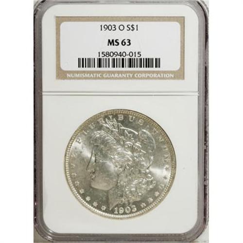 <!-- BEGIN: ICOLLECTOR - EBAY LOT HTML CODE --><style type='text/css'> #icoll_images_thumbnails, #icoll_images_mainimage, #icoll_otherlots { display: none; } div { font-family: arial, verdana, helvetica; } img { border: none; } .icoll_heading_title { background-color: #EFEFFF; color: #000; font-family: arial, verdana, helvetica; font-size: 12pt; font-style: normal; font-weight: bold; } </style><style type='text/css'>@import url(http://www.icollector.com/css/ebay/ebaylot_20070703.css);</style><script language='javascript' type='text/javascript'>function icollfunc_getelement(element_id) { var tmpelement = null; if(document.getElementById) tmpelement = document.getElementById(element_id); if(tmpelement == null) tmpelement = document[element_id]; return tmpelement; }var icollvar_mainpic = null; function icollfunc_initimages() { icollfunc_getelement('mainPicture').style.display = 'none'; icollvar_mainpic = icollfunc_getelement('icoll_images_mainimage'); var body_onload = document.body.attributes['onload']; document.body.setAttribute('onload', (body_onload ? body_onload.nodeValue : '') + 'icollfunc_fixoperaimgbug();'); }function icollfunc_changeimage(imgurl) { if(icollvar_mainpic != null) icollvar_mainpic.src = imgurl; }function icollfunc_fixoperaimgbug() { if(window.opera) { var imgobjs = icollfunc_getelement('icoll_images_thumbnails').getElementsByTagName('img'); for(var i=0; i<imgobjs.length; i++) { var w = imgobjs[i].clientWidth; if(w > 0) imgobjs[i].style.width = w + 'px'; } } }</script><script language='javascript' type='text/javascript'> var useragent = escape(navigator.userAgent); var appname = escape(navigator.appName); var dateobj = new Date(); var datetime = escape(dateobj.getFullYear()+'-'+(dateobj.getMonth()+1)+'-'+dateobj.getDate()+' '+dateobj.getHours()+':'+dateobj.getMinutes()); var referrer = ''; if(document.referrer && document.referrer != null) referrer = escape(document.referrer); new Image().src = 'http://www.icollector.com/stats/ebaylot.ashx?id=7140423&ua='+useragent+'&an='+appname+'&dt='+datetime+'&tz='+dateobj.getTimezoneOffset()+'&re='+referrer;</script><div id='icoll_images'><div id='icoll_images_prev'><a href='http://cgi.liveauctions.ebay.com/ws/eBayISAPI.dll?ViewItem&item=170135059015'><img src='http://www.ha.com/common/proxyImage.php?ebay=445-19013-1-75' alt='' /><img src='http://icollector.com/graphics/ebay_leftarrow.gif' alt='' class='arrow' /></a><div id='icoll_images_prev_info'>Prev Lot</div></div><div id='icoll_images_next'><a href='http://cgi.liveauctions.ebay.com/ws/eBayISAPI.dll?ViewItem&item=170135059024'><img src='http://www.ha.com/common/proxyImage.php?ebay=445-17119-1-75' alt='' /><img src='http://icollector.com/graphics/ebay_rightarrow.gif' alt='' class='arrow' /></a><div id='icoll_images_next_info'>Next Lot</div></div><div id='icoll_images_thumbnails'><a href='http://www.ha.com/common/proxyImage.php?ebay=445-121035-1-75' target='_blank' onmouseover="icollfunc_changeimage('http://www.ha.com/common/proxyImage.php?ebay=445-121035-1-75');"><img src='http://www.ha.com/common/proxyImage.php?ebay=445-121035-1-75' alt='' /></a><a href='http://www.ha.com/common/proxyImage.php?ebay=445-121035-2-75' target='_blank' onmouseover="icollfunc_changeimage('http://www.ha.com/common/proxyImage.php?ebay=445-121035-2-75');"><img src='http://www.ha.com/common/proxyImage.php?ebay=445-121035-2-75' alt='' /></a><div id='icoll_images_thumbnails_info'>Hover thumbnail to view large image below. Click thumbnail to view full image in new window.</div></div><div id='icoll_images_mainimage_container'><img id='icoll_images_mainimage' alt='' src='http://www.ha.com/common/proxyImage.php?ebay=445-121035-1-75'></div></div><script language='javascript' type='text/javascript'>icollfunc_initimages();</script><div id='icoll_description'><B>1903-O $1 MS63 NGC.</B></I> NGC Census: (915/3269). PCGS Population (2253/5444). Mintage: 4,450,000. Numismedia Wsl. Price for NGC/PCGS coin in MS63: $367. (#7286)<BR><BR><B>Coin Engraver:</B> George T. Morgan<BR><BR><b>Shipping:</b> Coins & Currency (<a target="_blank" href="http://www.heritageauctions.com/common/shipping.php">view shipping information</a>\)</div><div id='icoll_notices'><div class='icoll_heading_left'></div><div class='icoll_heading'><div class='icoll_heading_title'>Notices</div></div><div class='icoll_heading_right'></div><div id='icoll_notices_info'><B>Important notice:</B> Heritage usually auctions material at the rate of 200-250 lots per hour. On some occasions eBay Live bid software or the Internet may not be able to keep up with the pace of the auction. We recommend placing a realistic absentee bid now as insurance to avoid disappointment. Occasionally the auctioneer may eliminate or reject an eBay Live bid, and the auctioneer may also reopen a lot after the close of the eBay live bidding (usually because we missed an audience bid), and may reject your bid even if it shows you as the winning bidder. By bidding via eBay Live, you agree that Heritage may award the lot to another bidder at its sole discretion under the circumstances described above or any other reasonable circumstances. Since eBay bids are not shown to us until we open the lot on the floor, we treat those bids just like floor bids. In most cases the floor responds before the eBay bid is presented to us, due to Internet lag time, so for consistency we have made it a policy that floor bids are always considered first over tie eBay live bids. Also please note that all Heritage lots purchased through eBay Live carry a 20% Buyer's Premium with a $9 minimum Buyer's Premium. Please make sure you read the Terms and Conditions before you bid. This lot is being auctioned in conjunction with a live floor auction by Heritage Auctions. All final auction and invoice information will be supplied by Heritage Auctions, and all other information should be considered preliminary. <BR><BR><B>Winning Notification and Billing:</B> After the FINAL session in this auction is complete, Heritag