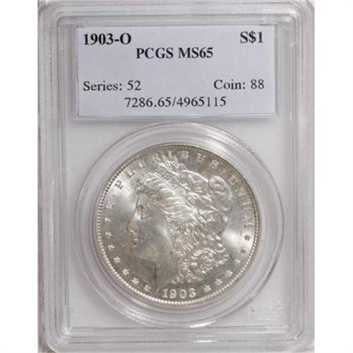 <!-- BEGIN: ICOLLECTOR - EBAY LOT HTML CODE --><style type='text/css'> #icoll_images_thumbnails, #icoll_images_mainimage, #icoll_otherlots { display: none; } div { font-family: arial, verdana, helvetica; } img { border: none; } .icoll_heading_title { background-color: #EFEFFF; color: #000; font-family: arial, verdana, helvetica; font-size: 12pt; font-style: normal; font-weight: bold; } </style><style type='text/css'>@import url(http://www.icollector.com/css/ebay/ebaylot_20070703.css);</style><script language='javascript' type='text/javascript'>function icollfunc_getelement(element_id) { var tmpelement = null; if(document.getElementById) tmpelement = document.getElementById(element_id); if(tmpelement == null) tmpelement = document[element_id]; return tmpelement; }var icollvar_mainpic = null; function icollfunc_initimages() { icollfunc_getelement('mainPicture').style.display = 'none'; icollvar_mainpic = icollfunc_getelement('icoll_images_mainimage'); var body_onload = document.body.attributes['onload']; document.body.setAttribute('onload', (body_onload ? body_onload.nodeValue : '') + 'icollfunc_fixoperaimgbug();'); }function icollfunc_changeimage(imgurl) { if(icollvar_mainpic != null) icollvar_mainpic.src = imgurl; }function icollfunc_fixoperaimgbug() { if(window.opera) { var imgobjs = icollfunc_getelement('icoll_images_thumbnails').getElementsByTagName('img'); for(var i=0; i<imgobjs.length; i++) { var w = imgobjs[i].clientWidth; if(w > 0) imgobjs[i].style.width = w + 'px'; } } }</script><script language='javascript' type='text/javascript'> var useragent = escape(navigator.userAgent); var appname = escape(navigator.appName); var dateobj = new Date(); var datetime = escape(dateobj.getFullYear()+'-'+(dateobj.getMonth()+1)+'-'+dateobj.getDate()+' '+dateobj.getHours()+':'+dateobj.getMinutes()); var referrer = ''; if(document.referrer && document.referrer != null) referrer = escape(document.referrer); new Image().src = 'http://www.icollector.com/stats/ebaylot.ashx?id=7140431&ua='+useragent+'&an='+appname+'&dt='+datetime+'&tz='+dateobj.getTimezoneOffset()+'&re='+referrer;</script><div id='icoll_images'><div id='icoll_images_prev'><a href='http://cgi.liveauctions.ebay.com/ws/eBayISAPI.dll?ViewItem&item=170135059051'><img src='http://www.ha.com/common/proxyImage.php?ebay=445-33006-1-75' alt='' /><img src='http://icollector.com/graphics/ebay_leftarrow.gif' alt='' class='arrow' /></a><div id='icoll_images_prev_info'>Prev Lot</div></div><div id='icoll_images_next'><a href='http://cgi.liveauctions.ebay.com/ws/eBayISAPI.dll?ViewItem&item=170135059061'><img src='http://www.ha.com/common/proxyImage.php?ebay=445-39067-1-75' alt='' /><img src='http://icollector.com/graphics/ebay_rightarrow.gif' alt='' class='arrow' /></a><div id='icoll_images_next_info'>Next Lot</div></div><div id='icoll_images_thumbnails'><a href='http://www.ha.com/common/proxyImage.php?ebay=445-90006-1-75' target='_blank' onmouseover="icollfunc_changeimage('http://www.ha.com/common/proxyImage.php?ebay=445-90006-1-75');"><img src='http://www.ha.com/common/proxyImage.php?ebay=445-90006-1-75' alt='' /></a><a href='http://www.ha.com/common/proxyImage.php?ebay=445-90006-2-75' target='_blank' onmouseover="icollfunc_changeimage('http://www.ha.com/common/proxyImage.php?ebay=445-90006-2-75');"><img src='http://www.ha.com/common/proxyImage.php?ebay=445-90006-2-75' alt='' /></a><div id='icoll_images_thumbnails_info'>Hover thumbnail to view large image below. Click thumbnail to view full image in new window.</div></div><div id='icoll_images_mainimage_container'><img id='icoll_images_mainimage' alt='' src='http://www.ha.com/common/proxyImage.php?ebay=445-90006-1-75'></div></div><script language='javascript' type='text/javascript'>icollfunc_initimages();</script><div id='icoll_description'><B>1903-O $1 MS65 PCGS.</B></I> PCGS Population (1696/525). NGC Census: (1087/315). Mintage: 4,450,000. Numismedia Wsl. Price for NGC/PCGS coin in MS65: $560. (#7286)<BR><BR><B>Coin Engraver:</B> George T. Morgan<BR><BR><b>Shipping:</b> Coins & Currency (<a target="_blank" href="http://www.heritageauctions.com/common/shipping.php">view shipping information</a>\)</div><div id='icoll_notices'><div class='icoll_heading_left'></div><div class='icoll_heading'><div class='icoll_heading_title'>Notices</div></div><div class='icoll_heading_right'></div><div id='icoll_notices_info'><B>Important notice:</B> Heritage usually auctions material at the rate of 200-250 lots per hour. On some occasions eBay Live bid software or the Internet may not be able to keep up with the pace of the auction. We recommend placing a realistic absentee bid now as insurance to avoid disappointment. Occasionally the auctioneer may eliminate or reject an eBay Live bid, and the auctioneer may also reopen a lot after the close of the eBay live bidding (usually because we missed an audience bid), and may reject your bid even if it shows you as the winning bidder. By bidding via eBay Live, you agree that Heritage may award the lot to another bidder at its sole discretion under the circumstances described above or any other reasonable circumstances. Since eBay bids are not shown to us until we open the lot on the floor, we treat those bids just like floor bids. In most cases the floor responds before the eBay bid is presented to us, due to Internet lag time, so for consistency we have made it a policy that floor bids are always considered first over tie eBay live bids. Also please note that all Heritage lots purchased through eBay Live carry a 20% Buyer's Premium with a $9 minimum Buyer's Premium. Please make sure you read the Terms and Conditions before you bid. This lot is being auctioned in conjunction with a live floor auction by Heritage Auctions. All final auction and invoice information will be supplied by Heritage Auctions, and all other information should be considered preliminary. <BR><BR><B>Winning Notification and Billing:</B> After the FINAL session in this auction is complete, Heritage will 