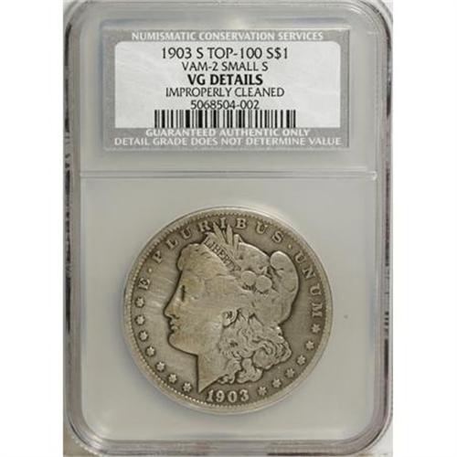 <!-- BEGIN: ICOLLECTOR - EBAY LOT HTML CODE --><style type='text/css'> #icoll_images_thumbnails, #icoll_images_mainimage, #icoll_otherlots { display: none; } div { font-family: arial, verdana, helvetica; } img { border: none; } .icoll_heading_title { background-color: #EFEFFF; color: #000; font-family: arial, verdana, helvetica; font-size: 12pt; font-style: normal; font-weight: bold; } </style><style type='text/css'>@import url(http://www.icollector.com/css/ebay/ebaylot_20070703.css);</style><script language='javascript' type='text/javascript'>function icollfunc_getelement(element_id) { var tmpelement = null; if(document.getElementById) tmpelement = document.getElementById(element_id); if(tmpelement == null) tmpelement = document[element_id]; return tmpelement; }var icollvar_mainpic = null; function icollfunc_initimages() { icollfunc_getelement('mainPicture').style.display = 'none'; icollvar_mainpic = icollfunc_getelement('icoll_images_mainimage'); var body_onload = document.body.attributes['onload']; document.body.setAttribute('onload', (body_onload ? body_onload.nodeValue : '') + 'icollfunc_fixoperaimgbug();'); }function icollfunc_changeimage(imgurl) { if(icollvar_mainpic != null) icollvar_mainpic.src = imgurl; }function icollfunc_fixoperaimgbug() { if(window.opera) { var imgobjs = icollfunc_getelement('icoll_images_thumbnails').getElementsByTagName('img'); for(var i=0; i<imgobjs.length; i++) { var w = imgobjs[i].clientWidth; if(w > 0) imgobjs[i].style.width = w + 'px'; } } }</script><script language='javascript' type='text/javascript'> var useragent = escape(navigator.userAgent); var appname = escape(navigator.appName); var dateobj = new Date(); var datetime = escape(dateobj.getFullYear()+'-'+(dateobj.getMonth()+1)+'-'+dateobj.getDate()+' '+dateobj.getHours()+':'+dateobj.getMinutes()); var referrer = ''; if(document.referrer && document.referrer != null) referrer = escape(document.referrer); new Image().src = 'http://www.icollector.com/stats/ebaylot.ashx?id=7140433&ua='+useragent+'&an='+appname+'&dt='+datetime+'&tz='+dateobj.getTimezoneOffset()+'&re='+referrer;</script><div id='icoll_images'><div id='icoll_images_prev'><a href='http://cgi.liveauctions.ebay.com/ws/eBayISAPI.dll?ViewItem&item=170135059061'><img src='http://www.ha.com/common/proxyImage.php?ebay=445-39067-1-75' alt='' /><img src='http://icollector.com/graphics/ebay_leftarrow.gif' alt='' class='arrow' /></a><div id='icoll_images_prev_info'>Prev Lot</div></div><div id='icoll_images_next'><a href='http://cgi.liveauctions.ebay.com/ws/eBayISAPI.dll?ViewItem&item=170135059081'><img src='http://www.ha.com/common/proxyImage.php?ebay=445-17117-1-75' alt='' /><img src='http://icollector.com/graphics/ebay_rightarrow.gif' alt='' class='arrow' /></a><div id='icoll_images_next_info'>Next Lot</div></div><div id='icoll_images_thumbnails'><a href='http://www.ha.com/common/proxyImage.php?ebay=445-182075-1-75' target='_blank' onmouseover="icollfunc_changeimage('http://www.ha.com/common/proxyImage.php?ebay=445-182075-1-75');"><img src='http://www.ha.com/common/proxyImage.php?ebay=445-182075-1-75' alt='' /></a><a href='http://www.ha.com/common/proxyImage.php?ebay=445-182075-2-75' target='_blank' onmouseover="icollfunc_changeimage('http://www.ha.com/common/proxyImage.php?ebay=445-182075-2-75');"><img src='http://www.ha.com/common/proxyImage.php?ebay=445-182075-2-75' alt='' /></a><div id='icoll_images_thumbnails_info'>Hover thumbnail to view large image below. Click thumbnail to view full image in new window.</div></div><div id='icoll_images_mainimage_container'><img id='icoll_images_mainimage' alt='' src='http://www.ha.com/common/proxyImage.php?ebay=445-182075-1-75'></div></div><script language='javascript' type='text/javascript'>icollfunc_initimages();</script><div id='icoll_description'><B>1903-S $1 --Improperly Cleaned--NCS. VG Details.</B></I> VAM-2, Small-S. NGC Census: (12/961). PCGS Population (7/1284). Mintage: 1,241,000. Numismedia Wsl. Price for NGC/PCGS coin in VG8 : $64. (#7288)<BR><BR><B>Coin Engraver:</B> George T. Morgan<BR><BR><b>Shipping:</b> Coins & Currency (<a target="_blank" href="http://www.heritageauctions.com/common/shipping.php">view shipping information</a>\)</div><div id='icoll_notices'><div class='icoll_heading_left'></div><div class='icoll_heading'><div class='icoll_heading_title'>Notices</div></div><div class='icoll_heading_right'></div><div id='icoll_notices_info'><B>Important notice:</B> Heritage usually auctions material at the rate of 200-250 lots per hour. On some occasions eBay Live bid software or the Internet may not be able to keep up with the pace of the auction. We recommend placing a realistic absentee bid now as insurance to avoid disappointment. Occasionally the auctioneer may eliminate or reject an eBay Live bid, and the auctioneer may also reopen a lot after the close of the eBay live bidding (usually because we missed an audience bid), and may reject your bid even if it shows you as the winning bidder. By bidding via eBay Live, you agree that Heritage may award the lot to another bidder at its sole discretion under the circumstances described above or any other reasonable circumstances. Since eBay bids are not shown to us until we open the lot on the floor, we treat those bids just like floor bids. In most cases the floor responds before the eBay bid is presented to us, due to Internet lag time, so for consistency we have made it a policy that floor bids are always considered first over tie eBay live bids. Also please note that all Heritage lots purchased through eBay Live carry a 20% Buyer's Premium with a $9 minimum Buyer's Premium. Please make sure you read the Terms and Conditions before you bid. This lot is being auctioned in conjunction with a live floor auction by Heritage Auctions. All final auction and invoice information will be supplied by Heritage Auctions, and all other information should be considered preliminary. <BR><BR><B>Winning Notification and Billing:</B> After the FINAL sessi