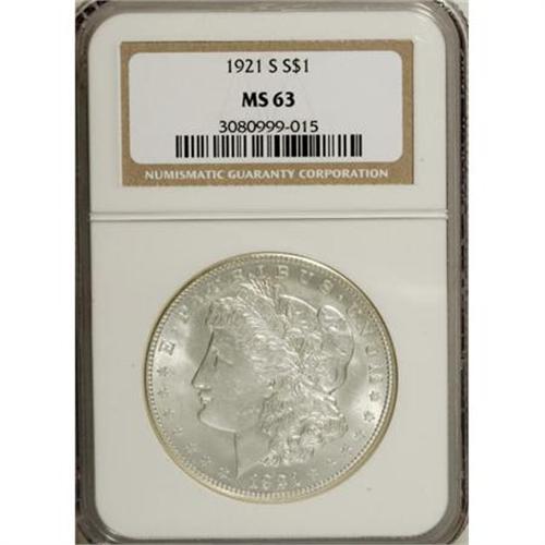 <!-- BEGIN: ICOLLECTOR - EBAY LOT HTML CODE --><style type='text/css'> #icoll_images_thumbnails, #icoll_images_mainimage, #icoll_otherlots { display: none; } div { font-family: arial, verdana, helvetica; } img { border: none; } .icoll_heading_title { background-color: #EFEFFF; color: #000; font-family: arial, verdana, helvetica; font-size: 12pt; font-style: normal; font-weight: bold; } </style><style type='text/css'>@import url(http://www.icollector.com/css/ebay/ebaylot_20070703.css);</style><script language='javascript' type='text/javascript'>function icollfunc_getelement(element_id) { var tmpelement = null; if(document.getElementById) tmpelement = document.getElementById(element_id); if(tmpelement == null) tmpelement = document[element_id]; return tmpelement; }var icollvar_mainpic = null; function icollfunc_initimages() { icollfunc_getelement('mainPicture').style.display = 'none'; icollvar_mainpic = icollfunc_getelement('icoll_images_mainimage'); var body_onload = document.body.attributes['onload']; document.body.setAttribute('onload', (body_onload ? body_onload.nodeValue : '') + 'icollfunc_fixoperaimgbug();'); }function icollfunc_changeimage(imgurl) { if(icollvar_mainpic != null) icollvar_mainpic.src = imgurl; }function icollfunc_fixoperaimgbug() { if(window.opera) { var imgobjs = icollfunc_getelement('icoll_images_thumbnails').getElementsByTagName('img'); for(var i=0; i<imgobjs.length; i++) { var w = imgobjs[i].clientWidth; if(w > 0) imgobjs[i].style.width = w + 'px'; } } }</script><script language='javascript' type='text/javascript'> var useragent = escape(navigator.userAgent); var appname = escape(navigator.appName); var dateobj = new Date(); var datetime = escape(dateobj.getFullYear()+'-'+(dateobj.getMonth()+1)+'-'+dateobj.getDate()+' '+dateobj.getHours()+':'+dateobj.getMinutes()); var referrer = ''; if(document.referrer && document.referrer != null) referrer = escape(document.referrer); new Image().src = 'http://www.icollector.com/stats/ebaylot.ashx?id=7140465&ua='+useragent+'&an='+appname+'&dt='+datetime+'&tz='+dateobj.getTimezoneOffset()+'&re='+referrer;</script><div id='icoll_images'><div id='icoll_images_prev'><a href='http://cgi.liveauctions.ebay.com/ws/eBayISAPI.dll?ViewItem&item=170135059276'><img src='http://www.ha.com/common/proxyImage.php?ebay=445-39007-1-75' alt='' /><img src='http://icollector.com/graphics/ebay_leftarrow.gif' alt='' class='arrow' /></a><div id='icoll_images_prev_info'>Prev Lot</div></div><div id='icoll_images_next'><a href='http://cgi.liveauctions.ebay.com/ws/eBayISAPI.dll?ViewItem&item=170135059290'><img src='http://www.ha.com/common/proxyImage.php?ebay=445-154075-1-75' alt='' /><img src='http://icollector.com/graphics/ebay_rightarrow.gif' alt='' class='arrow' /></a><div id='icoll_images_next_info'>Next Lot</div></div><div id='icoll_images_thumbnails'><a href='http://www.ha.com/common/proxyImage.php?ebay=445-154073-1-75' target='_blank' onmouseover="icollfunc_changeimage('http://www.ha.com/common/proxyImage.php?ebay=445-154073-1-75');"><img src='http://www.ha.com/common/proxyImage.php?ebay=445-154073-1-75' alt='' /></a><a href='http://www.ha.com/common/proxyImage.php?ebay=445-154073-2-75' target='_blank' onmouseover="icollfunc_changeimage('http://www.ha.com/common/proxyImage.php?ebay=445-154073-2-75');"><img src='http://www.ha.com/common/proxyImage.php?ebay=445-154073-2-75' alt='' /></a><div id='icoll_images_thumbnails_info'>Hover thumbnail to view large image below. Click thumbnail to view full image in new window.</div></div><div id='icoll_images_mainimage_container'><img id='icoll_images_mainimage' alt='' src='http://www.ha.com/common/proxyImage.php?ebay=445-154073-1-75'></div></div><script language='javascript' type='text/javascript'>icollfunc_initimages();</script><div id='icoll_description'><B>1921-S $1 MS63 NGC.</B></I> NGC Census: (2228/4763). PCGS Population (2177/3166). Mintage: 21,695,000. Numismedia Wsl. Price for NGC/PCGS coin in MS63: $60. (#7300)<BR><BR><b>Shipping:</b> Coins & Currency (<a target="_blank" href="http://www.heritageauctions.com/common/shipping.php">view shipping information</a>\)</div><div id='icoll_notices'><div class='icoll_heading_left'></div><div class='icoll_heading'><div class='icoll_heading_title'>Notices</div></div><div class='icoll_heading_right'></div><div id='icoll_notices_info'><B>Important notice:</B> Heritage usually auctions material at the rate of 200-250 lots per hour. On some occasions eBay Live bid software or the Internet may not be able to keep up with the pace of the auction. We recommend placing a realistic absentee bid now as insurance to avoid disappointment. Occasionally the auctioneer may eliminate or reject an eBay Live bid, and the auctioneer may also reopen a lot after the close of the eBay live bidding (usually because we missed an audience bid), and may reject your bid even if it shows you as the winning bidder. By bidding via eBay Live, you agree that Heritage may award the lot to another bidder at its sole discretion under the circumstances described above or any other reasonable circumstances. Since eBay bids are not shown to us until we open the lot on the floor, we treat those bids just like floor bids. In most cases the floor responds before the eBay bid is presented to us, due to Internet lag time, so for consistency we have made it a policy that floor bids are always considered first over tie eBay live bids. Also please note that all Heritage lots purchased through eBay Live carry a 20% Buyer's Premium with a $9 minimum Buyer's Premium. Please make sure you read the Terms and Conditions before you bid. This lot is being auctioned in conjunction with a live floor auction by Heritage Auctions. All final auction and invoice information will be supplied by Heritage Auctions, and all other information should be considered preliminary. <BR><BR><B>Winning Notification and Billing:</B> After the FINAL session in this auction is complete, Heritage will send e-mail and snail mail invoices. 