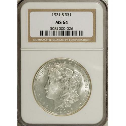 <!-- BEGIN: ICOLLECTOR - EBAY LOT HTML CODE --><style type='text/css'> #icoll_images_thumbnails, #icoll_images_mainimage, #icoll_otherlots { display: none; } div { font-family: arial, verdana, helvetica; } img { border: none; } .icoll_heading_title { background-color: #EFEFFF; color: #000; font-family: arial, verdana, helvetica; font-size: 12pt; font-style: normal; font-weight: bold; } </style><style type='text/css'>@import url(http://www.icollector.com/css/ebay/ebaylot_20070703.css);</style><script language='javascript' type='text/javascript'>function icollfunc_getelement(element_id) { var tmpelement = null; if(document.getElementById) tmpelement = document.getElementById(element_id); if(tmpelement == null) tmpelement = document[element_id]; return tmpelement; }var icollvar_mainpic = null; function icollfunc_initimages() { icollfunc_getelement('mainPicture').style.display = 'none'; icollvar_mainpic = icollfunc_getelement('icoll_images_mainimage'); var body_onload = document.body.attributes['onload']; document.body.setAttribute('onload', (body_onload ? body_onload.nodeValue : '') + 'icollfunc_fixoperaimgbug();'); }function icollfunc_changeimage(imgurl) { if(icollvar_mainpic != null) icollvar_mainpic.src = imgurl; }function icollfunc_fixoperaimgbug() { if(window.opera) { var imgobjs = icollfunc_getelement('icoll_images_thumbnails').getElementsByTagName('img'); for(var i=0; i<imgobjs.length; i++) { var w = imgobjs[i].clientWidth; if(w > 0) imgobjs[i].style.width = w + 'px'; } } }</script><script language='javascript' type='text/javascript'> var useragent = escape(navigator.userAgent); var appname = escape(navigator.appName); var dateobj = new Date(); var datetime = escape(dateobj.getFullYear()+'-'+(dateobj.getMonth()+1)+'-'+dateobj.getDate()+' '+dateobj.getHours()+':'+dateobj.getMinutes()); var referrer = ''; if(document.referrer && document.referrer != null) referrer = escape(document.referrer); new Image().src = 'http://www.icollector.com/stats/ebaylot.ashx?id=7140466&ua='+useragent+'&an='+appname+'&dt='+datetime+'&tz='+dateobj.getTimezoneOffset()+'&re='+referrer;</script><div id='icoll_images'><div id='icoll_images_prev'><a href='http://cgi.liveauctions.ebay.com/ws/eBayISAPI.dll?ViewItem&item=170135059277'><img src='http://www.ha.com/common/proxyImage.php?ebay=445-154073-1-75' alt='' /><img src='http://icollector.com/graphics/ebay_leftarrow.gif' alt='' class='arrow' /></a><div id='icoll_images_prev_info'>Prev Lot</div></div><div id='icoll_images_next'><a href='http://cgi.liveauctions.ebay.com/ws/eBayISAPI.dll?ViewItem&item=170135059295'><img src='http://www.ha.com/common/proxyImage.php?ebay=445-39054-1-75' alt='' /><img src='http://icollector.com/graphics/ebay_rightarrow.gif' alt='' class='arrow' /></a><div id='icoll_images_next_info'>Next Lot</div></div><div id='icoll_images_thumbnails'><a href='http://www.ha.com/common/proxyImage.php?ebay=445-154075-1-75' target='_blank' onmouseover="icollfunc_changeimage('http://www.ha.com/common/proxyImage.php?ebay=445-154075-1-75');"><img src='http://www.ha.com/common/proxyImage.php?ebay=445-154075-1-75' alt='' /></a><a href='http://www.ha.com/common/proxyImage.php?ebay=445-154075-2-75' target='_blank' onmouseover="icollfunc_changeimage('http://www.ha.com/common/proxyImage.php?ebay=445-154075-2-75');"><img src='http://www.ha.com/common/proxyImage.php?ebay=445-154075-2-75' alt='' /></a><div id='icoll_images_thumbnails_info'>Hover thumbnail to view large image below. Click thumbnail to view full image in new window.</div></div><div id='icoll_images_mainimage_container'><img id='icoll_images_mainimage' alt='' src='http://www.ha.com/common/proxyImage.php?ebay=445-154075-1-75'></div></div><script language='javascript' type='text/javascript'>icollfunc_initimages();</script><div id='icoll_description'><B>1921-S $1 MS64 NGC.</B></I> NGC Census: (4082/681). PCGS Population (2525/641). Mintage: 21,695,000. Numismedia Wsl. Price for NGC/PCGS coin in MS64: $132. (#7300)<BR><BR><b>Shipping:</b> Coins & Currency (<a target="_blank" href="http://www.heritageauctions.com/common/shipping.php">view shipping information</a>\)</div><div id='icoll_notices'><div class='icoll_heading_left'></div><div class='icoll_heading'><div class='icoll_heading_title'>Notices</div></div><div class='icoll_heading_right'></div><div id='icoll_notices_info'><B>Important notice:</B> Heritage usually auctions material at the rate of 200-250 lots per hour. On some occasions eBay Live bid software or the Internet may not be able to keep up with the pace of the auction. We recommend placing a realistic absentee bid now as insurance to avoid disappointment. Occasionally the auctioneer may eliminate or reject an eBay Live bid, and the auctioneer may also reopen a lot after the close of the eBay live bidding (usually because we missed an audience bid), and may reject your bid even if it shows you as the winning bidder. By bidding via eBay Live, you agree that Heritage may award the lot to another bidder at its sole discretion under the circumstances described above or any other reasonable circumstances. Since eBay bids are not shown to us until we open the lot on the floor, we treat those bids just like floor bids. In most cases the floor responds before the eBay bid is presented to us, due to Internet lag time, so for consistency we have made it a policy that floor bids are always considered first over tie eBay live bids. Also please note that all Heritage lots purchased through eBay Live carry a 20% Buyer's Premium with a $9 minimum Buyer's Premium. Please make sure you read the Terms and Conditions before you bid. This lot is being auctioned in conjunction with a live floor auction by Heritage Auctions. All final auction and invoice information will be supplied by Heritage Auctions, and all other information should be considered preliminary. <BR><BR><B>Winning Notification and Billing:</B> After the FINAL session in this auction is complete, Heritage will send e-mail and snail mail invoices. T