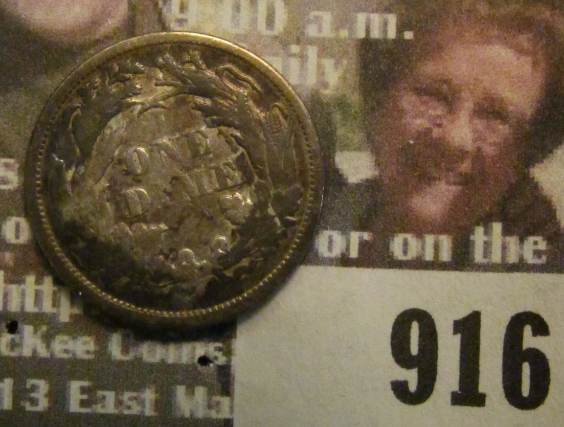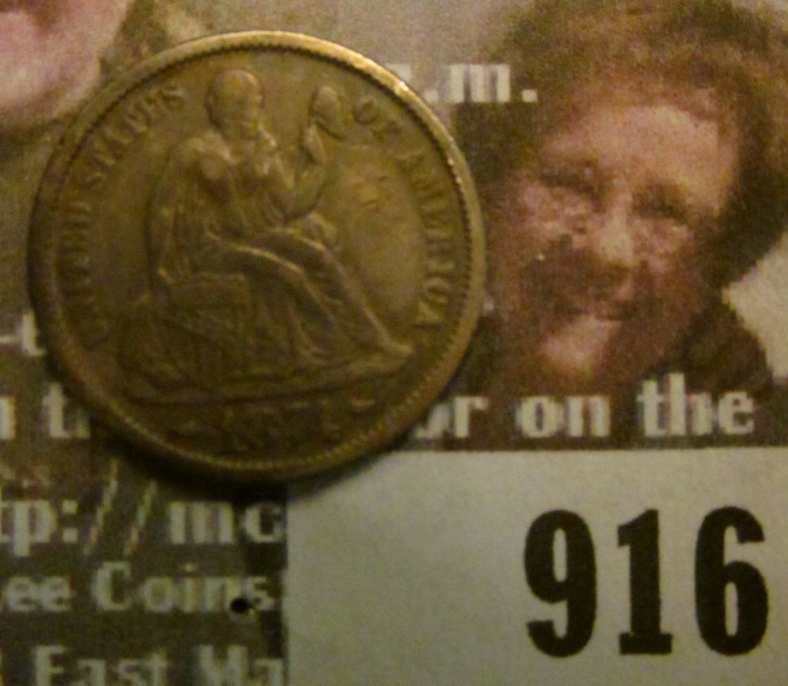 916 _ 1874 P Arrows at date U.S. Liberty Seated Dime, Very Fine.