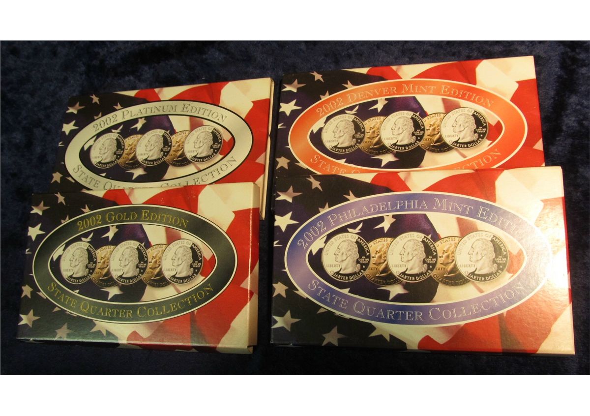 916. 2002 Philadelphia, Denver. Gold & Platinum State Hood Quarter Sets. In Display Cases.
