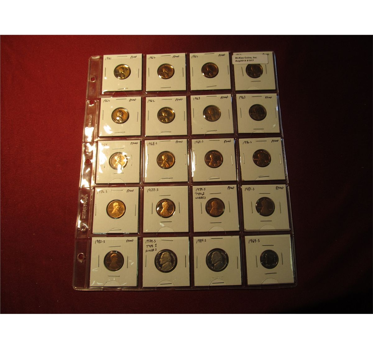 917. 20 proof coins in 2x2s, mostly pennies, includes 2 nickels and a dime, dates range from 1961 to 1984-S