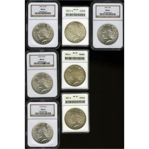 <!-- BEGIN: ICOLLECTOR - EBAY LOT HTML CODE --><style type='text/css'> #icoll_images_thumbnails, #icoll_images_mainimage, #icoll_otherlots { display: none; } div { font-family: arial, verdana, helvetica; } img { border: none; } .icoll_heading_title { background-color: #EFEFFF; color: #000; font-family: arial, verdana, helvetica; font-size: 12pt; font-style: normal; font-weight: bold; } </style><style type='text/css'>@import url(http://www.icollector.com/css/ebay/ebaylot_20070703.css);</style><script language='javascript' type='text/javascript'>function icollfunc_getelement(element_id) { var tmpelement = null; if(document.getElementById) tmpelement = document.getElementById(element_id); if(tmpelement == null) tmpelement = document[element_id]; return tmpelement; }var icollvar_mainpic = null; function icollfunc_initimages() { icollfunc_getelement('mainPicture').style.display = 'none'; icollvar_mainpic = icollfunc_getelement('icoll_images_mainimage'); var body_onload = document.body.attributes['onload']; document.body.setAttribute('onload', (body_onload ? body_onload.nodeValue : '') + 'icollfunc_fixoperaimgbug();'); }function icollfunc_changeimage(imgurl) { if(icollvar_mainpic != null) icollvar_mainpic.src = imgurl; }function icollfunc_fixoperaimgbug() { if(window.opera) { var imgobjs = icollfunc_getelement('icoll_images_thumbnails').getElementsByTagName('img'); for(var i=0; i<imgobjs.length; i++) { var w = imgobjs[i].clientWidth; if(w > 0) imgobjs[i].style.width = w + 'px'; } } }</script><script language='javascript' type='text/javascript'> var useragent = escape(navigator.userAgent); var appname = escape(navigator.appName); var dateobj = new Date(); var datetime = escape(dateobj.getFullYear()+'-'+(dateobj.getMonth()+1)+'-'+dateobj.getDate()+' '+dateobj.getHours()+':'+dateobj.getMinutes()); var referrer = ''; if(document.referrer && document.referrer != null) referrer = escape(document.referrer); new Image().src = 'http://www.icollector.com/stats/ebaylot.ashx?id=7140481&ua='+useragent+'&an='+appname+'&dt='+datetime+'&tz='+dateobj.getTimezoneOffset()+'&re='+referrer;</script><div id='icoll_images'><div id='icoll_images_prev'><a href='http://cgi.liveauctions.ebay.com/ws/eBayISAPI.dll?ViewItem&item=170135059383'><img src='http://www.ha.com/common/proxyImage.php?ebay=445-129008-1-75' alt='' /><img src='http://icollector.com/graphics/ebay_leftarrow.gif' alt='' class='arrow' /></a><div id='icoll_images_prev_info'>Prev Lot</div></div><div id='icoll_images_next'><a href='http://cgi.liveauctions.ebay.com/ws/eBayISAPI.dll?ViewItem&item=170135059402'><img src='http://www.ha.com/common/proxyImage.php?ebay=445-1164-1-75' alt='' /><img src='http://icollector.com/graphics/ebay_rightarrow.gif' alt='' class='arrow' /></a><div id='icoll_images_next_info'>Next Lot</div></div><div id='icoll_images_thumbnails'><a href='http://www.ha.com/common/proxyImage.php?ebay=445-154080-1-75' target='_blank' onmouseover="icollfunc_changeimage('http://www.ha.com/common/proxyImage.php?ebay=445-154080-1-75');"><img src='http://www.ha.com/common/proxyImage.php?ebay=445-154080-1-75' alt='' /></a><a href='http://www.ha.com/common/proxyImage.php?ebay=445-154080-2-75' target='_blank' onmouseover="icollfunc_changeimage('http://www.ha.com/common/proxyImage.php?ebay=445-154080-2-75');"><img src='http://www.ha.com/common/proxyImage.php?ebay=445-154080-2-75' alt='' /></a><div id='icoll_images_thumbnails_info'>Hover thumbnail to view large image below. Click thumbnail to view full image in new window.</div></div><div id='icoll_images_mainimage_container'><img id='icoll_images_mainimage' alt='' src='http://www.ha.com/common/proxyImage.php?ebay=445-154080-1-75'></div></div><script language='javascript' type='text/javascript'>icollfunc_initimages();</script><div id='icoll_description'><B>1922-D $1 MS63 NGC; 1922-D MS63 NGC; 1923-D MS62 NGC; 1923-S MS63 ANACS; 1926 MS63 ANACS; 1927 MS62 ANACS; </B></I>and a <B>1927 MS61 NGC.</B></I><BR><BR><B>Coin Engraver:</B> Anthony de Francisci<BR><BR><b>Shipping:</b> Coins & Currency (<a target="_blank" href="http://www.heritageauctions.com/common/shipping.php">view shipping information</a>\)</div><div id='icoll_notices'><div class='icoll_heading_left'></div><div class='icoll_heading'><div class='icoll_heading_title'>Notices</div></div><div class='icoll_heading_right'></div><div id='icoll_notices_info'><B>Important notice:</B> Heritage usually auctions material at the rate of 200-250 lots per hour. On some occasions eBay Live bid software or the Internet may not be able to keep up with the pace of the auction. We recommend placing a realistic absentee bid now as insurance to avoid disappointment. Occasionally the auctioneer may eliminate or reject an eBay Live bid, and the auctioneer may also reopen a lot after the close of the eBay live bidding (usually because we missed an audience bid), and may reject your bid even if it shows you as the winning bidder. By bidding via eBay Live, you agree that Heritage may award the lot to another bidder at its sole discretion under the circumstances described above or any other reasonable circumstances. Since eBay bids are not shown to us until we open the lot on the floor, we treat those bids just like floor bids. In most cases the floor responds before the eBay bid is presented to us, due to Internet lag time, so for consistency we have made it a policy that floor bids are always considered first over tie eBay live bids. Also please note that all Heritage lots purchased through eBay Live carry a 20% Buyer's Premium with a $9 minimum Buyer's Premium. Please make sure you read the Terms and Conditions before you bid. This lot is being auctioned in conjunction with a live floor auction by Heritage Auctions. All final auction and invoice information will be supplied by Heritage Auctions, and all other information should be considered preliminary. <BR><BR><B>Winning Notification and Billing:</B> After the FINAL session in this auction is complete, Heritage will send e