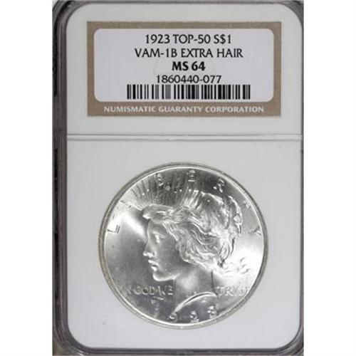 <!-- BEGIN: ICOLLECTOR - EBAY LOT HTML CODE --><style type='text/css'> #icoll_images_thumbnails, #icoll_images_mainimage, #icoll_otherlots { display: none; } div { font-family: arial, verdana, helvetica; } img { border: none; } .icoll_heading_title { background-color: #EFEFFF; color: #000; font-family: arial, verdana, helvetica; font-size: 12pt; font-style: normal; font-weight: bold; } </style><style type='text/css'>@import url(http://www.icollector.com/css/ebay/ebaylot_20070703.css);</style><script language='javascript' type='text/javascript'>function icollfunc_getelement(element_id) { var tmpelement = null; if(document.getElementById) tmpelement = document.getElementById(element_id); if(tmpelement == null) tmpelement = document[element_id]; return tmpelement; }var icollvar_mainpic = null; function icollfunc_initimages() { icollfunc_getelement('mainPicture').style.display = 'none'; icollvar_mainpic = icollfunc_getelement('icoll_images_mainimage'); var body_onload = document.body.attributes['onload']; document.body.setAttribute('onload', (body_onload ? body_onload.nodeValue : '') + 'icollfunc_fixoperaimgbug();'); }function icollfunc_changeimage(imgurl) { if(icollvar_mainpic != null) icollvar_mainpic.src = imgurl; }function icollfunc_fixoperaimgbug() { if(window.opera) { var imgobjs = icollfunc_getelement('icoll_images_thumbnails').getElementsByTagName('img'); for(var i=0; i<imgobjs.length; i++) { var w = imgobjs[i].clientWidth; if(w > 0) imgobjs[i].style.width = w + 'px'; } } }</script><script language='javascript' type='text/javascript'> var useragent = escape(navigator.userAgent); var appname = escape(navigator.appName); var dateobj = new Date(); var datetime = escape(dateobj.getFullYear()+'-'+(dateobj.getMonth()+1)+'-'+dateobj.getDate()+' '+dateobj.getHours()+':'+dateobj.getMinutes()); var referrer = ''; if(document.referrer && document.referrer != null) referrer = escape(document.referrer); new Image().src = 'http://www.icollector.com/stats/ebaylot.ashx?id=7140484&ua='+useragent+'&an='+appname+'&dt='+datetime+'&tz='+dateobj.getTimezoneOffset()+'&re='+referrer;</script><div id='icoll_images'><div id='icoll_images_prev'><a href='http://cgi.liveauctions.ebay.com/ws/eBayISAPI.dll?ViewItem&item=170135059421'><img src='http://www.ha.com/common/proxyImage.php?ebay=445-1332-1-75' alt='' /><img src='http://icollector.com/graphics/ebay_leftarrow.gif' alt='' class='arrow' /></a><div id='icoll_images_prev_info'>Prev Lot</div></div><div id='icoll_images_next'><a href='http://cgi.liveauctions.ebay.com/ws/eBayISAPI.dll?ViewItem&item=170135059437'><img src='http://www.ha.com/common/proxyImage.php?ebay=445-1514-1-75' alt='' /><img src='http://icollector.com/graphics/ebay_rightarrow.gif' alt='' class='arrow' /></a><div id='icoll_images_next_info'>Next Lot</div></div><div id='icoll_images_thumbnails'><a href='http://www.ha.com/common/proxyImage.php?ebay=445-154074-1-75' target='_blank' onmouseover="icollfunc_changeimage('http://www.ha.com/common/proxyImage.php?ebay=445-154074-1-75');"><img src='http://www.ha.com/common/proxyImage.php?ebay=445-154074-1-75' alt='' /></a><a href='http://www.ha.com/common/proxyImage.php?ebay=445-154074-2-75' target='_blank' onmouseover="icollfunc_changeimage('http://www.ha.com/common/proxyImage.php?ebay=445-154074-2-75');"><img src='http://www.ha.com/common/proxyImage.php?ebay=445-154074-2-75' alt='' /></a><div id='icoll_images_thumbnails_info'>Hover thumbnail to view large image below. Click thumbnail to view full image in new window.</div></div><div id='icoll_images_mainimage_container'><img id='icoll_images_mainimage' alt='' src='http://www.ha.com/common/proxyImage.php?ebay=445-154074-1-75'></div></div><script language='javascript' type='text/javascript'>icollfunc_initimages();</script><div id='icoll_description'><B>1923 $1 MS64 NGC.</B></I> VAM-1B, Extra Hair. A top 50 variety. NGC Census: (91010/24319). PCGS Population (51345/13351). Mintage: 30,800,000. Numismedia Wsl. Price for NGC/PCGS coin in MS64: $40. (#7360)<BR><BR><B>Coin Engraver:</B> Anthony de Francisci<BR><BR><b>Shipping:</b> Coins & Currency (<a target="_blank" href="http://www.heritageauctions.com/common/shipping.php">view shipping information</a>\)</div><div id='icoll_notices'><div class='icoll_heading_left'></div><div class='icoll_heading'><div class='icoll_heading_title'>Notices</div></div><div class='icoll_heading_right'></div><div id='icoll_notices_info'><B>Important notice:</B> Heritage usually auctions material at the rate of 200-250 lots per hour. On some occasions eBay Live bid software or the Internet may not be able to keep up with the pace of the auction. We recommend placing a realistic absentee bid now as insurance to avoid disappointment. Occasionally the auctioneer may eliminate or reject an eBay Live bid, and the auctioneer may also reopen a lot after the close of the eBay live bidding (usually because we missed an audience bid), and may reject your bid even if it shows you as the winning bidder. By bidding via eBay Live, you agree that Heritage may award the lot to another bidder at its sole discretion under the circumstances described above or any other reasonable circumstances. Since eBay bids are not shown to us until we open the lot on the floor, we treat those bids just like floor bids. In most cases the floor responds before the eBay bid is presented to us, due to Internet lag time, so for consistency we have made it a policy that floor bids are always considered first over tie eBay live bids. Also please note that all Heritage lots purchased through eBay Live carry a 20% Buyer's Premium with a $9 minimum Buyer's Premium. Please make sure you read the Terms and Conditions before you bid. This lot is being auctioned in conjunction with a live floor auction by Heritage Auctions. All final auction and invoice information will be supplied by Heritage Auctions, and all other information should be considered preliminary. <BR><BR><B>Winning Notification and Billing:</B> After the FINAL s