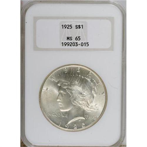 <!-- BEGIN: ICOLLECTOR - EBAY LOT HTML CODE --><style type='text/css'> #icoll_images_thumbnails, #icoll_images_mainimage, #icoll_otherlots { display: none; } div { font-family: arial, verdana, helvetica; } img { border: none; } .icoll_heading_title { background-color: #EFEFFF; color: #000; font-family: arial, verdana, helvetica; font-size: 12pt; font-style: normal; font-weight: bold; } </style><style type='text/css'>@import url(http://www.icollector.com/css/ebay/ebaylot_20070703.css);</style><script language='javascript' type='text/javascript'>function icollfunc_getelement(element_id) { var tmpelement = null; if(document.getElementById) tmpelement = document.getElementById(element_id); if(tmpelement == null) tmpelement = document[element_id]; return tmpelement; }var icollvar_mainpic = null; function icollfunc_initimages() { icollfunc_getelement('mainPicture').style.display = 'none'; icollvar_mainpic = icollfunc_getelement('icoll_images_mainimage'); var body_onload = document.body.attributes['onload']; document.body.setAttribute('onload', (body_onload ? body_onload.nodeValue : '') + 'icollfunc_fixoperaimgbug();'); }function icollfunc_changeimage(imgurl) { if(icollvar_mainpic != null) icollvar_mainpic.src = imgurl; }function icollfunc_fixoperaimgbug() { if(window.opera) { var imgobjs = icollfunc_getelement('icoll_images_thumbnails').getElementsByTagName('img'); for(var i=0; i<imgobjs.length; i++) { var w = imgobjs[i].clientWidth; if(w > 0) imgobjs[i].style.width = w + 'px'; } } }</script><script language='javascript' type='text/javascript'> var useragent = escape(navigator.userAgent); var appname = escape(navigator.appName); var dateobj = new Date(); var datetime = escape(dateobj.getFullYear()+'-'+(dateobj.getMonth()+1)+'-'+dateobj.getDate()+' '+dateobj.getHours()+':'+dateobj.getMinutes()); var referrer = ''; if(document.referrer && document.referrer != null) referrer = escape(document.referrer); new Image().src = 'http://www.icollector.com/stats/ebaylot.ashx?id=7140494&ua='+useragent+'&an='+appname+'&dt='+datetime+'&tz='+dateobj.getTimezoneOffset()+'&re='+referrer;</script><div id='icoll_images'><div id='icoll_images_prev'><a href='http://cgi.liveauctions.ebay.com/ws/eBayISAPI.dll?ViewItem&item=170135059505'><img src='http://www.ha.com/common/proxyImage.php?ebay=445-1061-1-75' alt='' /><img src='http://icollector.com/graphics/ebay_leftarrow.gif' alt='' class='arrow' /></a><div id='icoll_images_prev_info'>Prev Lot</div></div><div id='icoll_images_next'><a href='http://cgi.liveauctions.ebay.com/ws/eBayISAPI.dll?ViewItem&item=170135059513'><img src='http://www.ha.com/common/proxyImage.php?ebay=445-3062-1-75' alt='' /><img src='http://icollector.com/graphics/ebay_rightarrow.gif' alt='' class='arrow' /></a><div id='icoll_images_next_info'>Next Lot</div></div><div id='icoll_images_thumbnails'><a href='http://www.ha.com/common/proxyImage.php?ebay=445-1557-1-75' target='_blank' onmouseover="icollfunc_changeimage('http://www.ha.com/common/proxyImage.php?ebay=445-1557-1-75');"><img src='http://www.ha.com/common/proxyImage.php?ebay=445-1557-1-75' alt='' /></a><a href='http://www.ha.com/common/proxyImage.php?ebay=445-1557-2-75' target='_blank' onmouseover="icollfunc_changeimage('http://www.ha.com/common/proxyImage.php?ebay=445-1557-2-75');"><img src='http://www.ha.com/common/proxyImage.php?ebay=445-1557-2-75' alt='' /></a><div id='icoll_images_thumbnails_info'>Hover thumbnail to view large image below. Click thumbnail to view full image in new window.</div></div><div id='icoll_images_mainimage_container'><img id='icoll_images_mainimage' alt='' src='http://www.ha.com/common/proxyImage.php?ebay=445-1557-1-75'></div></div><script language='javascript' type='text/javascript'>icollfunc_initimages();</script><div id='icoll_description'><B>1925 $1 MS65 NGC.</B></I> NGC Census: (6893/1008). PCGS Population (5298/1247). Mintage: 10,198,000. Numismedia Wsl. Price for NGC/PCGS coin in MS65: $140. (#7365)<BR><BR><B>Coin Engraver:</B> Anthony de Francisci<BR><BR><b>Shipping:</b> Coins & Currency (<a target="_blank" href="http://www.heritageauctions.com/common/shipping.php">view shipping information</a>\)</div><div id='icoll_notices'><div class='icoll_heading_left'></div><div class='icoll_heading'><div class='icoll_heading_title'>Notices</div></div><div class='icoll_heading_right'></div><div id='icoll_notices_info'><B>Important notice:</B> Heritage usually auctions material at the rate of 200-250 lots per hour. On some occasions eBay Live bid software or the Internet may not be able to keep up with the pace of the auction. We recommend placing a realistic absentee bid now as insurance to avoid disappointment. Occasionally the auctioneer may eliminate or reject an eBay Live bid, and the auctioneer may also reopen a lot after the close of the eBay live bidding (usually because we missed an audience bid), and may reject your bid even if it shows you as the winning bidder. By bidding via eBay Live, you agree that Heritage may award the lot to another bidder at its sole discretion under the circumstances described above or any other reasonable circumstances. Since eBay bids are not shown to us until we open the lot on the floor, we treat those bids just like floor bids. In most cases the floor responds before the eBay bid is presented to us, due to Internet lag time, so for consistency we have made it a policy that floor bids are always considered first over tie eBay live bids. Also please note that all Heritage lots purchased through eBay Live carry a 20% Buyer's Premium with a $9 minimum Buyer's Premium. Please make sure you read the Terms and Conditions before you bid. This lot is being auctioned in conjunction with a live floor auction by Heritage Auctions. All final auction and invoice information will be supplied by Heritage Auctions, and all other information should be considered preliminary. <BR><BR><B>Winning Notification and Billing:</B> After the FINAL session in this auction is complete, Heritage will send 