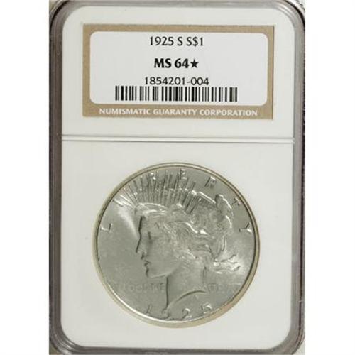 <!-- BEGIN: ICOLLECTOR - EBAY LOT HTML CODE --><style type='text/css'> #icoll_images_thumbnails, #icoll_images_mainimage, #icoll_otherlots { display: none; } div { font-family: arial, verdana, helvetica; } img { border: none; } .icoll_heading_title { background-color: #EFEFFF; color: #000; font-family: arial, verdana, helvetica; font-size: 12pt; font-style: normal; font-weight: bold; } </style><style type='text/css'>@import url(http://www.icollector.com/css/ebay/ebaylot_20070703.css);</style><script language='javascript' type='text/javascript'>function icollfunc_getelement(element_id) { var tmpelement = null; if(document.getElementById) tmpelement = document.getElementById(element_id); if(tmpelement == null) tmpelement = document[element_id]; return tmpelement; }var icollvar_mainpic = null; function icollfunc_initimages() { icollfunc_getelement('mainPicture').style.display = 'none'; icollvar_mainpic = icollfunc_getelement('icoll_images_mainimage'); var body_onload = document.body.attributes['onload']; document.body.setAttribute('onload', (body_onload ? body_onload.nodeValue : '') + 'icollfunc_fixoperaimgbug();'); }function icollfunc_changeimage(imgurl) { if(icollvar_mainpic != null) icollvar_mainpic.src = imgurl; }function icollfunc_fixoperaimgbug() { if(window.opera) { var imgobjs = icollfunc_getelement('icoll_images_thumbnails').getElementsByTagName('img'); for(var i=0; i<imgobjs.length; i++) { var w = imgobjs[i].clientWidth; if(w > 0) imgobjs[i].style.width = w + 'px'; } } }</script><script language='javascript' type='text/javascript'> var useragent = escape(navigator.userAgent); var appname = escape(navigator.appName); var dateobj = new Date(); var datetime = escape(dateobj.getFullYear()+'-'+(dateobj.getMonth()+1)+'-'+dateobj.getDate()+' '+dateobj.getHours()+':'+dateobj.getMinutes()); var referrer = ''; if(document.referrer && document.referrer != null) referrer = escape(document.referrer); new Image().src = 'http://www.icollector.com/stats/ebaylot.ashx?id=7140498&ua='+useragent+'&an='+appname+'&dt='+datetime+'&tz='+dateobj.getTimezoneOffset()+'&re='+referrer;</script><div id='icoll_images'><div id='icoll_images_prev'><a href='http://cgi.liveauctions.ebay.com/ws/eBayISAPI.dll?ViewItem&item=170135059520'><img src='http://www.ha.com/common/proxyImage.php?ebay=445-122014-1-75' alt='' /><img src='http://icollector.com/graphics/ebay_leftarrow.gif' alt='' class='arrow' /></a><div id='icoll_images_prev_info'>Prev Lot</div></div><div id='icoll_images_next'><a href='http://cgi.liveauctions.ebay.com/ws/eBayISAPI.dll?ViewItem&item=170135059524'><img src='http://www.ha.com/common/proxyImage.php?ebay=445-154046-1-75' alt='' /><img src='http://icollector.com/graphics/ebay_rightarrow.gif' alt='' class='arrow' /></a><div id='icoll_images_next_info'>Next Lot</div></div><div id='icoll_images_thumbnails'><a href='http://www.ha.com/common/proxyImage.php?ebay=445-9010-1-75' target='_blank' onmouseover="icollfunc_changeimage('http://www.ha.com/common/proxyImage.php?ebay=445-9010-1-75');"><img src='http://www.ha.com/common/proxyImage.php?ebay=445-9010-1-75' alt='' /></a><a href='http://www.ha.com/common/proxyImage.php?ebay=445-9010-2-75' target='_blank' onmouseover="icollfunc_changeimage('http://www.ha.com/common/proxyImage.php?ebay=445-9010-2-75');"><img src='http://www.ha.com/common/proxyImage.php?ebay=445-9010-2-75' alt='' /></a><div id='icoll_images_thumbnails_info'>Hover thumbnail to view large image below. Click thumbnail to view full image in new window.</div></div><div id='icoll_images_mainimage_container'><img id='icoll_images_mainimage' alt='' src='http://www.ha.com/common/proxyImage.php?ebay=445-9010-1-75'></div></div><script language='javascript' type='text/javascript'>icollfunc_initimages();</script><div id='icoll_description'><B></B></I> <B>1925-S $1 MS64 <img border='0' src='http://www.heritagecoins.com/images/star.gif' width=10 height=10> NGC.</B></I> NGC Census: (1354/50). PCGS Population (1332/37). Mintage: 1,610,000. Numismedia Wsl. Price for NGC/PCGS coin in MS64: $520. (#7366)<BR><BR><B>Coin Engraver:</B> Anthony de Francisci<BR><BR><b>Shipping:</b> Coins & Currency (<a target="_blank" href="http://www.heritageauctions.com/common/shipping.php">view shipping information</a>\)</div><div id='icoll_notices'><div class='icoll_heading_left'></div><div class='icoll_heading'><div class='icoll_heading_title'>Notices</div></div><div class='icoll_heading_right'></div><div id='icoll_notices_info'><B>Important notice:</B> Heritage usually auctions material at the rate of 200-250 lots per hour. On some occasions eBay Live bid software or the Internet may not be able to keep up with the pace of the auction. We recommend placing a realistic absentee bid now as insurance to avoid disappointment. Occasionally the auctioneer may eliminate or reject an eBay Live bid, and the auctioneer may also reopen a lot after the close of the eBay live bidding (usually because we missed an audience bid), and may reject your bid even if it shows you as the winning bidder. By bidding via eBay Live, you agree that Heritage may award the lot to another bidder at its sole discretion under the circumstances described above or any other reasonable circumstances. Since eBay bids are not shown to us until we open the lot on the floor, we treat those bids just like floor bids. In most cases the floor responds before the eBay bid is presented to us, due to Internet lag time, so for consistency we have made it a policy that floor bids are always considered first over tie eBay live bids. Also please note that all Heritage lots purchased through eBay Live carry a 20% Buyer's Premium with a $9 minimum Buyer's Premium. Please make sure you read the Terms and Conditions before you bid. This lot is being auctioned in conjunction with a live floor auction by Heritage Auctions. All final auction and invoice information will be supplied by Heritage Auctions, and all other information should be considered preliminary. <BR><BR><B>Winning No