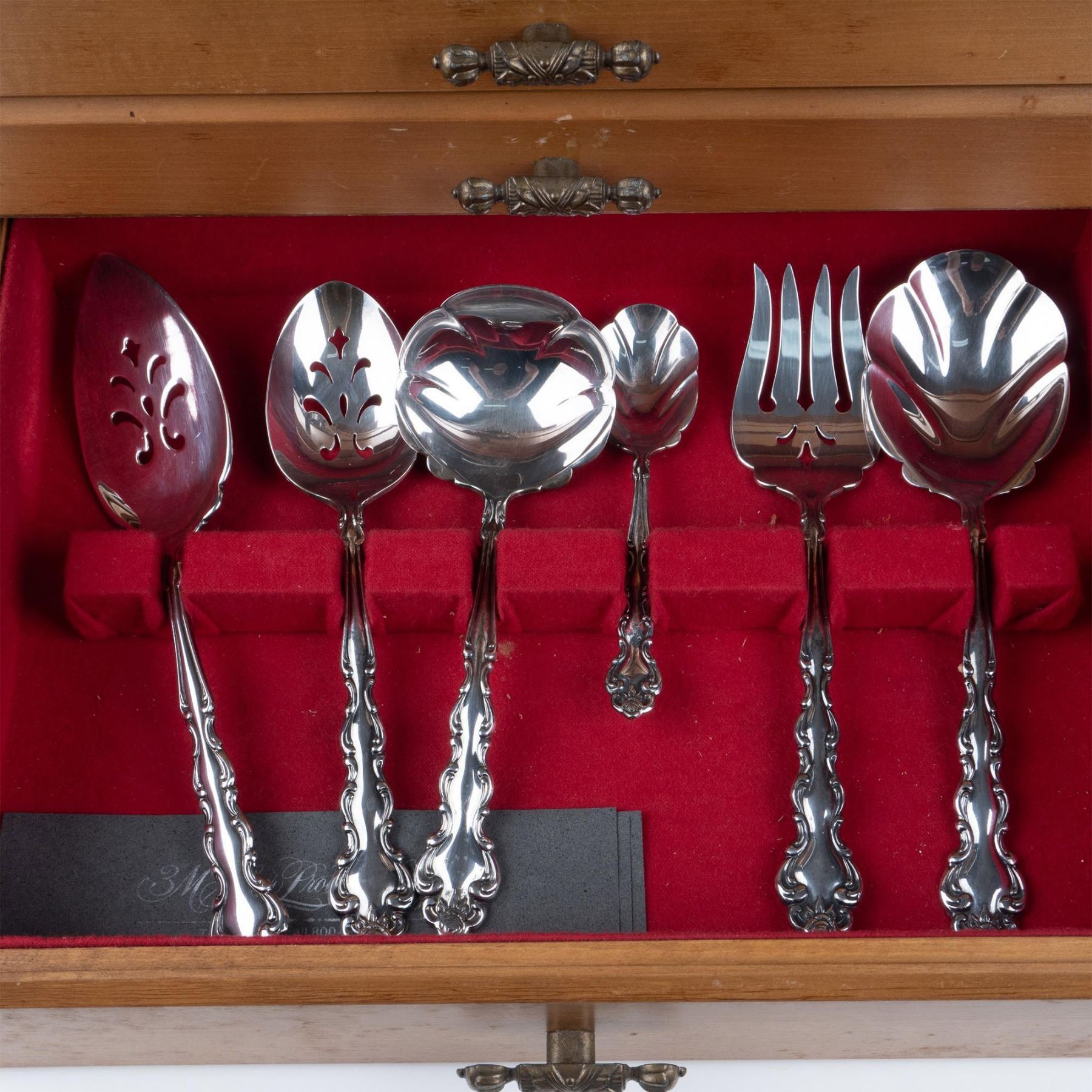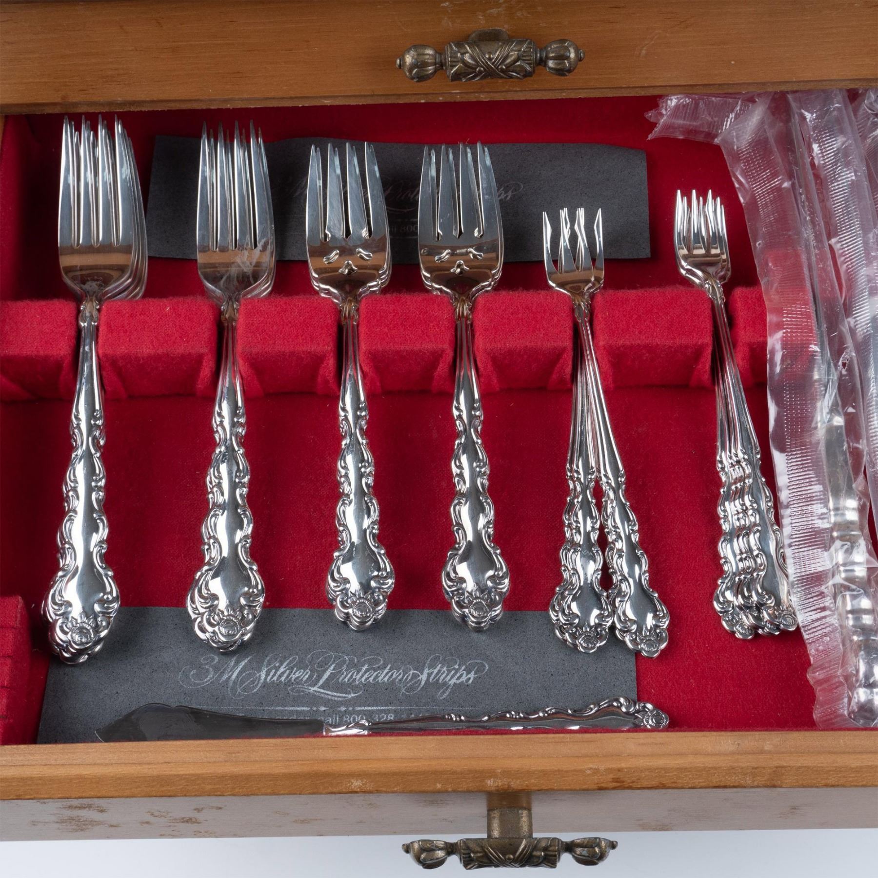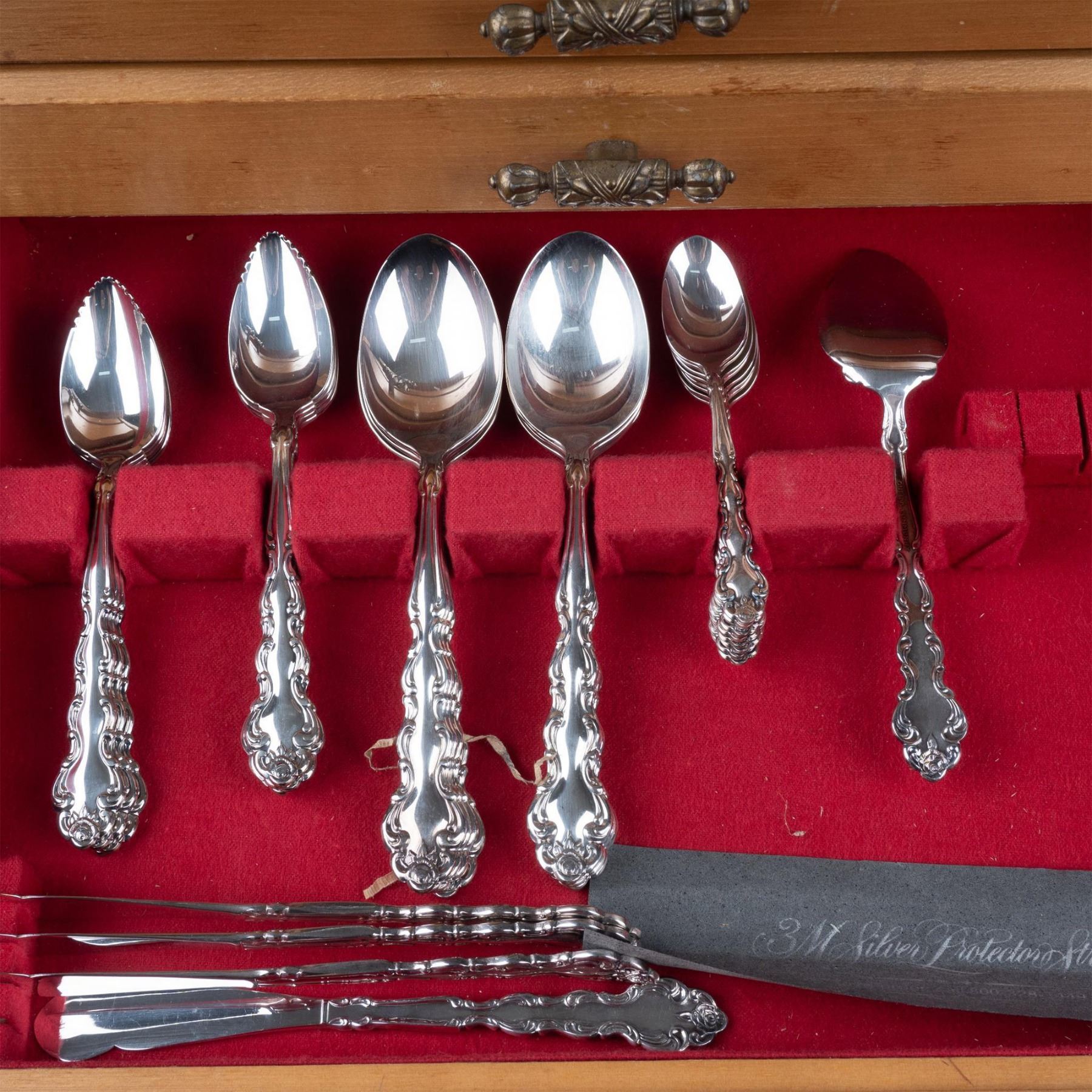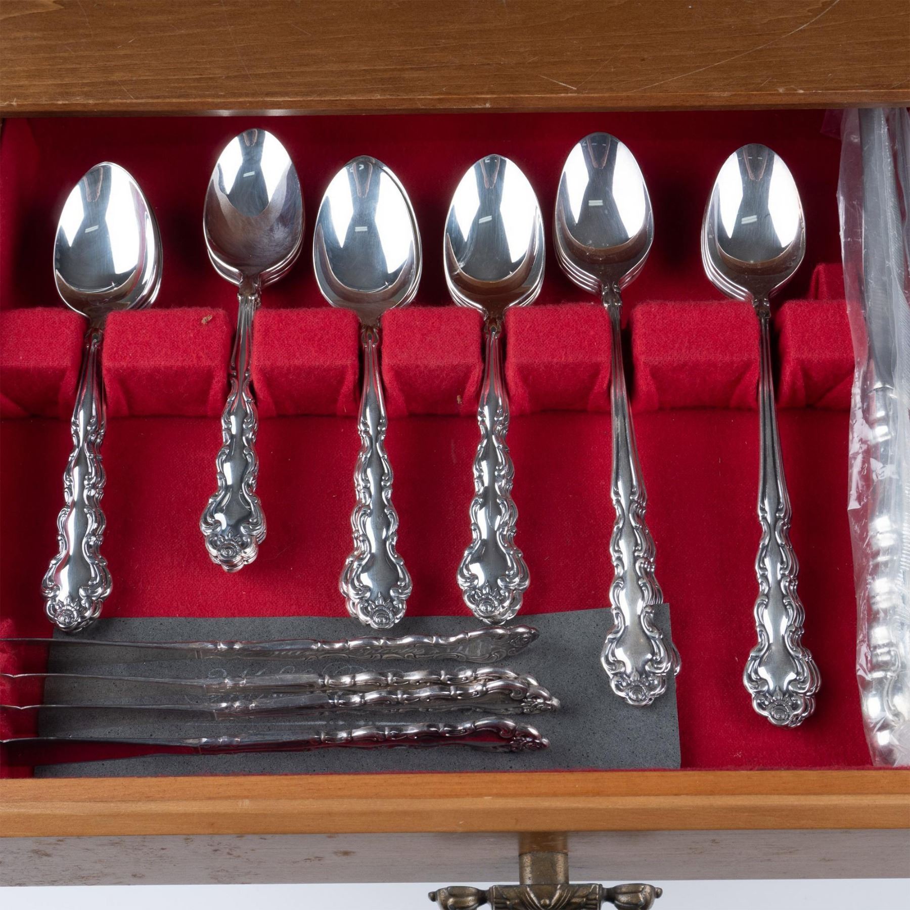 Large collection of various utensils consisting of: 1 Butter serving knife (6.75"L x 0.75"W), 1 pierced spoon ( 8.75"L x 1.75"W), 1 pie server (9.75"L x 2.25"W), 1 gravy ladle (8"L x 2.75"W), 1 jelly spoon (5.75"L x 1.5"W), 1 meat fork (9"L x 2"W), 1 sugar shell (9"L x 2.75"W), 8 iced tea spoons (7.5"L x 1.25"W), 8 butter knives (6.5"L x 1"W), 8 knives (9"L x 1"W), 8 seafood cocktail forks (6"L x 0.75"W), 8 salad forks (7"L x 1.25"W), 8 forks (7.5"L x 1"W), 8 demitasse spoons (4.5"L x 1.25"W), 8 spoons (7"L x 1.5"W) and 8 grapefruit spoon (6.25"L x 1.5"W). In the Daffodil pattern. Oneida Community backstamp. Includes silverware wood drawer with green red .Box measures: 15.75"L x 11.25"W x 10.25"H.