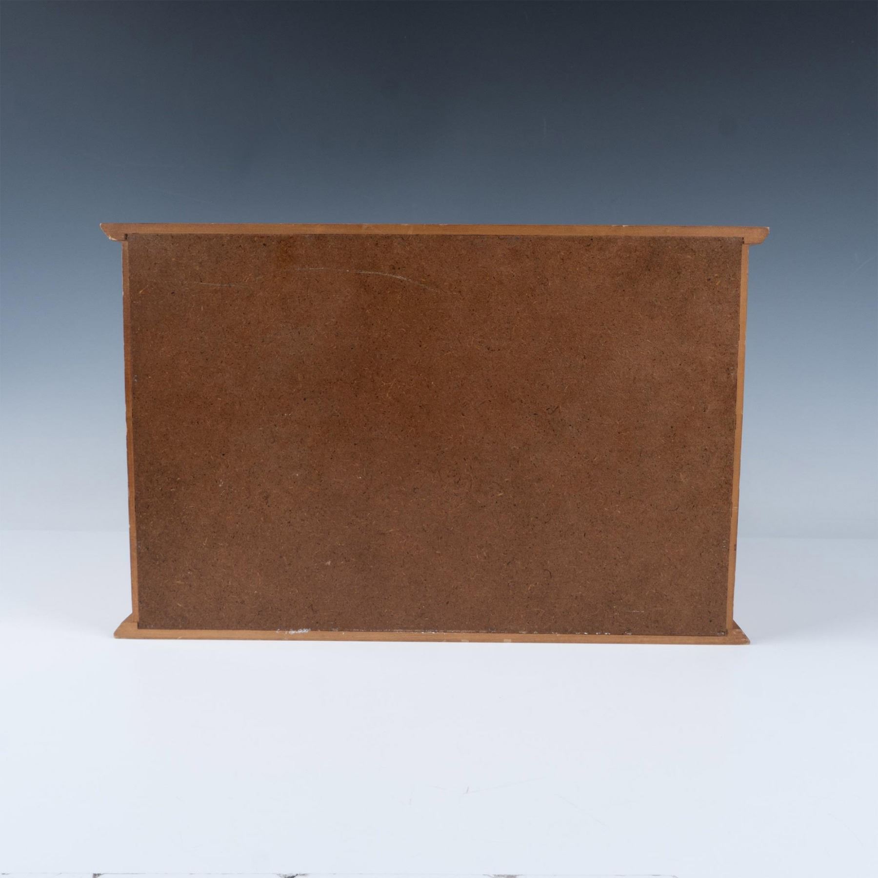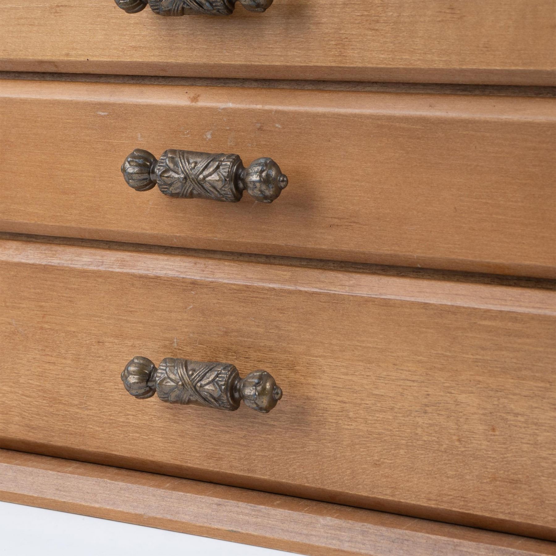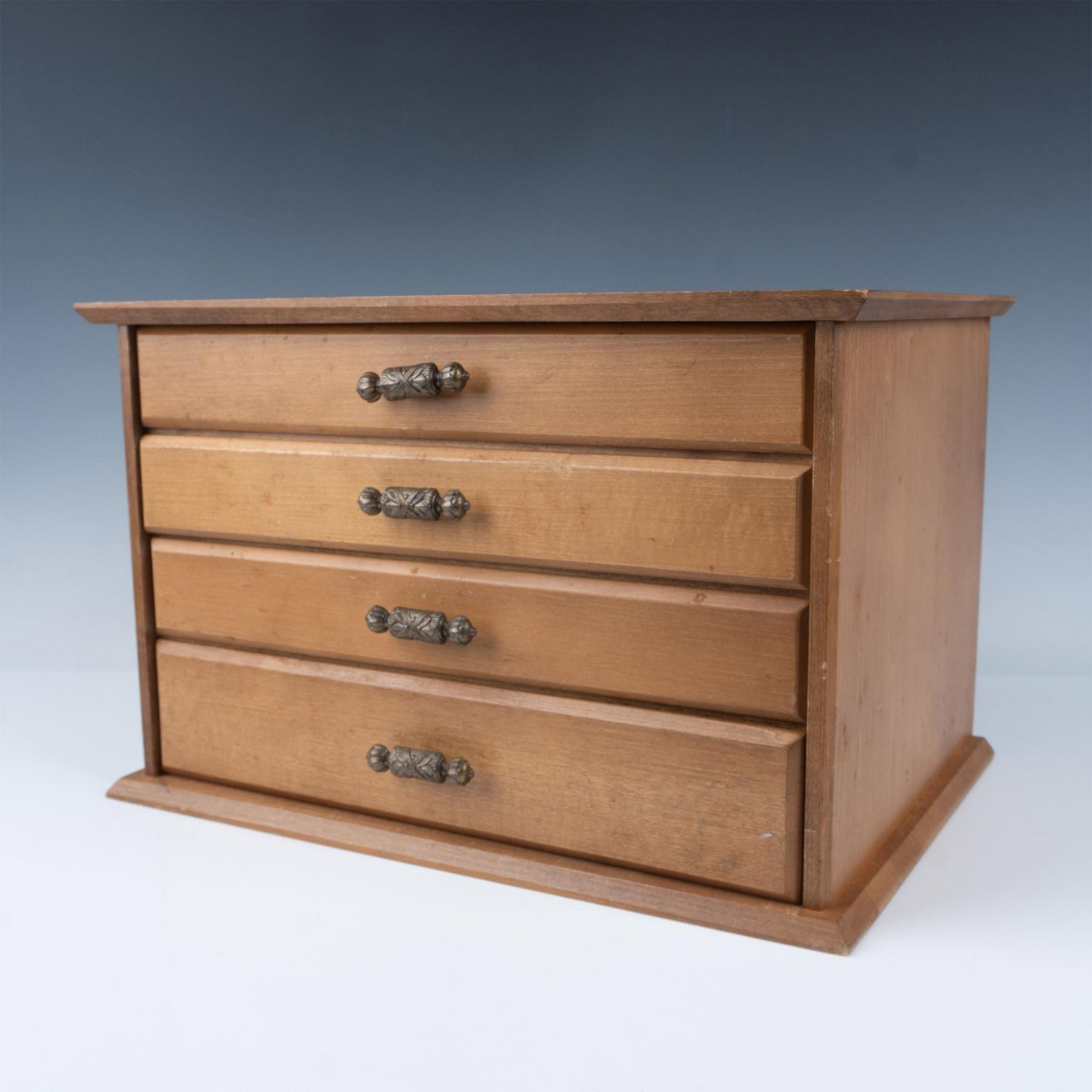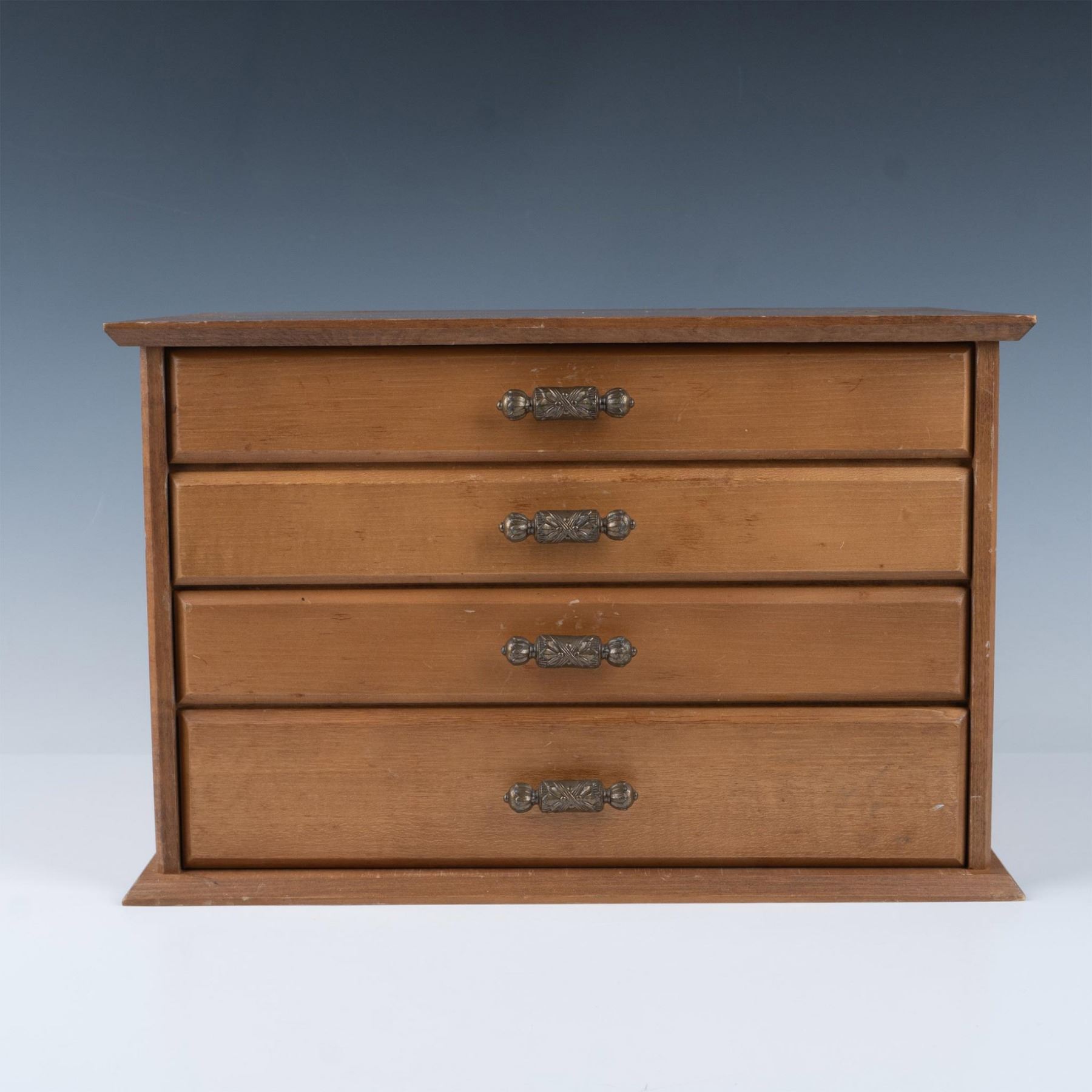 Large collection of various utensils consisting of: 1 Butter serving knife (6.75"L x 0.75"W), 1 pierced spoon ( 8.75"L x 1.75"W), 1 pie server (9.75"L x 2.25"W), 1 gravy ladle (8"L x 2.75"W), 1 jelly spoon (5.75"L x 1.5"W), 1 meat fork (9"L x 2"W), 1 sugar shell (9"L x 2.75"W), 8 iced tea spoons (7.5"L x 1.25"W), 8 butter knives (6.5"L x 1"W), 8 knives (9"L x 1"W), 8 seafood cocktail forks (6"L x 0.75"W), 8 salad forks (7"L x 1.25"W), 8 forks (7.5"L x 1"W), 8 demitasse spoons (4.5"L x 1.25"W), 8 spoons (7"L x 1.5"W) and 8 grapefruit spoon (6.25"L x 1.5"W). In the Daffodil pattern. Oneida Community backstamp. Includes silverware wood drawer with green red .Box measures: 15.75"L x 11.25"W x 10.25"H.