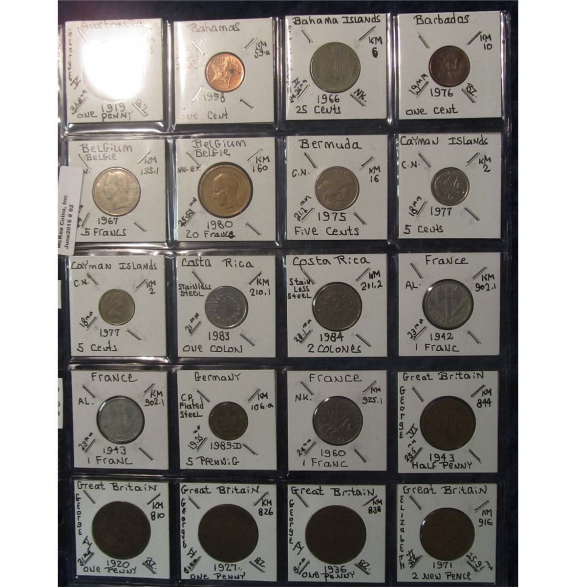 92. (20) World Coins in a Plastic Page identified with KM No., Metal size, & etc. All different. Includes: Australia, Bahamas, Barbados, Belgium, Bermuda, Cayman Islands, Costa Rica, France, & Great Britain. KM Value on this group is $12.30.