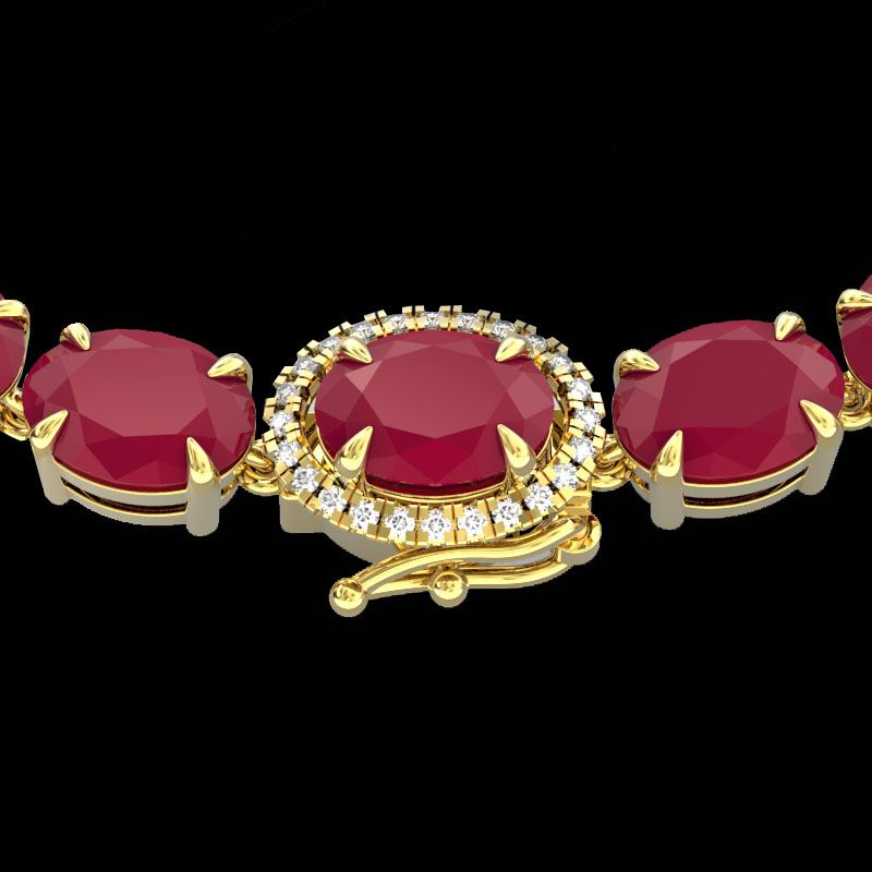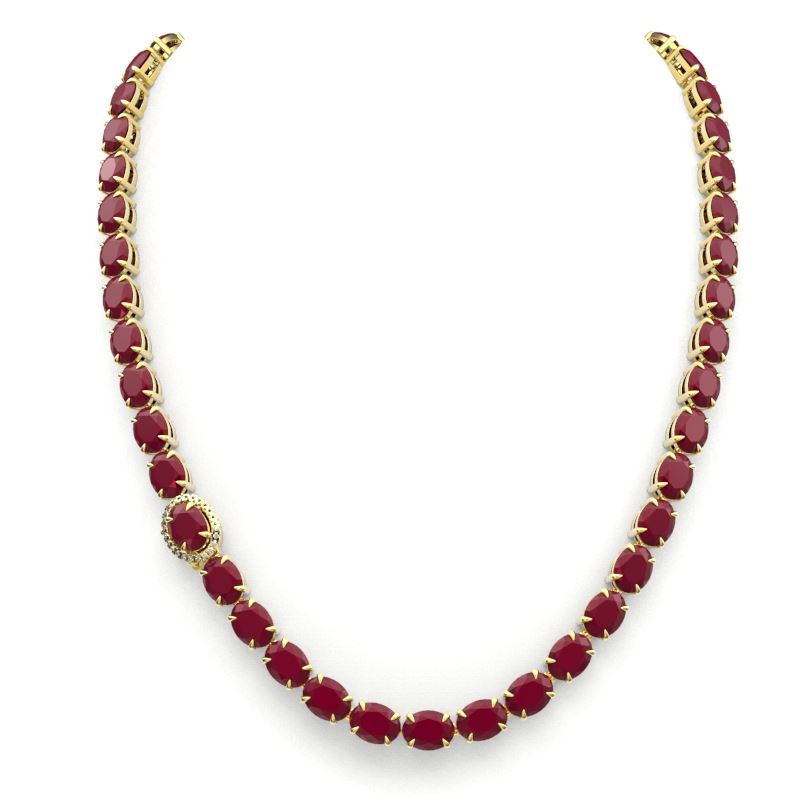 REF-527W3F -23476 ---- 92 CTW Ruby & VS/SI Diamond Eternity Tennis Micro Halo Necklace 14K Yellow Gold ---- Luxury Designer Brand Necklace Appraised at $40,600 Certificate Number US23476 14k Yellow gold, Necklace Size is 16 Incehs, Necklace measuring approx. 10 mm x 16 INCHES, weighing in total approx. 25 grams. Made in the USA and is stamped 14k, Main stone 91.75 carat total weight containing 43 pieces of Mid-Opaque-Deep Red color with AAA quality Oval shape cut Ruby , Stone #2 0.25 carat total weight containing 24 pieces of H-I color with VS/SI quality Round shape cut Diamond