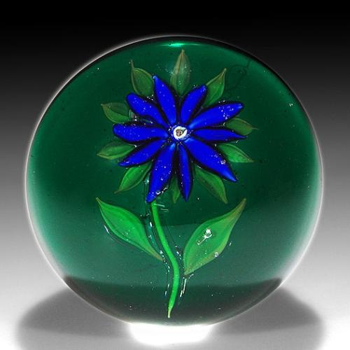 Harry A. Cooper blue flower paperweight. The single blossom, with ten cobalt blue petals and a halo of radiating green leaves, grows on a stem with two additional green leaves, over translucent dark green ground. Signed. Diameter 2 5/8". NO RESERVE