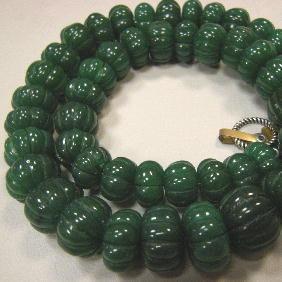 GRADUATED ENHANCED GLASS FILLED CARVED EMERALD STRAND. IT WEIGHTS 920 CTS. RONDELLES MEASURE BETWEEN 18 AND 13 MM. LENGTH: 18 INCHES. TEMPORARY SILVER PLATED CLASP.