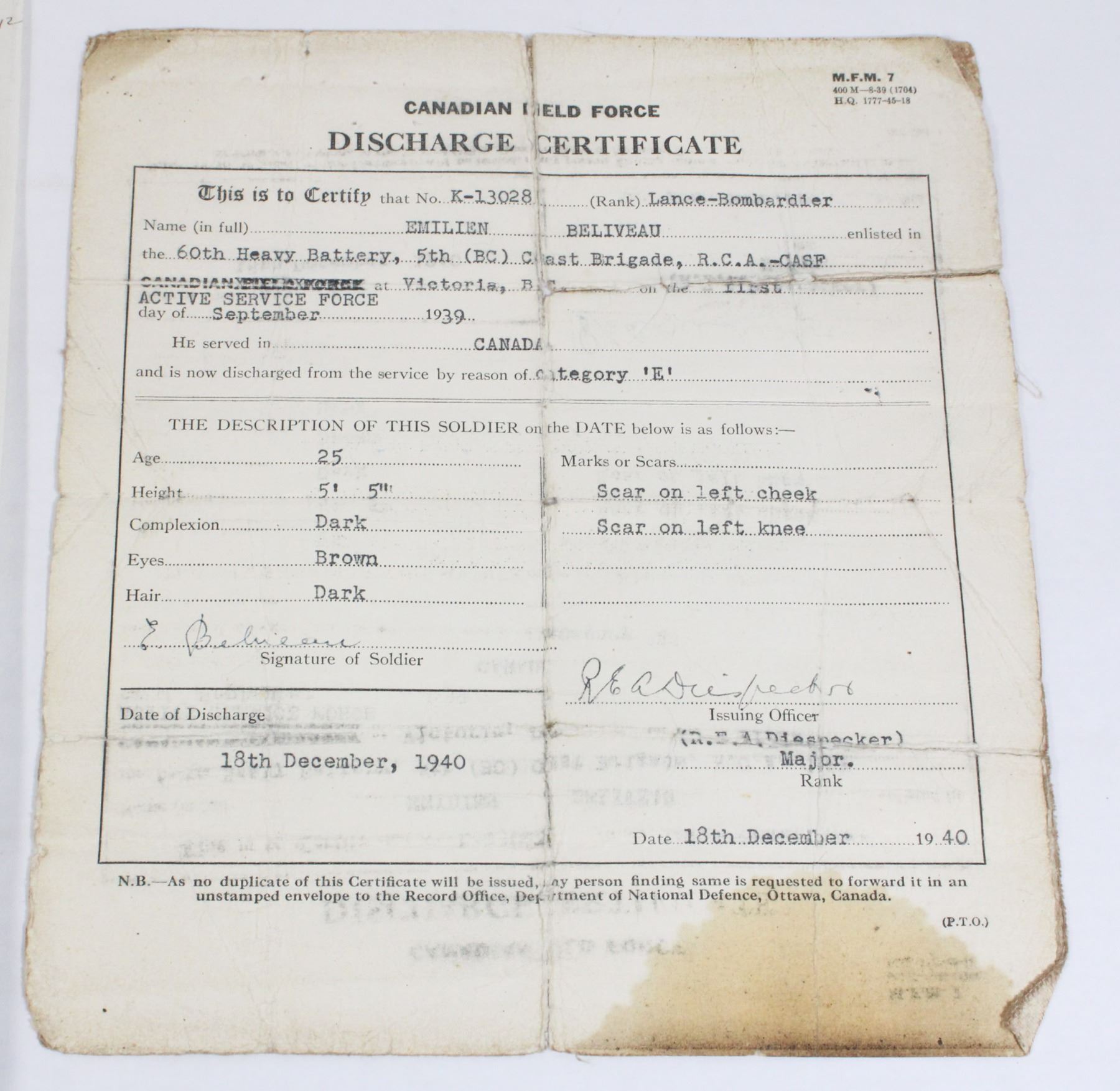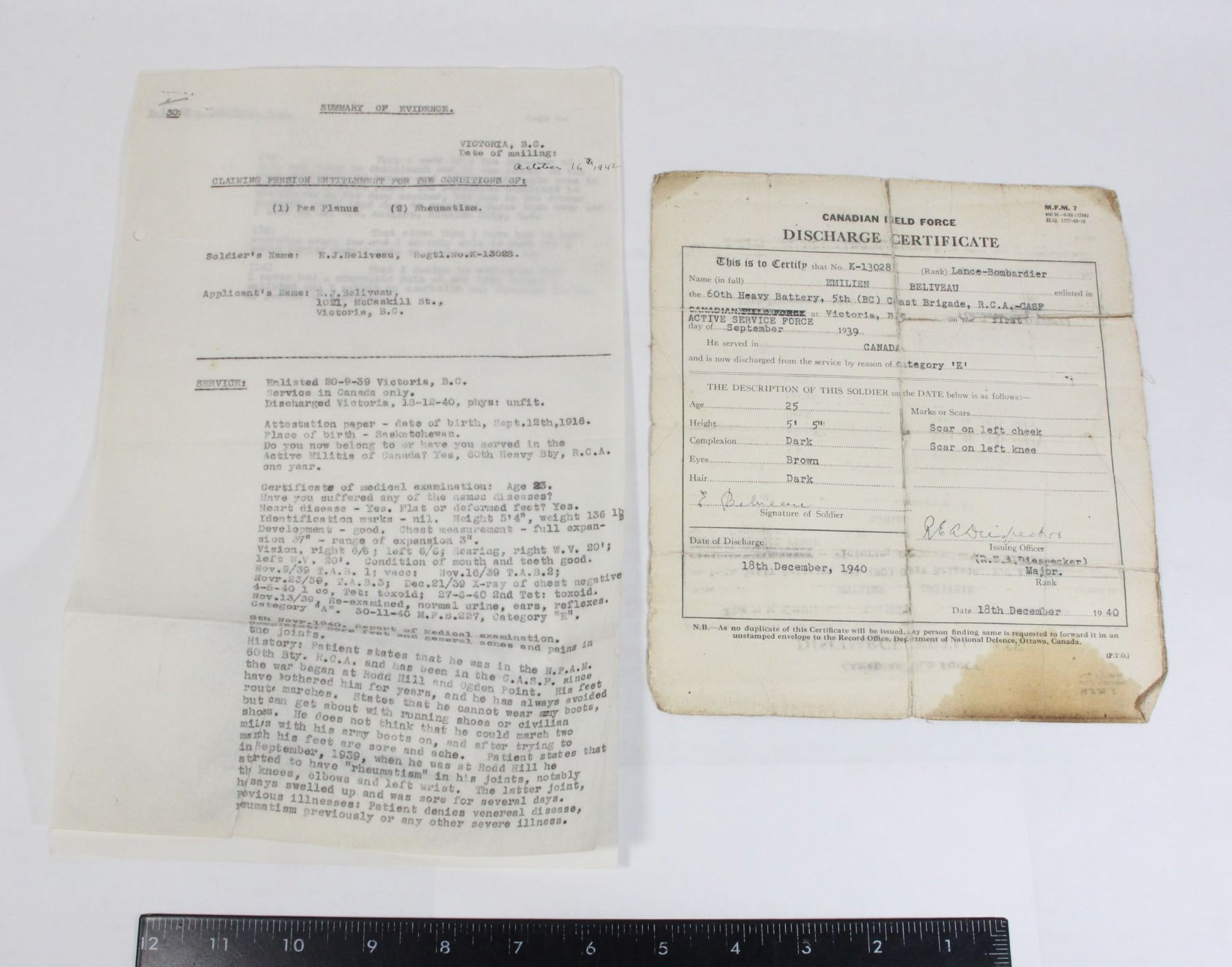 SUMMARY OF EVIDENCE DOCUMENT, NAMED TO 5TH (BC)COAST BRIGADE R.C.A.- CASF ROYAL CANADIAN ARTILLERY