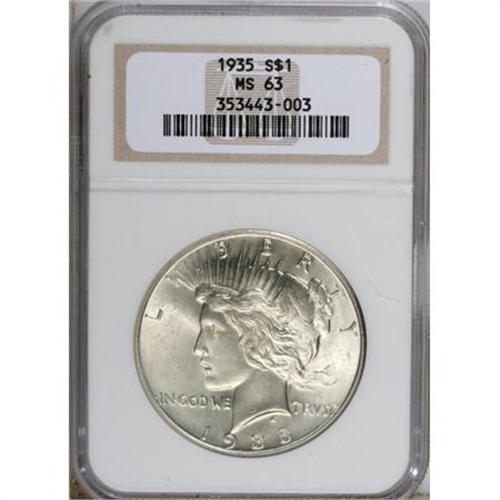 <!-- BEGIN: ICOLLECTOR - EBAY LOT HTML CODE --><style type='text/css'> #icoll_images_thumbnails, #icoll_images_mainimage, #icoll_otherlots { display: none; } div { font-family: arial, verdana, helvetica; } img { border: none; } .icoll_heading_title { background-color: #EFEFFF; color: #000; font-family: arial, verdana, helvetica; font-size: 12pt; font-style: normal; font-weight: bold; } </style><style type='text/css'>@import url(http://www.icollector.com/css/ebay/ebaylot_20070703.css);</style><script language='javascript' type='text/javascript'>function icollfunc_getelement(element_id) { var tmpelement = null; if(document.getElementById) tmpelement = document.getElementById(element_id); if(tmpelement == null) tmpelement = document[element_id]; return tmpelement; }var icollvar_mainpic = null; function icollfunc_initimages() { icollfunc_getelement('mainPicture').style.display = 'none'; icollvar_mainpic = icollfunc_getelement('icoll_images_mainimage'); var body_onload = document.body.attributes['onload']; document.body.setAttribute('onload', (body_onload ? body_onload.nodeValue : '') + 'icollfunc_fixoperaimgbug();'); }function icollfunc_changeimage(imgurl) { if(icollvar_mainpic != null) icollvar_mainpic.src = imgurl; }function icollfunc_fixoperaimgbug() { if(window.opera) { var imgobjs = icollfunc_getelement('icoll_images_thumbnails').getElementsByTagName('img'); for(var i=0; i<imgobjs.length; i++) { var w = imgobjs[i].clientWidth; if(w > 0) imgobjs[i].style.width = w + 'px'; } } }</script><script language='javascript' type='text/javascript'> var useragent = escape(navigator.userAgent); var appname = escape(navigator.appName); var dateobj = new Date(); var datetime = escape(dateobj.getFullYear()+'-'+(dateobj.getMonth()+1)+'-'+dateobj.getDate()+' '+dateobj.getHours()+':'+dateobj.getMinutes()); var referrer = ''; if(document.referrer && document.referrer != null) referrer = escape(document.referrer); new Image().src = 'http://www.icollector.com/stats/ebaylot.ashx?id=7140531&ua='+useragent+'&an='+appname+'&dt='+datetime+'&tz='+dateobj.getTimezoneOffset()+'&re='+referrer;</script><div id='icoll_images'><div id='icoll_images_prev'><a href='http://cgi.liveauctions.ebay.com/ws/eBayISAPI.dll?ViewItem&item=170135059769'><img src='http://www.ha.com/common/proxyImage.php?ebay=445-62002-1-75' alt='' /><img src='http://icollector.com/graphics/ebay_leftarrow.gif' alt='' class='arrow' /></a><div id='icoll_images_prev_info'>Prev Lot</div></div><div id='icoll_images_next'><a href='http://cgi.liveauctions.ebay.com/ws/eBayISAPI.dll?ViewItem&item=170135059783'><img src='http://www.ha.com/common/proxyImage.php?ebay=445-2076-1-75' alt='' /><img src='http://icollector.com/graphics/ebay_rightarrow.gif' alt='' class='arrow' /></a><div id='icoll_images_next_info'>Next Lot</div></div><div id='icoll_images_thumbnails'><a href='http://www.ha.com/common/proxyImage.php?ebay=445-1563-1-75' target='_blank' onmouseover="icollfunc_changeimage('http://www.ha.com/common/proxyImage.php?ebay=445-1563-1-75');"><img src='http://www.ha.com/common/proxyImage.php?ebay=445-1563-1-75' alt='' /></a><a href='http://www.ha.com/common/proxyImage.php?ebay=445-1563-2-75' target='_blank' onmouseover="icollfunc_changeimage('http://www.ha.com/common/proxyImage.php?ebay=445-1563-2-75');"><img src='http://www.ha.com/common/proxyImage.php?ebay=445-1563-2-75' alt='' /></a><div id='icoll_images_thumbnails_info'>Hover thumbnail to view large image below. Click thumbnail to view full image in new window.</div></div><div id='icoll_images_mainimage_container'><img id='icoll_images_mainimage' alt='' src='http://www.ha.com/common/proxyImage.php?ebay=445-1563-1-75'></div></div><script language='javascript' type='text/javascript'>icollfunc_initimages();</script><div id='icoll_description'><B>1935 $1 MS63 NGC.</B></I> NGC Census: (1153/2185). PCGS Population (1743/2415). Mintage: 1,576,000. Numismedia Wsl. Price for NGC/PCGS coin in MS63: $84. (#7378)<BR><BR><B>Coin Engraver:</B> Anthony de Francisci<BR><BR><b>Shipping:</b> Coins & Currency (<a target="_blank" href="http://www.heritageauctions.com/common/shipping.php">view shipping information</a>\)</div><div id='icoll_notices'><div class='icoll_heading_left'></div><div class='icoll_heading'><div class='icoll_heading_title'>Notices</div></div><div class='icoll_heading_right'></div><div id='icoll_notices_info'><B>Important notice:</B> Heritage usually auctions material at the rate of 200-250 lots per hour. On some occasions eBay Live bid software or the Internet may not be able to keep up with the pace of the auction. We recommend placing a realistic absentee bid now as insurance to avoid disappointment. Occasionally the auctioneer may eliminate or reject an eBay Live bid, and the auctioneer may also reopen a lot after the close of the eBay live bidding (usually because we missed an audience bid), and may reject your bid even if it shows you as the winning bidder. By bidding via eBay Live, you agree that Heritage may award the lot to another bidder at its sole discretion under the circumstances described above or any other reasonable circumstances. Since eBay bids are not shown to us until we open the lot on the floor, we treat those bids just like floor bids. In most cases the floor responds before the eBay bid is presented to us, due to Internet lag time, so for consistency we have made it a policy that floor bids are always considered first over tie eBay live bids. Also please note that all Heritage lots purchased through eBay Live carry a 20% Buyer's Premium with a $9 minimum Buyer's Premium. Please make sure you read the Terms and Conditions before you bid. This lot is being auctioned in conjunction with a live floor auction by Heritage Auctions. All final auction and invoice information will be supplied by Heritage Auctions, and all other information should be considered preliminary. <BR><BR><B>Winning Notification and Billing:</B> After the FINAL session in this auction is complete, Heritage will send e