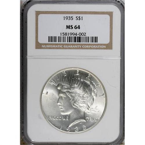 <!-- BEGIN: ICOLLECTOR - EBAY LOT HTML CODE --><style type='text/css'> #icoll_images_thumbnails, #icoll_images_mainimage, #icoll_otherlots { display: none; } div { font-family: arial, verdana, helvetica; } img { border: none; } .icoll_heading_title { background-color: #EFEFFF; color: #000; font-family: arial, verdana, helvetica; font-size: 12pt; font-style: normal; font-weight: bold; } </style><style type='text/css'>@import url(http://www.icollector.com/css/ebay/ebaylot_20070703.css);</style><script language='javascript' type='text/javascript'>function icollfunc_getelement(element_id) { var tmpelement = null; if(document.getElementById) tmpelement = document.getElementById(element_id); if(tmpelement == null) tmpelement = document[element_id]; return tmpelement; }var icollvar_mainpic = null; function icollfunc_initimages() { icollfunc_getelement('mainPicture').style.display = 'none'; icollvar_mainpic = icollfunc_getelement('icoll_images_mainimage'); var body_onload = document.body.attributes['onload']; document.body.setAttribute('onload', (body_onload ? body_onload.nodeValue : '') + 'icollfunc_fixoperaimgbug();'); }function icollfunc_changeimage(imgurl) { if(icollvar_mainpic != null) icollvar_mainpic.src = imgurl; }function icollfunc_fixoperaimgbug() { if(window.opera) { var imgobjs = icollfunc_getelement('icoll_images_thumbnails').getElementsByTagName('img'); for(var i=0; i<imgobjs.length; i++) { var w = imgobjs[i].clientWidth; if(w > 0) imgobjs[i].style.width = w + 'px'; } } }</script><script language='javascript' type='text/javascript'> var useragent = escape(navigator.userAgent); var appname = escape(navigator.appName); var dateobj = new Date(); var datetime = escape(dateobj.getFullYear()+'-'+(dateobj.getMonth()+1)+'-'+dateobj.getDate()+' '+dateobj.getHours()+':'+dateobj.getMinutes()); var referrer = ''; if(document.referrer && document.referrer != null) referrer = escape(document.referrer); new Image().src = 'http://www.icollector.com/stats/ebaylot.ashx?id=7140532&ua='+useragent+'&an='+appname+'&dt='+datetime+'&tz='+dateobj.getTimezoneOffset()+'&re='+referrer;</script><div id='icoll_images'><div id='icoll_images_prev'><a href='http://cgi.liveauctions.ebay.com/ws/eBayISAPI.dll?ViewItem&item=170135059780'><img src='http://www.ha.com/common/proxyImage.php?ebay=445-1563-1-75' alt='' /><img src='http://icollector.com/graphics/ebay_leftarrow.gif' alt='' class='arrow' /></a><div id='icoll_images_prev_info'>Prev Lot</div></div><div id='icoll_images_next'><a href='http://cgi.liveauctions.ebay.com/ws/eBayISAPI.dll?ViewItem&item=170135059793'><img src='http://www.ha.com/common/proxyImage.php?ebay=445-122004-1-75' alt='' /><img src='http://icollector.com/graphics/ebay_rightarrow.gif' alt='' class='arrow' /></a><div id='icoll_images_next_info'>Next Lot</div></div><div id='icoll_images_thumbnails'><a href='http://www.ha.com/common/proxyImage.php?ebay=445-2076-1-75' target='_blank' onmouseover="icollfunc_changeimage('http://www.ha.com/common/proxyImage.php?ebay=445-2076-1-75');"><img src='http://www.ha.com/common/proxyImage.php?ebay=445-2076-1-75' alt='' /></a><a href='http://www.ha.com/common/proxyImage.php?ebay=445-2076-2-75' target='_blank' onmouseover="icollfunc_changeimage('http://www.ha.com/common/proxyImage.php?ebay=445-2076-2-75');"><img src='http://www.ha.com/common/proxyImage.php?ebay=445-2076-2-75' alt='' /></a><div id='icoll_images_thumbnails_info'>Hover thumbnail to view large image below. Click thumbnail to view full image in new window.</div></div><div id='icoll_images_mainimage_container'><img id='icoll_images_mainimage' alt='' src='http://www.ha.com/common/proxyImage.php?ebay=445-2076-1-75'></div></div><script language='javascript' type='text/javascript'>icollfunc_initimages();</script><div id='icoll_description'><B>1935 $1 MS64 NGC.</B></I> NGC Census: (1524/658). PCGS Population (1673/740). Mintage: 1,576,000. Numismedia Wsl. Price for NGC/PCGS coin in MS64: $154. (#7378)<BR><BR><B>Coin Engraver:</B> Anthony de Francisci<BR><BR><b>Shipping:</b> Coins & Currency (<a target="_blank" href="http://www.heritageauctions.com/common/shipping.php">view shipping information</a>\)</div><div id='icoll_notices'><div class='icoll_heading_left'></div><div class='icoll_heading'><div class='icoll_heading_title'>Notices</div></div><div class='icoll_heading_right'></div><div id='icoll_notices_info'><B>Important notice:</B> Heritage usually auctions material at the rate of 200-250 lots per hour. On some occasions eBay Live bid software or the Internet may not be able to keep up with the pace of the auction. We recommend placing a realistic absentee bid now as insurance to avoid disappointment. Occasionally the auctioneer may eliminate or reject an eBay Live bid, and the auctioneer may also reopen a lot after the close of the eBay live bidding (usually because we missed an audience bid), and may reject your bid even if it shows you as the winning bidder. By bidding via eBay Live, you agree that Heritage may award the lot to another bidder at its sole discretion under the circumstances described above or any other reasonable circumstances. Since eBay bids are not shown to us until we open the lot on the floor, we treat those bids just like floor bids. In most cases the floor responds before the eBay bid is presented to us, due to Internet lag time, so for consistency we have made it a policy that floor bids are always considered first over tie eBay live bids. Also please note that all Heritage lots purchased through eBay Live carry a 20% Buyer's Premium with a $9 minimum Buyer's Premium. Please make sure you read the Terms and Conditions before you bid. This lot is being auctioned in conjunction with a live floor auction by Heritage Auctions. All final auction and invoice information will be supplied by Heritage Auctions, and all other information should be considered preliminary. <BR><BR><B>Winning Notification and Billing:</B> After the FINAL session in this auction is complete, Heritage will send e